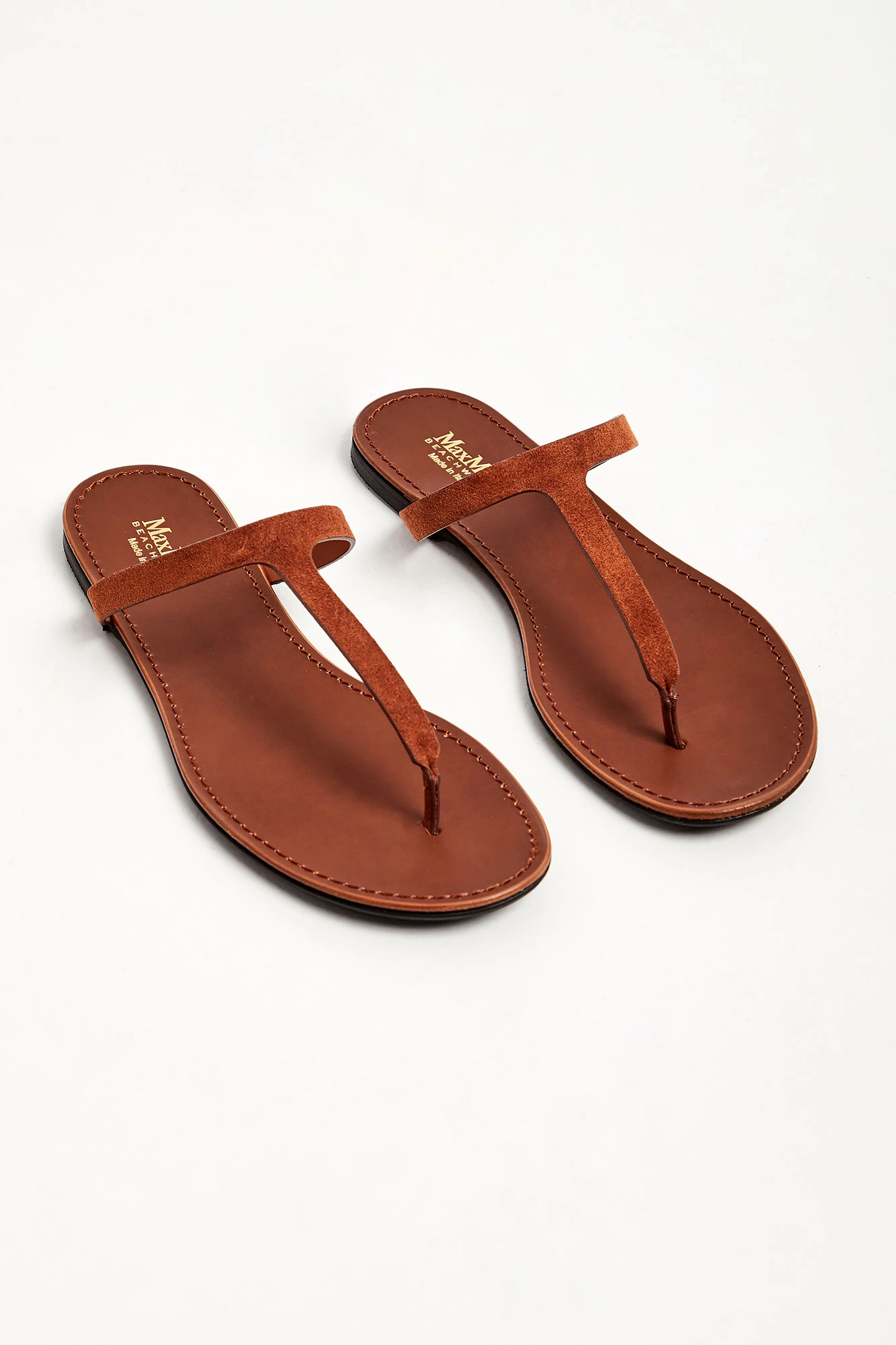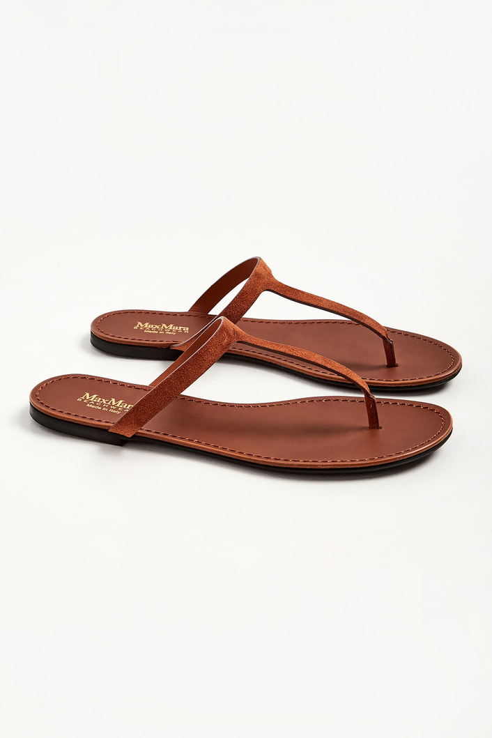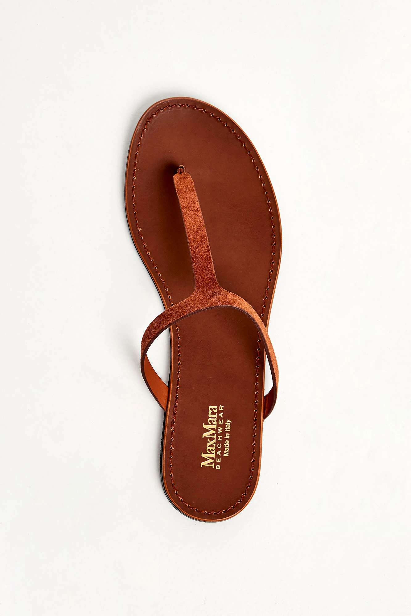 Japonki marki Max Mara Beachwear w brązowym kolorze. Odkryte palce. Z przodu cienkie paski. Wyściółka sygnowana. Wykonane z naturalnej skóry.