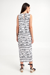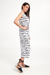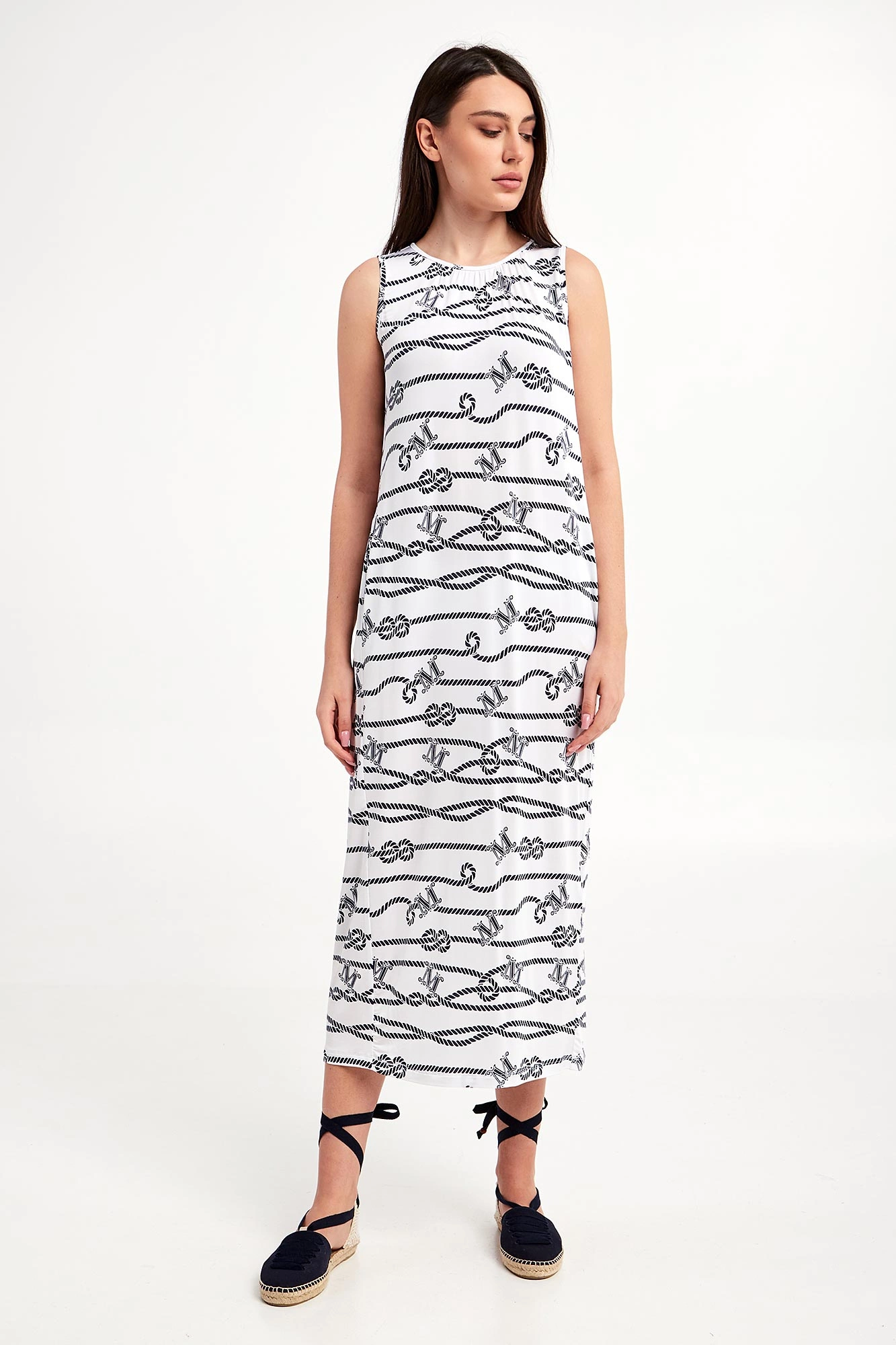 Sukienka marki Max Mara Beachwear w białym kolorze. Fason typu regular fit. Na całości granatowy wzór z monogramem marki i marynistycznym motywem. Bez rękawów. Dekolt typu o-neck zakończony niewielkim ściągaczem. Dół wykończony lamówką. Z tyłu zapinana na guzik. Wykonana z elastycznej wiskozy.