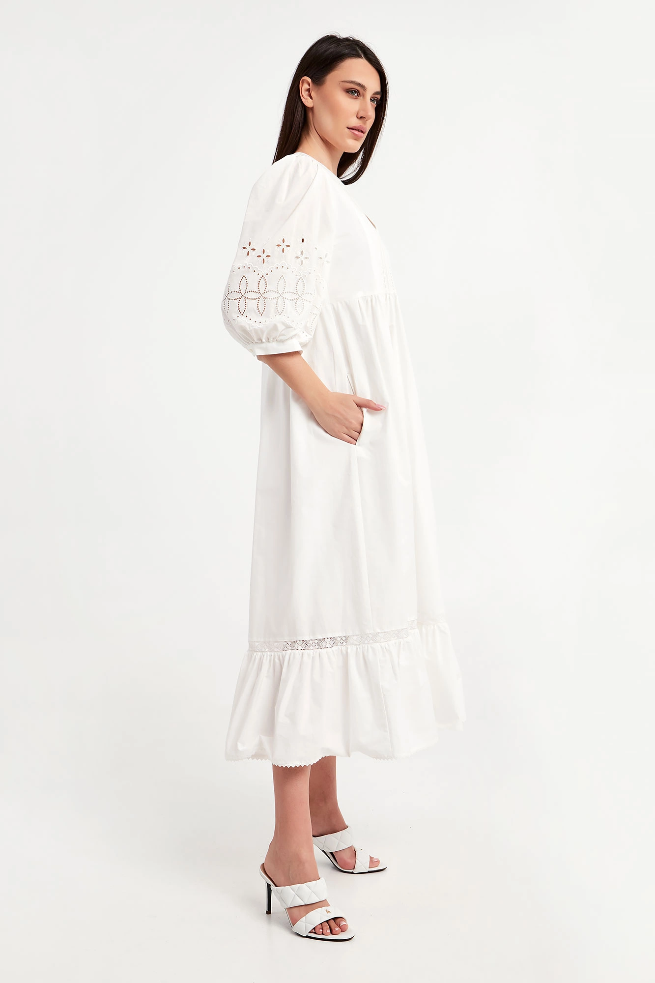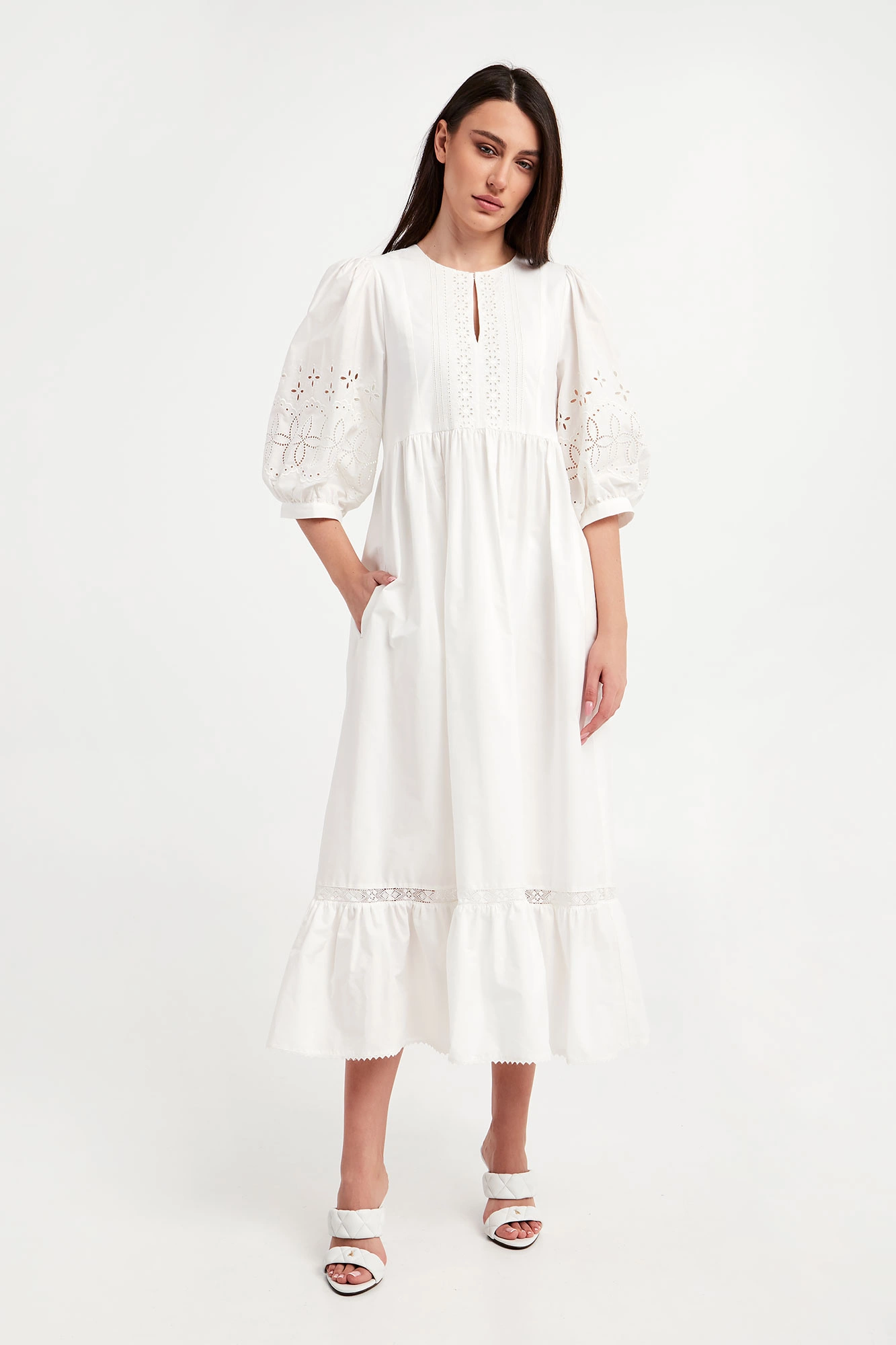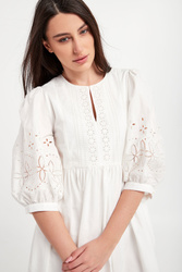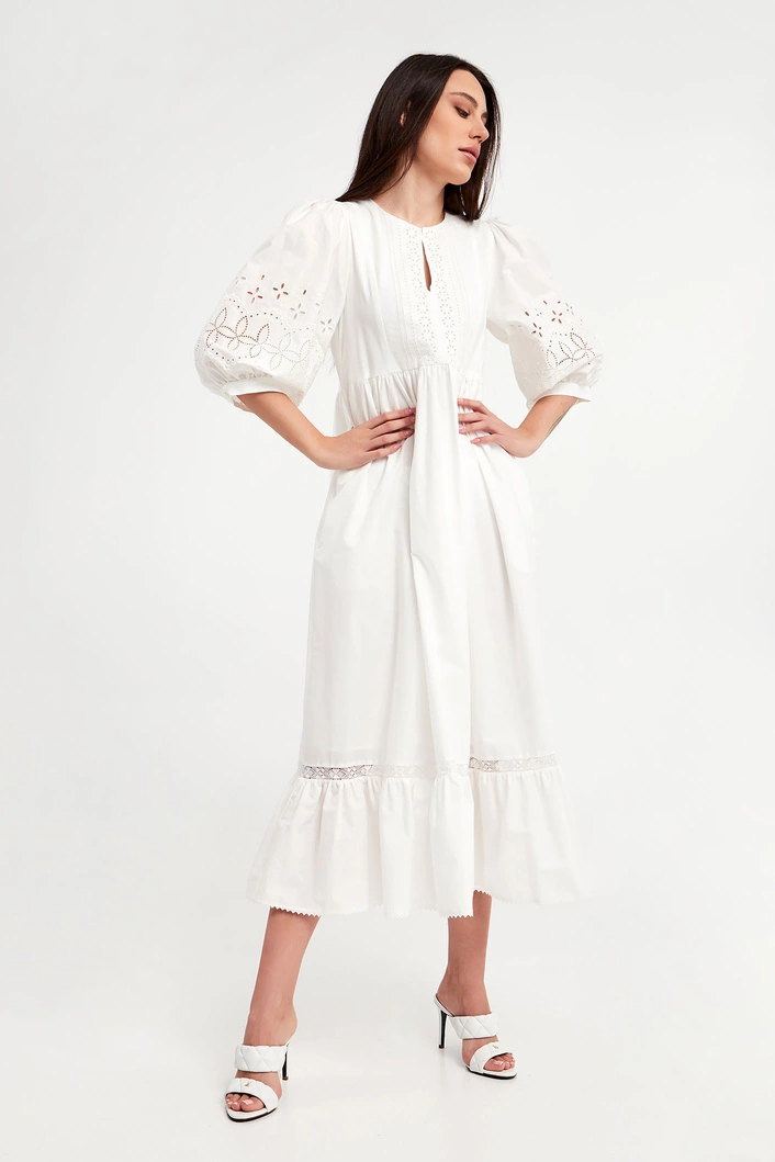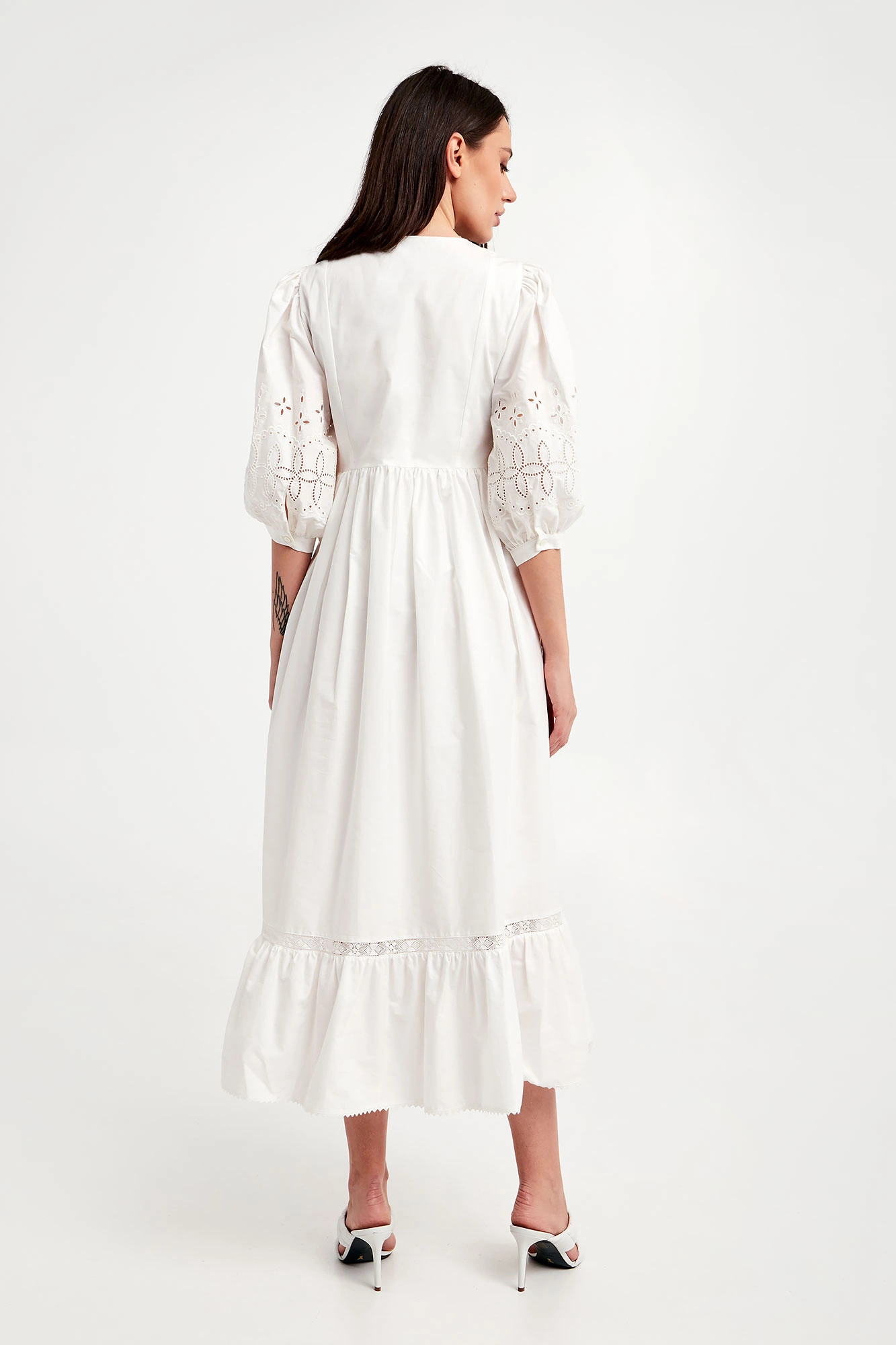 Sukienka marki Weekend Max Mara w białym kolorze. Fason typu regular o długości midi. Dekolt typu v-neck ozdobiony haftem ażurowym. W talii marszczenia. Z boku zapinana na kryty zamek. Bufiaste rękawy ozdobione ażurowym haftem zakończone cienkimi mankietami zapinanymi na sygnowany guzik. Na dole pasek ażurowy wykonany z koronki oraz marszczona. Dół wykończony delikatnym haftem. W całości wykonana z tkaniny bawełnianej.