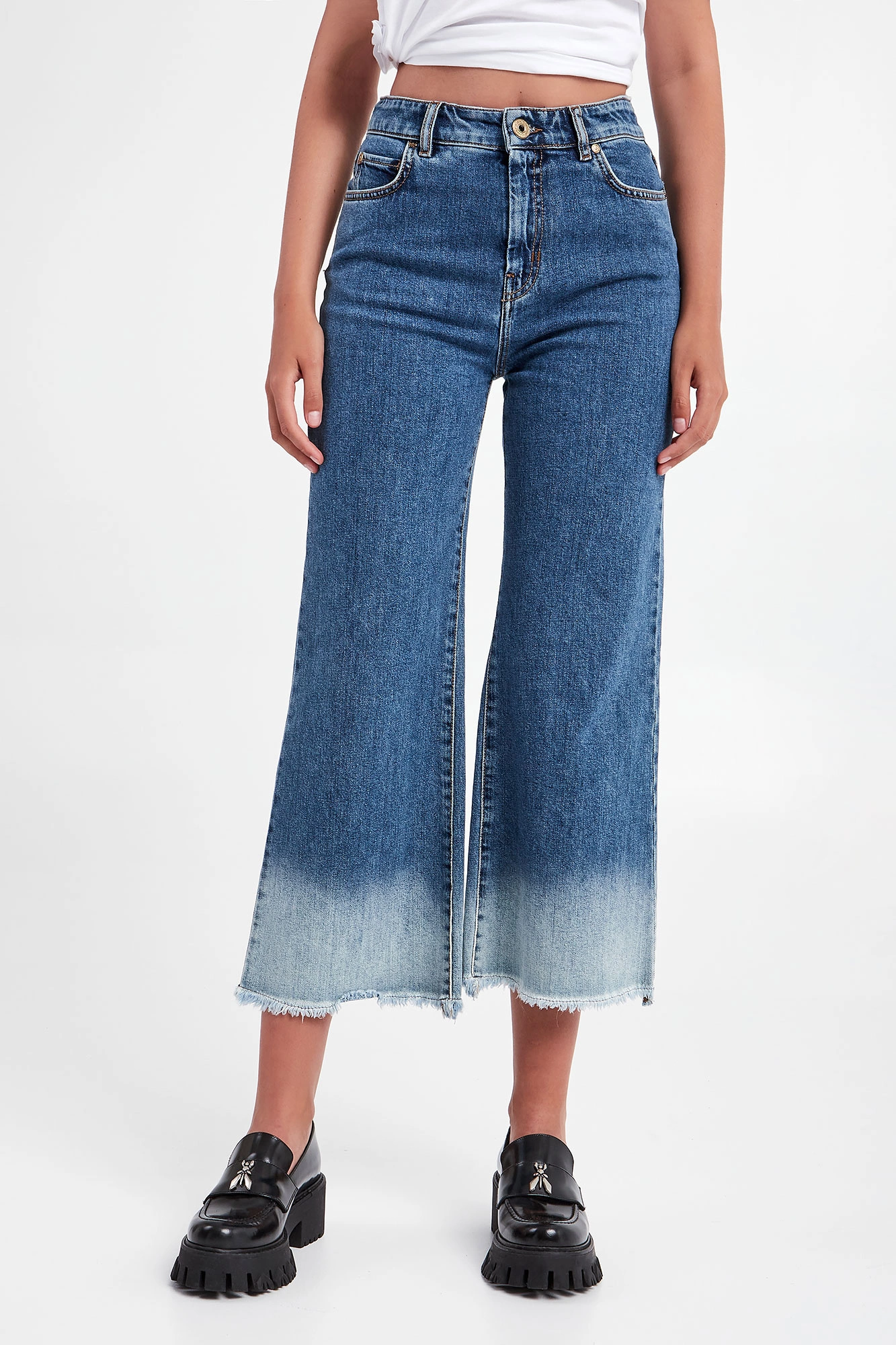 Jeansy marki Weekend Max Mara w kolorze niebieskim. Fason typu cullote, długość 7/8. Zapinane za pomocą sygnowanego guzika i zamka. Model z pięcioma kieszeniami. Nogawki wystrzępione u dołu, z efektem ombre. Jeansy wykonane z tkaniny bawełnianej z domieszką elastanu.