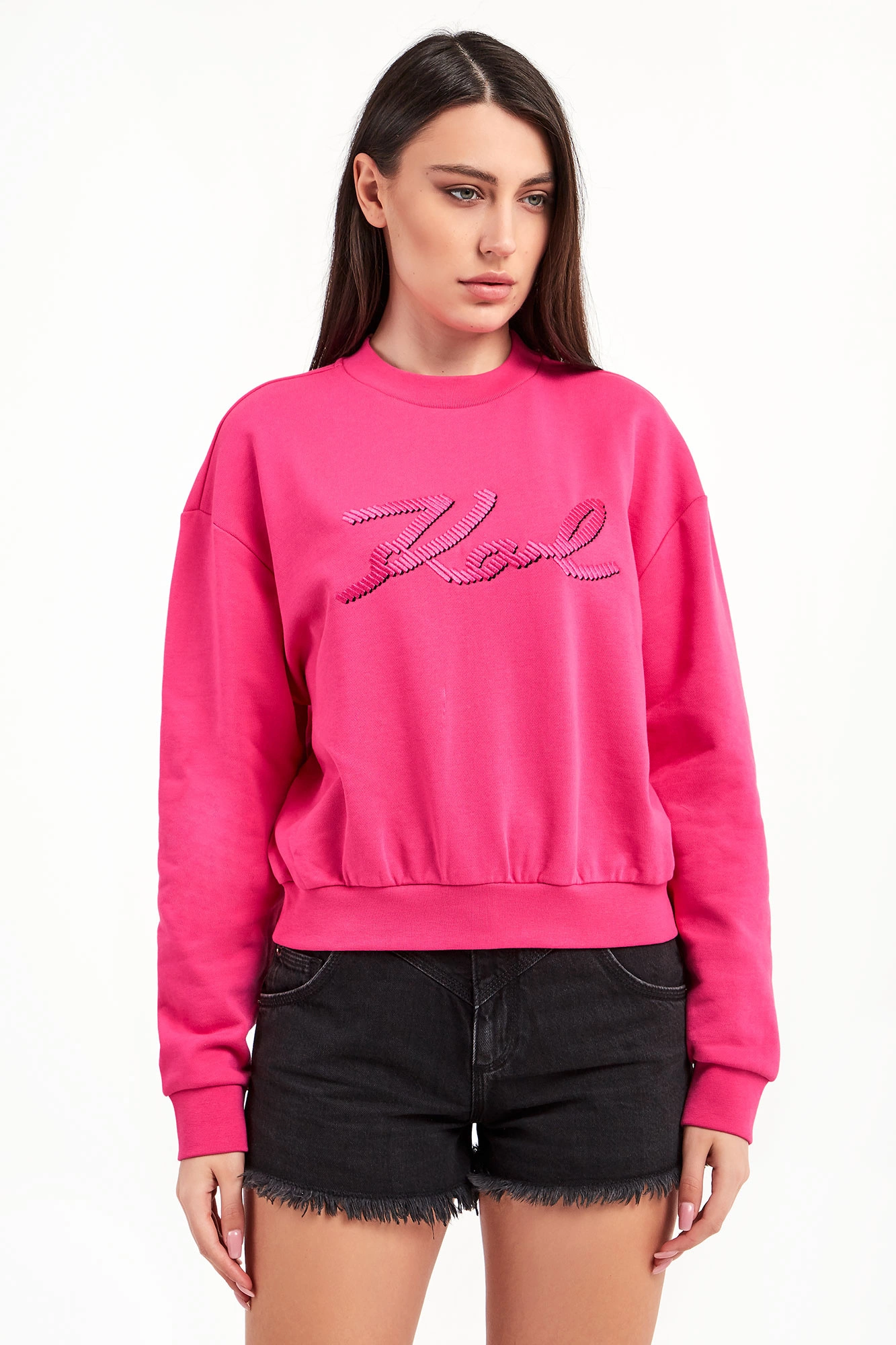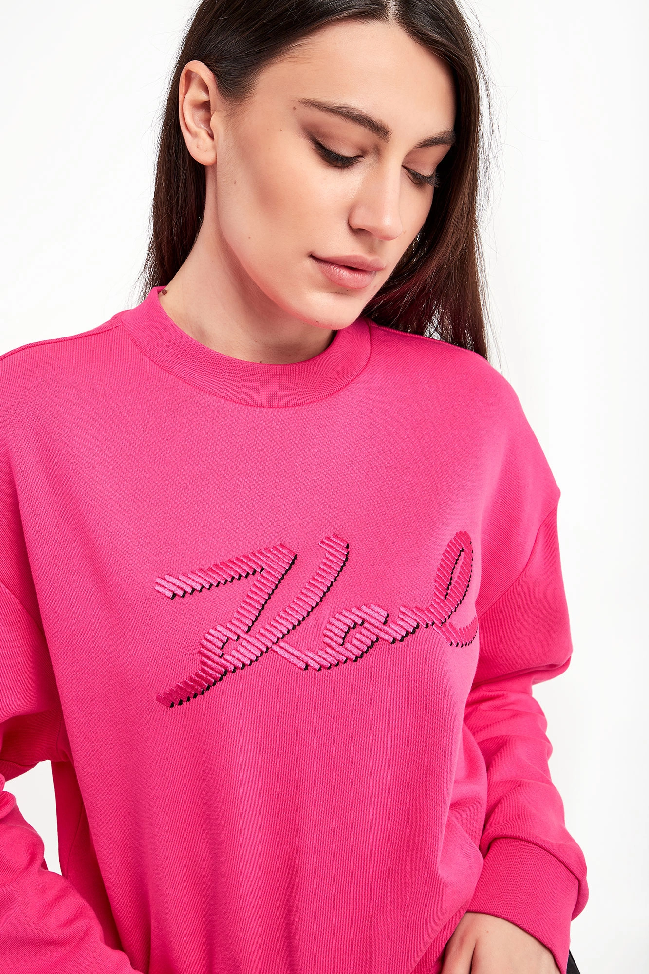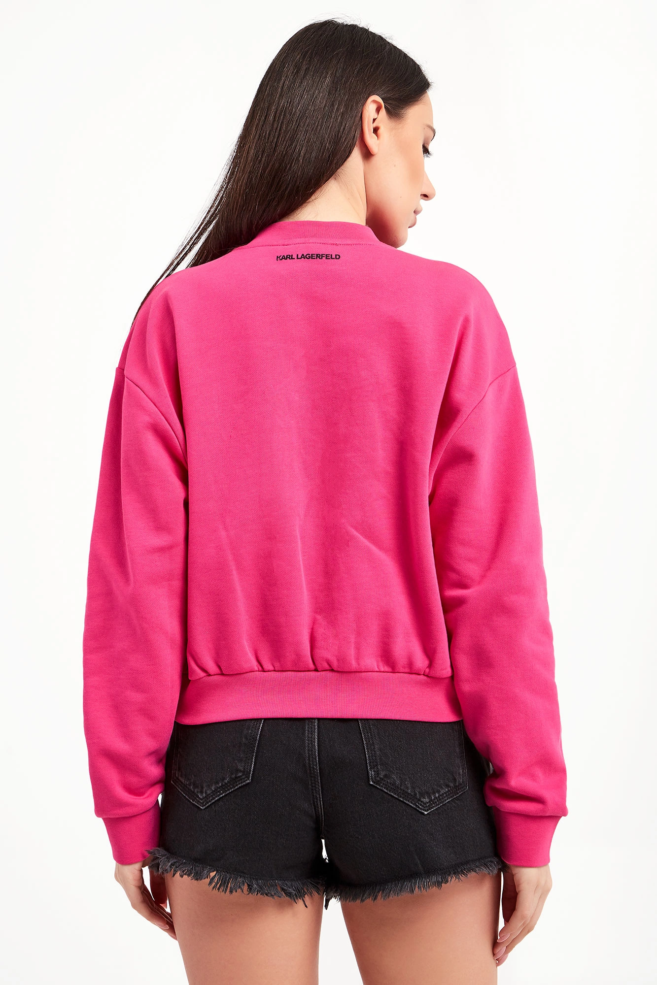 Bluza marki Karl Lagerfeld w różowym kolorze. Fason typu regular. Pochodzi z linii "Karl Cares", która wykorzystuje tkaniny pochodzące z recyklingu, by wspierać zrównoważoną modę. Okrągły dekolt typu o-neck, długie rękawy i dół wykończone elastycznym ściągaczem. Z przodu haft w postaci nazwy marki w różowym kolorze. Na linii karku niewielki nadruk z nazwą marki w kontrastowym czarnym kolorze. Wykonana z elastycznej, miękkiej bawełny.