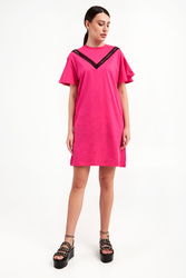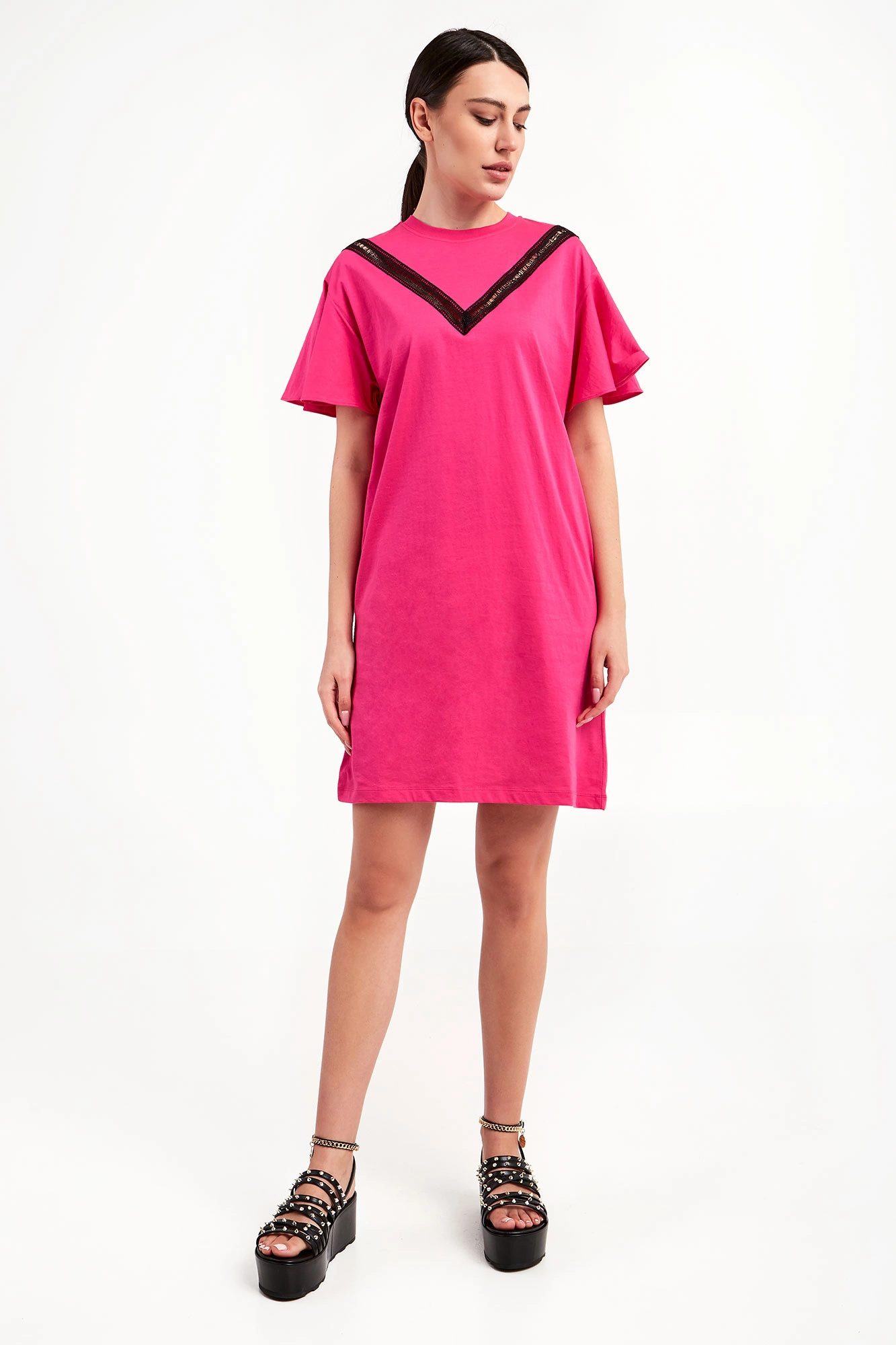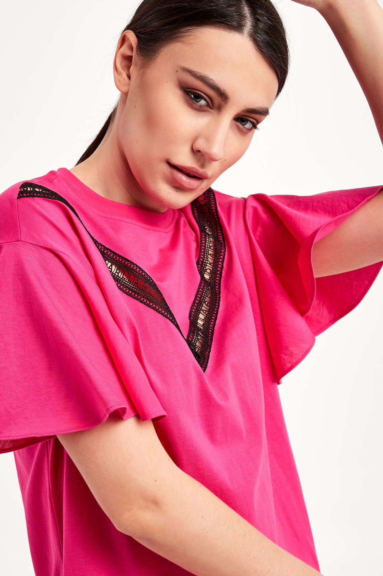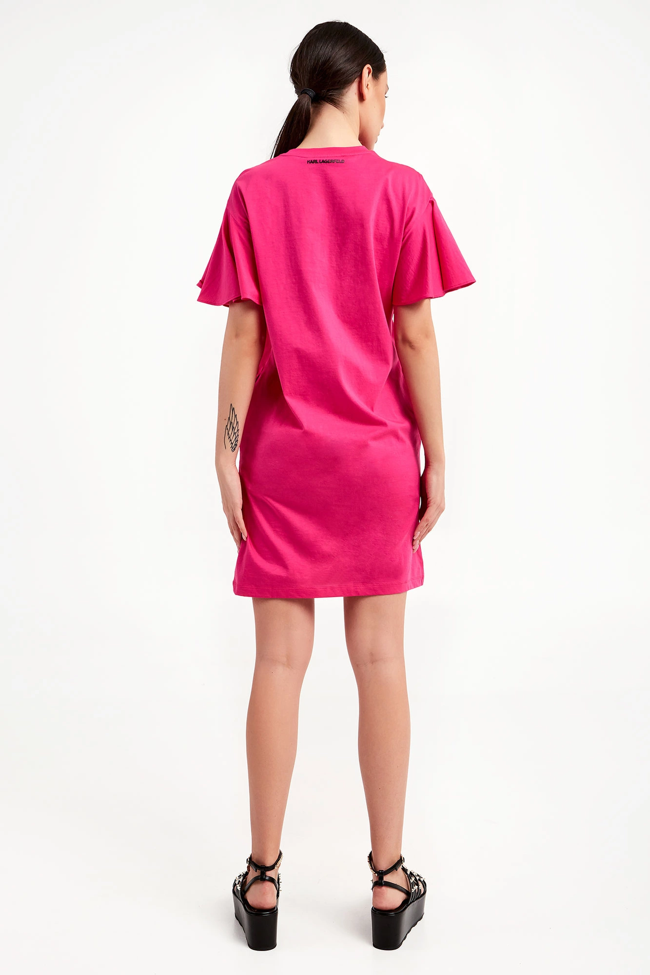 Sukienka marki Karl Lagerfeld w różowym kolorze. Fason typu regular fit. Pochodzi z linii "Karl Cares", która wykorzystuje tkaniny pochodzące z recyklingu, by wspierać zrównoważoną modę. Falbaniaste krótkie rękawki. Z przodu wstawka sygnowanej, ażurowej koronki w czarnym kolorze. Po bokach w szwach kieszenie. Długość mini. Z tyłu na linii karku nadruk w postaci nazwy marki w czarnym kolorze.