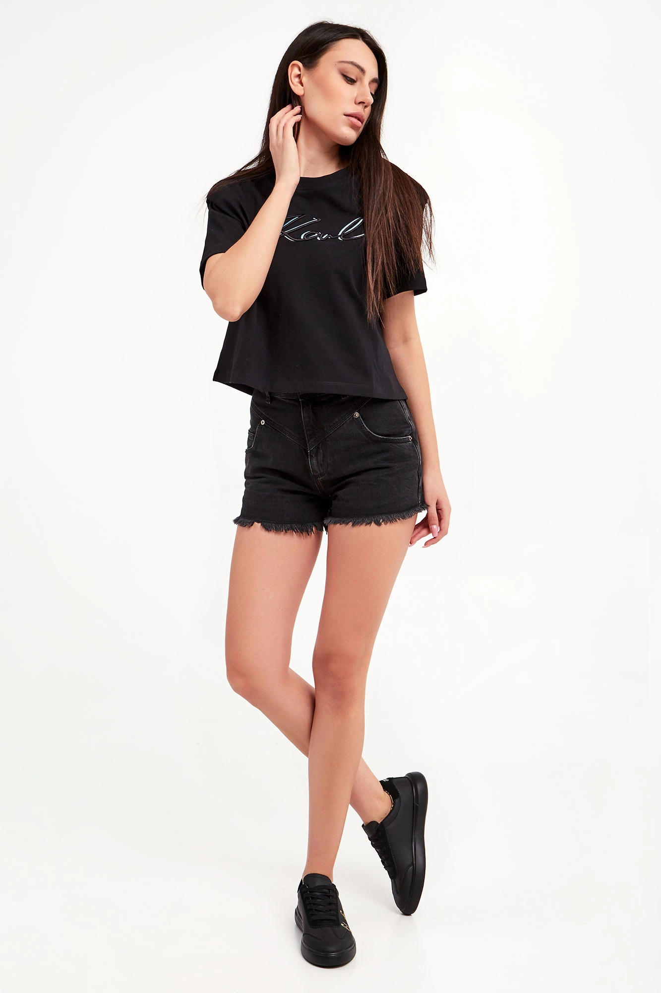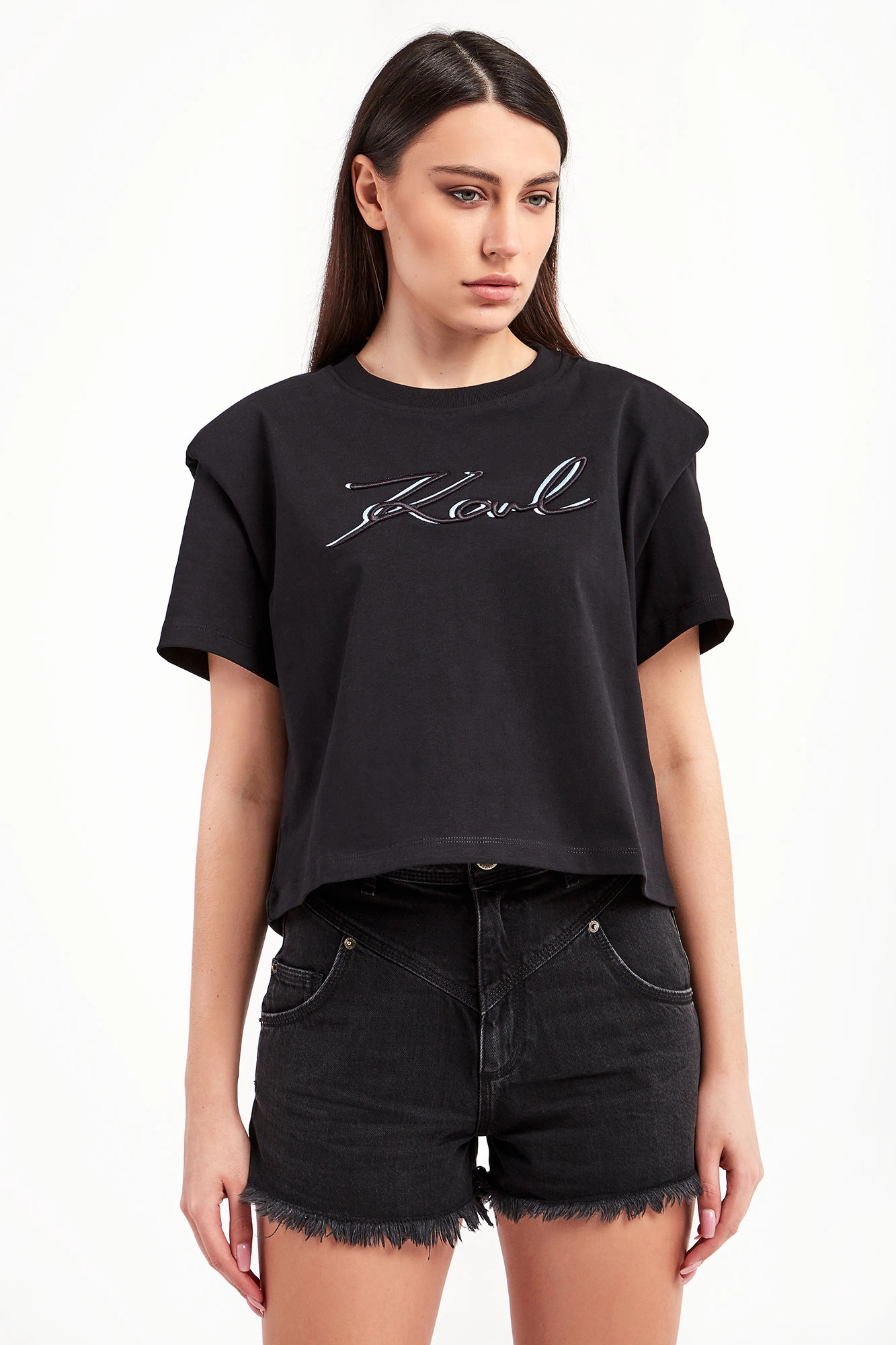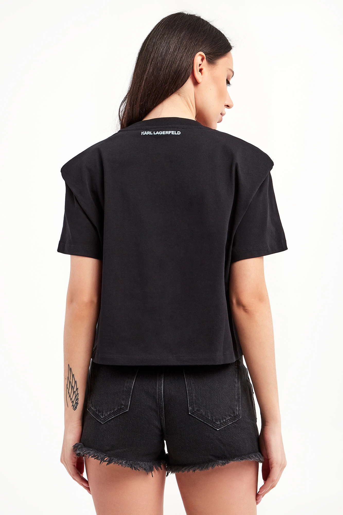 T-shirt marki Karl Lagerfeld w czarnym kolorze. Pochodzi z linii "Karl Cares", która wykorzystuje tkaniny pochodzące z recyklingu, by wspierać zrównoważoną modę. Nieco krótszy fason typu cropped. Z przodu czarno-błękitny haft w postaci nazwy marki. Dekolt typu o-neck wykończony ściągaczem prążkowanym. Dół i krótkie rękawki wykończone lamówką. W ramionach wszyte poduszki. Z tyłu na linii karku nadruk w postaci nazwy marki w błękitnym kolorze. Wykonany w całości z tkaniny bawełnianej.