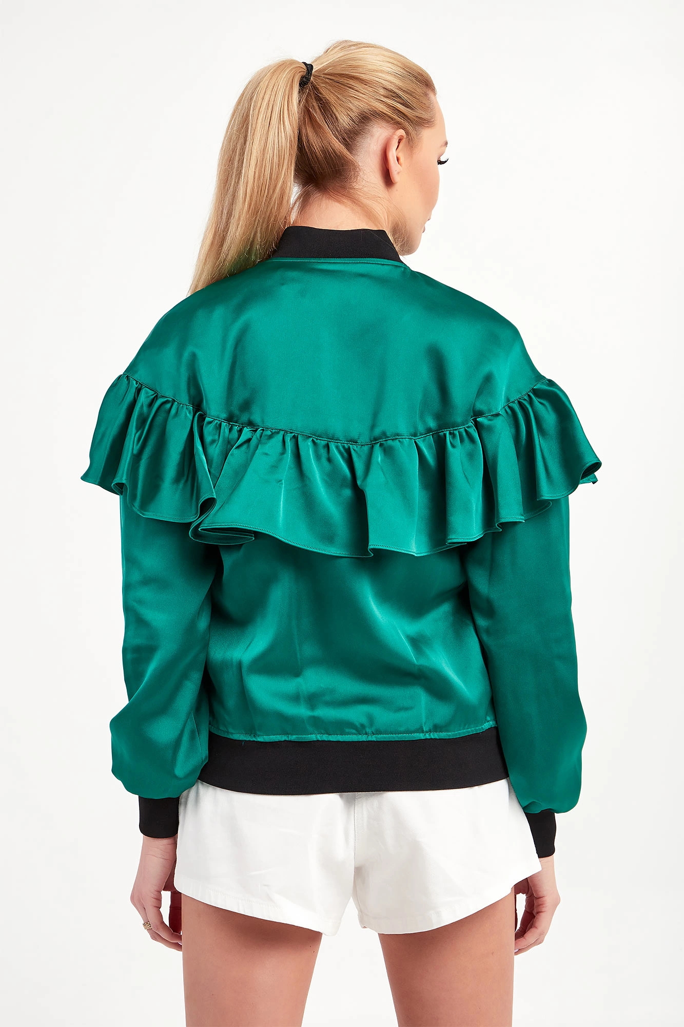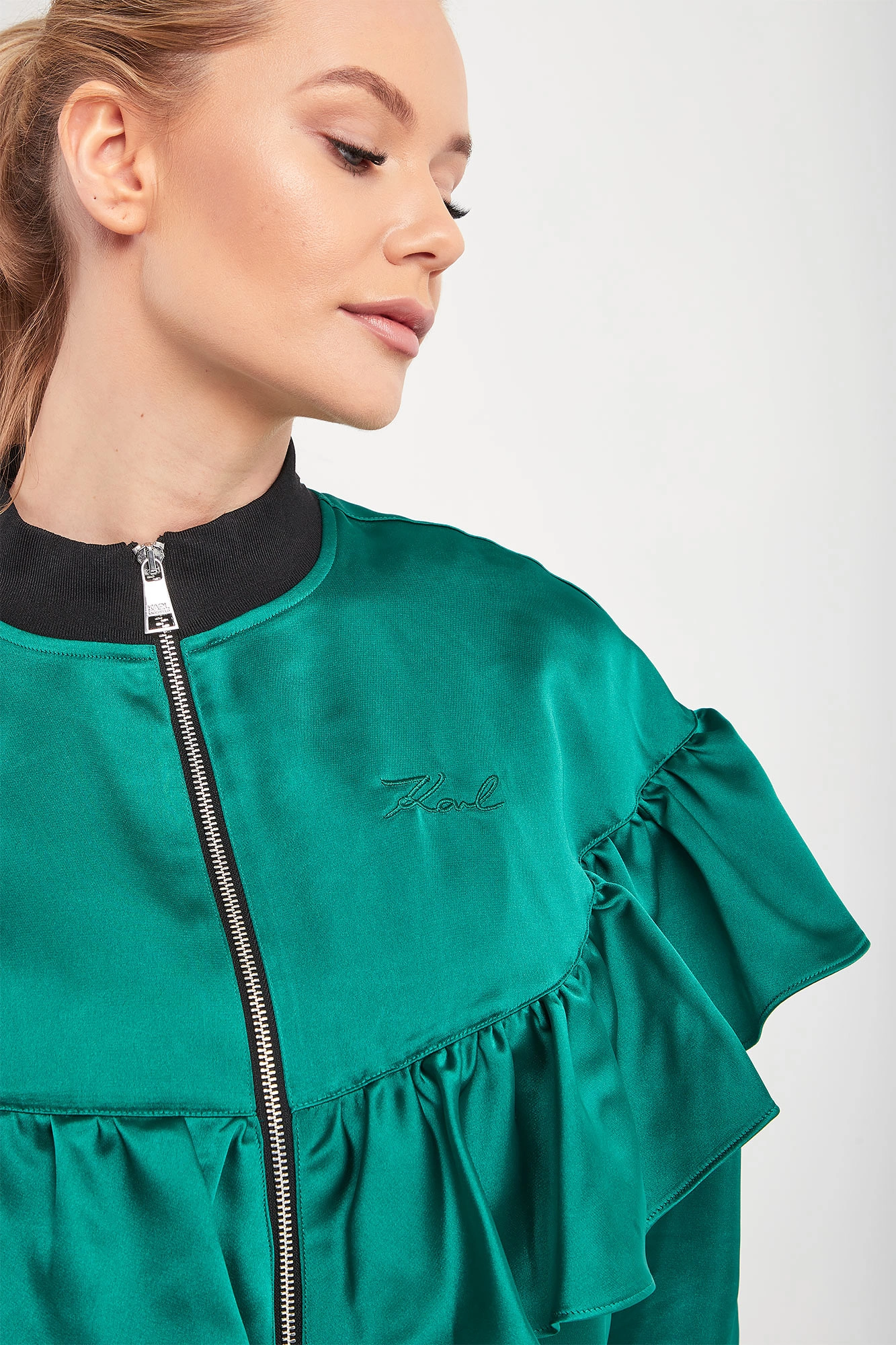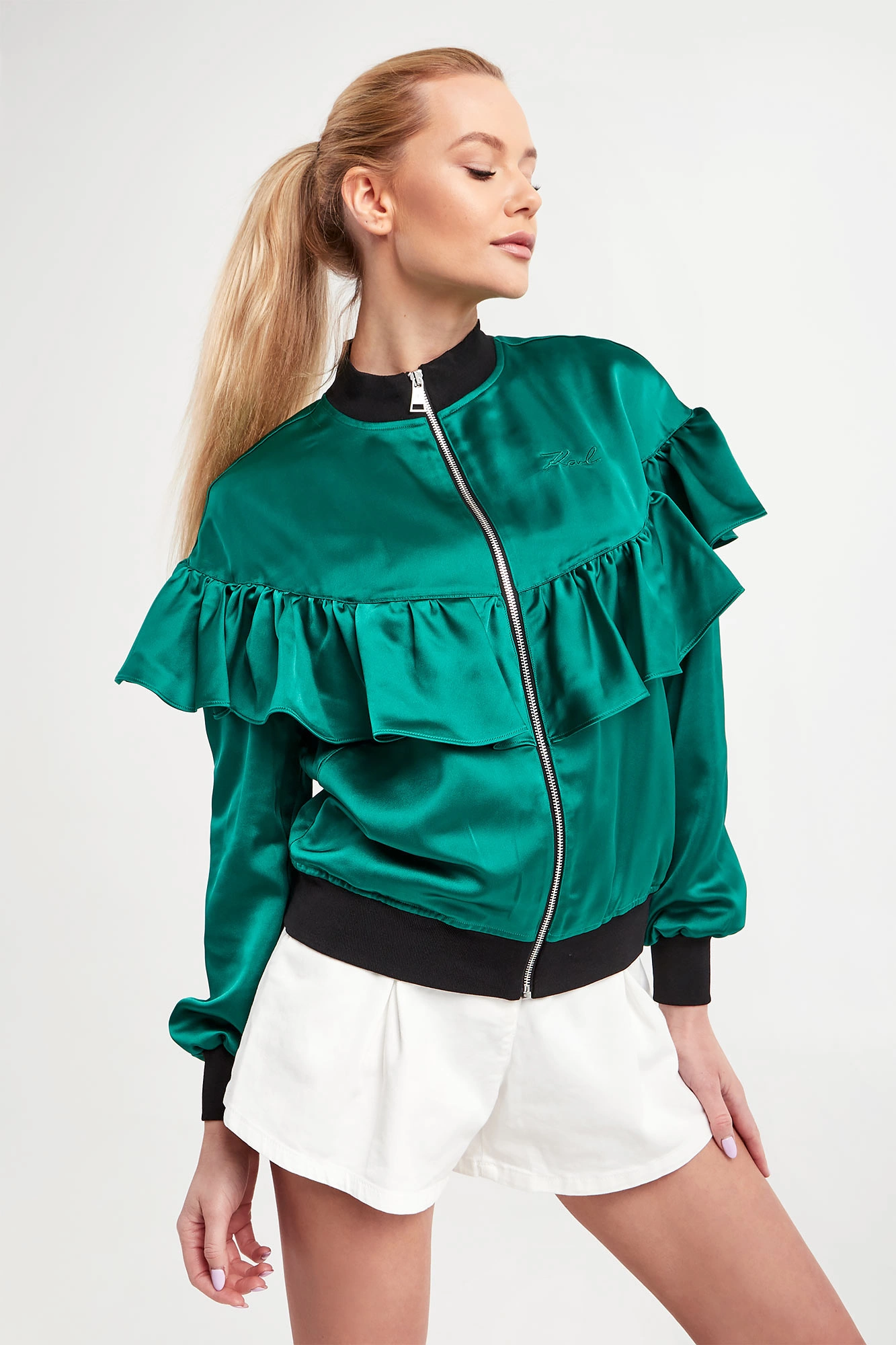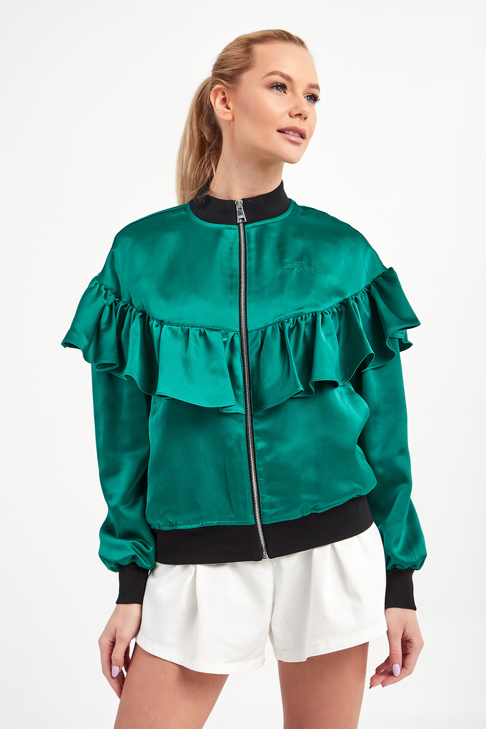 Bomberka marki Karl Lagerfeld w zielonym kolorze. Fason typu regular. Dekolt, dół i rękawy wykończone czarnym rękawem. Zapinana na srebrny zamek z sygnowaną zawieszką. Po bokach kieszenie. Z przodu haft w postaci nazwy marki w zielonym kolorze. Dookoła kurki falbana. Wykonana z błyszczącego, gładkiego materiału typu satyna.