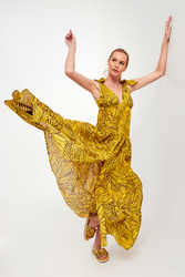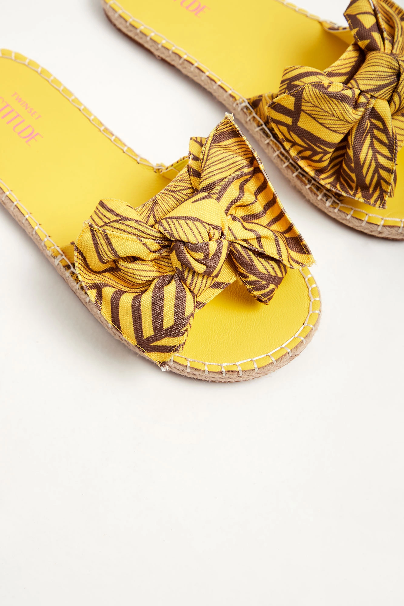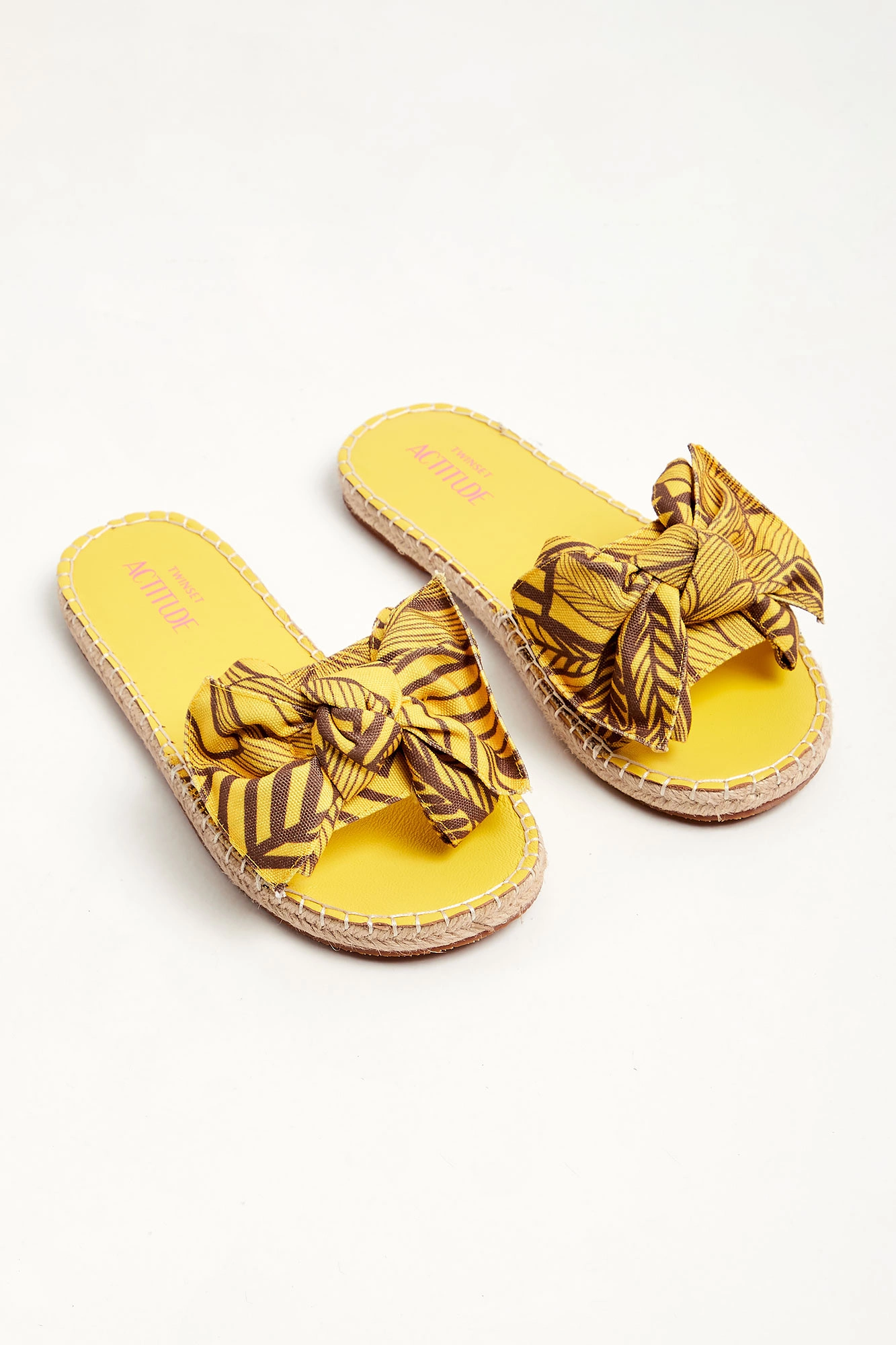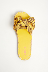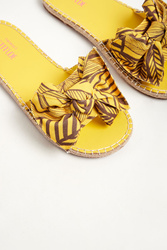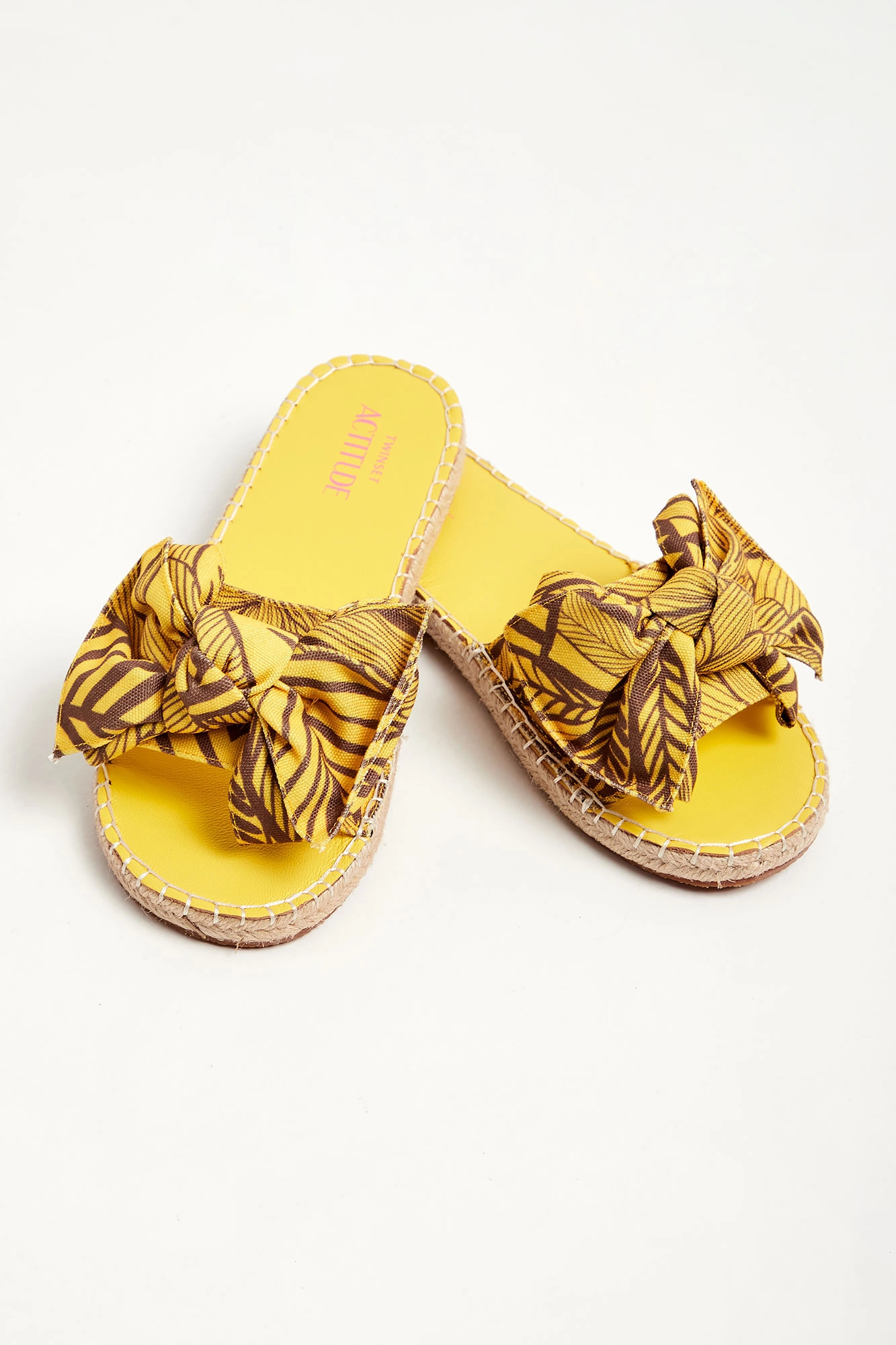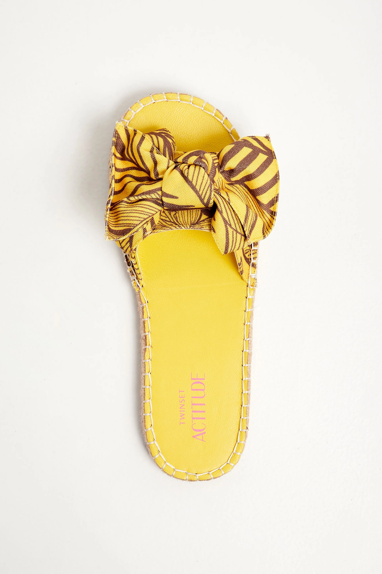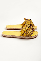 Klapki marki Twinset Actitude w żółtym kolorze. Z przodu pasek wykończony dużą kokardą i brązowym nadrukiem. Wyściółka sygnowana. Podeszwa pleciona.
