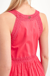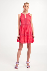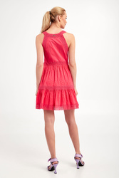 Sukienka marki Twinset w malinowym kolorze. Fason typu regular fit. Dekolt pod szyję z rozcięciem z przodu. Na dekolcie koronka. Na całości przeszycia. Dół wykończony falbanką i ażurową koronką. Na lewym boku zapięcie na kryty zamek i haftkę. Z tyłu na linii karku metalowa aplikacja w postaci logo marki.