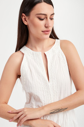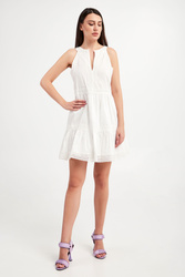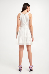 Sukienka marki Twinset w białym kolorze. Fason regular fit, długość mini. Całość plisowana, ozdobiona białą, delikatną koronką. Bez rękawów. Dekolt typu v-neck. Rozszerzający się dół. Na linii karku złota, sygnowana zawieszka. Sukienka zapinana za pomocą bocznego zamka. Wykonana ze stuprocentowej bawełny.