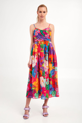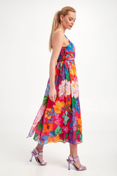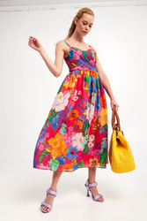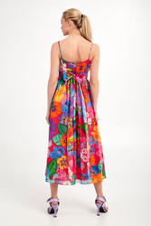 Sukienka marki Twinset. Na całości wielokolorowy wzór. Fason typu regular fit o długości midi. Model na cienkich ramiączkach. Góra dopasowana i wiązana z tyłu. Na lewym boku zapinana na haftkę i kryty zamek. Dół wykończony lamówką. Sukienka z podszewką. W całości wykonana z tkaniny bawełnianej.