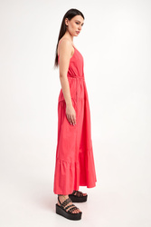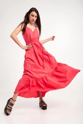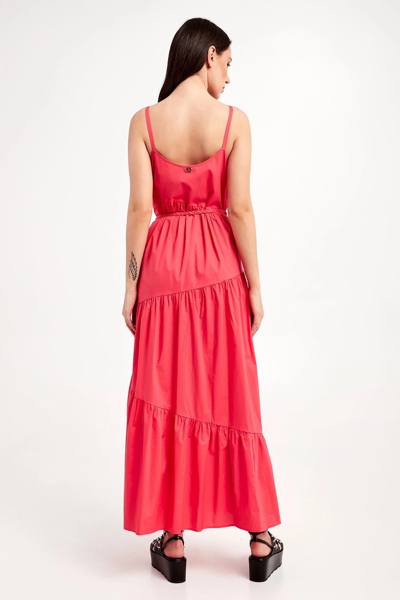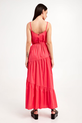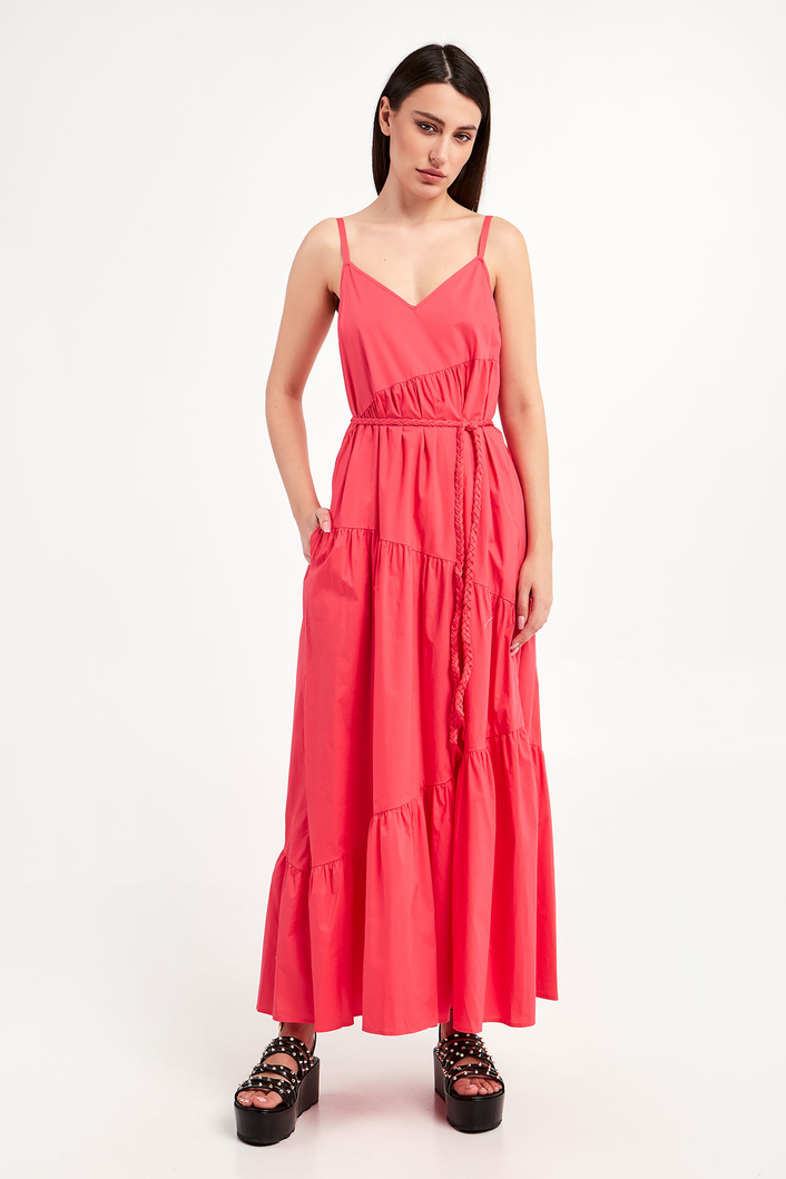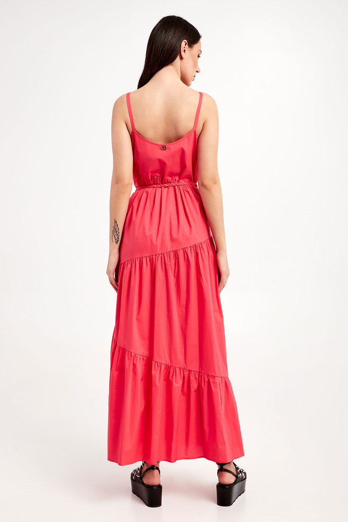 Sukienka marki Twinset w malinowym kolorze. Fason typu regular o długości maxi. Na lewym boku zapinana na haftkę oraz kryty zamek. Model na cienkich ramiączkach. Na całości marszczenia. Dół wykończony marszczeniem oraz falbanką. Z tyłu metalowa aplikacja w postaci logo marki. w zestawie pleciony pasek do wiązania w talii.