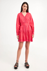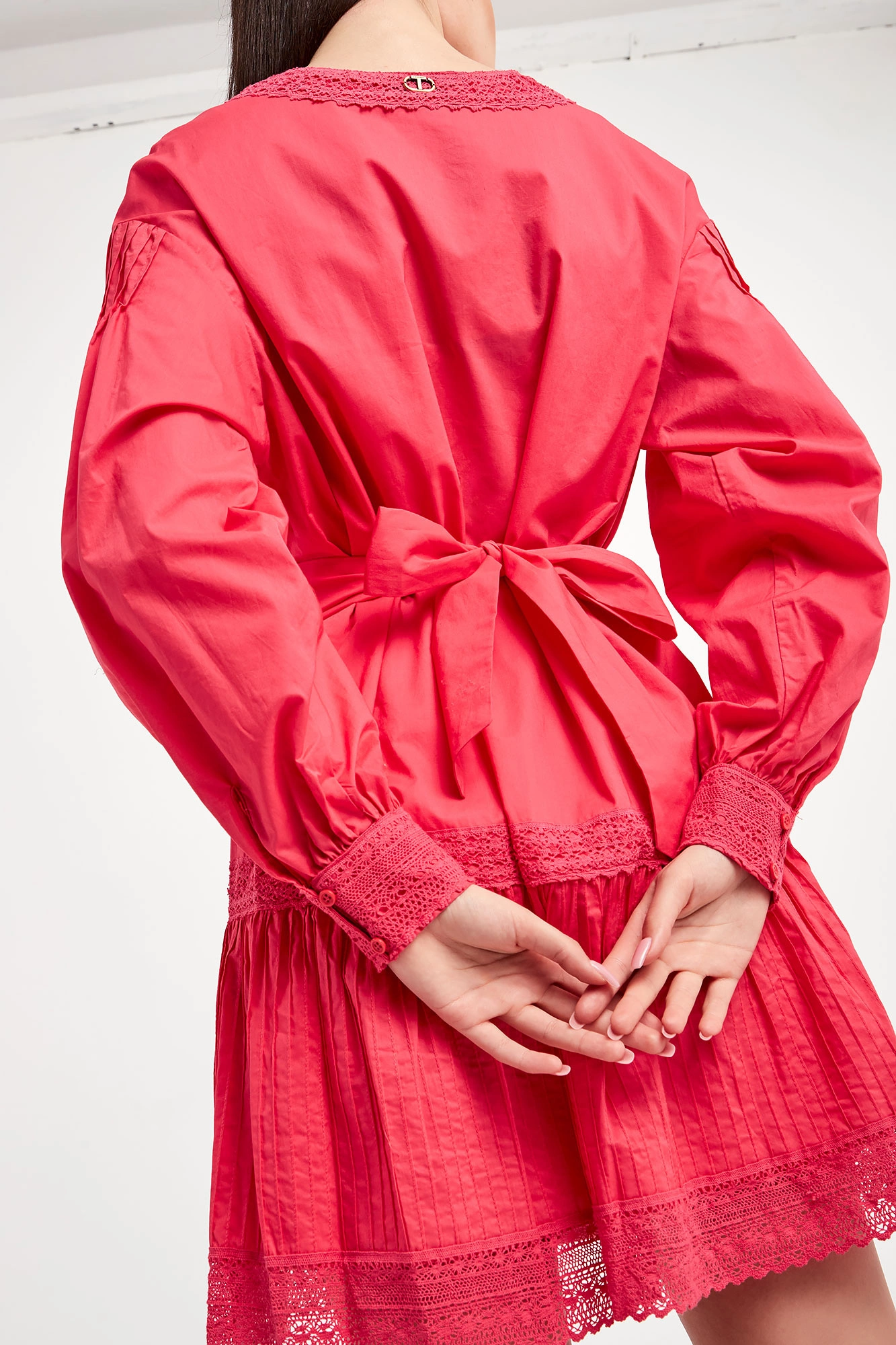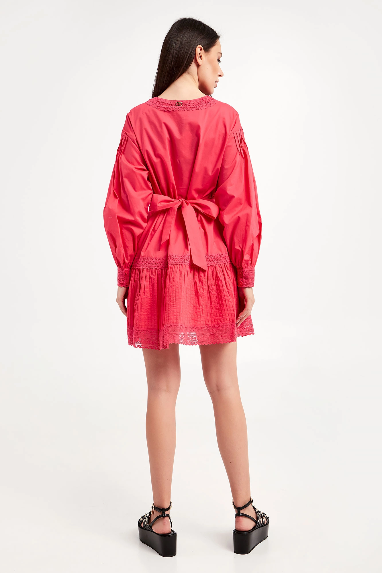 Sukienka marki Twinset w malinowym kolorze. Fason typu relaxed fit. Dekolt typu v-neck wykończony koronką. Długie rękawy wykończone mankietami zapinanymi na guziki. Na mankiecie koronka. Na górnej części rękawa, przy ramionach zakładki. Dół sukienki wykończony falbanką z przeszyciami oraz koronką. Z tyłu na linii karku metalowa aplikacja w postaci logo marki. W zestawie pasek do wiązania w talii. W całości wykonana z tkaniny bawełnianej.