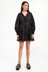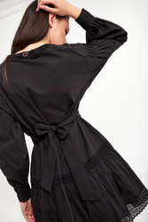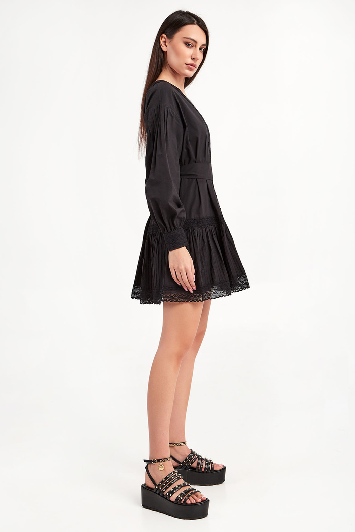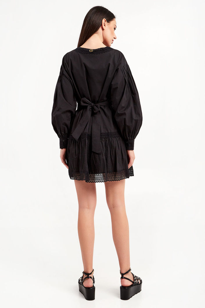 Sukienka marki Twinset w czarnym kolorze. Fason typu relaxed fit. Dekolt typu v-neck wykończony koronką. Długie rękawy wykończone mankietami zapinanymi na guziki. Na mankiecie koronka. Na górnej części rękawa, przy ramionach zakładki. Dół sukienki wykończony falbanką z przeszyciami oraz koronką. Z tyłu na linii karku metalowa aplikacja w postaci logo marki. W zestawie pasek do wiązania w talii. W całości wykonana z tkaniny bawełnianej.