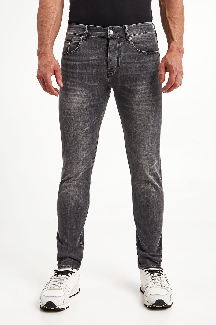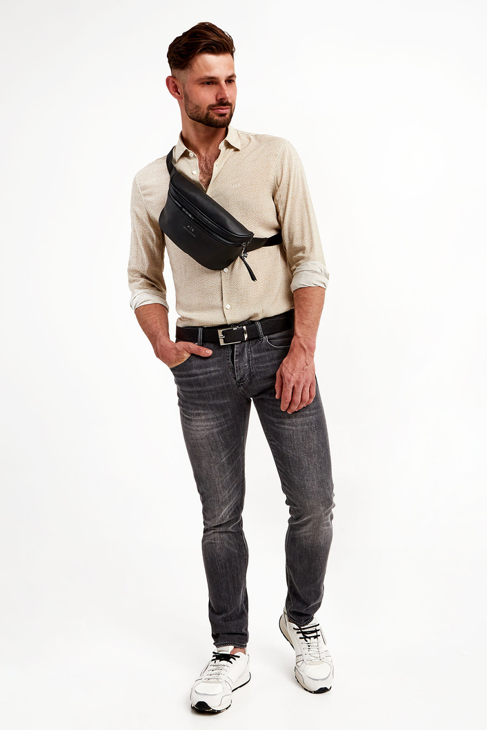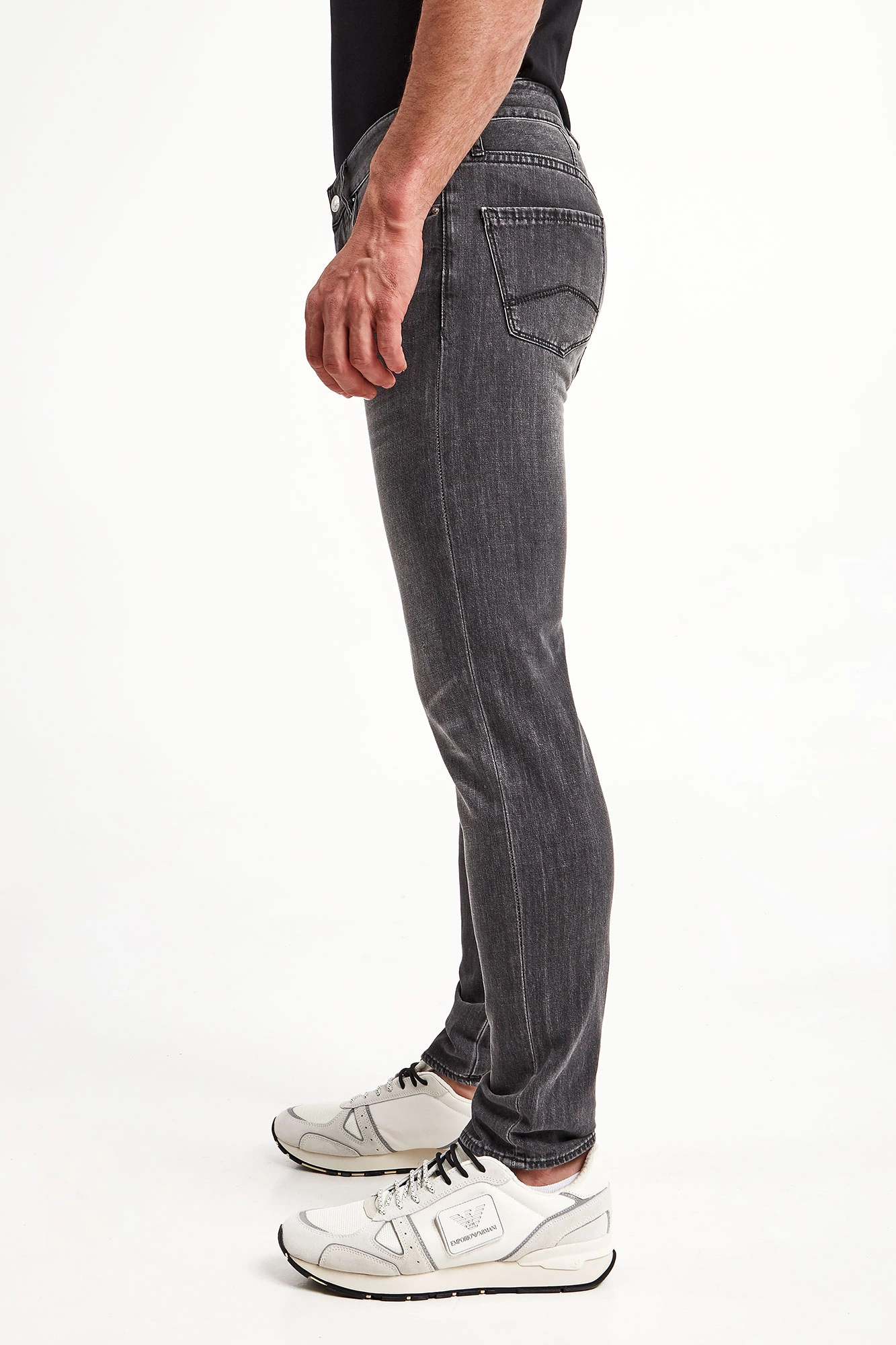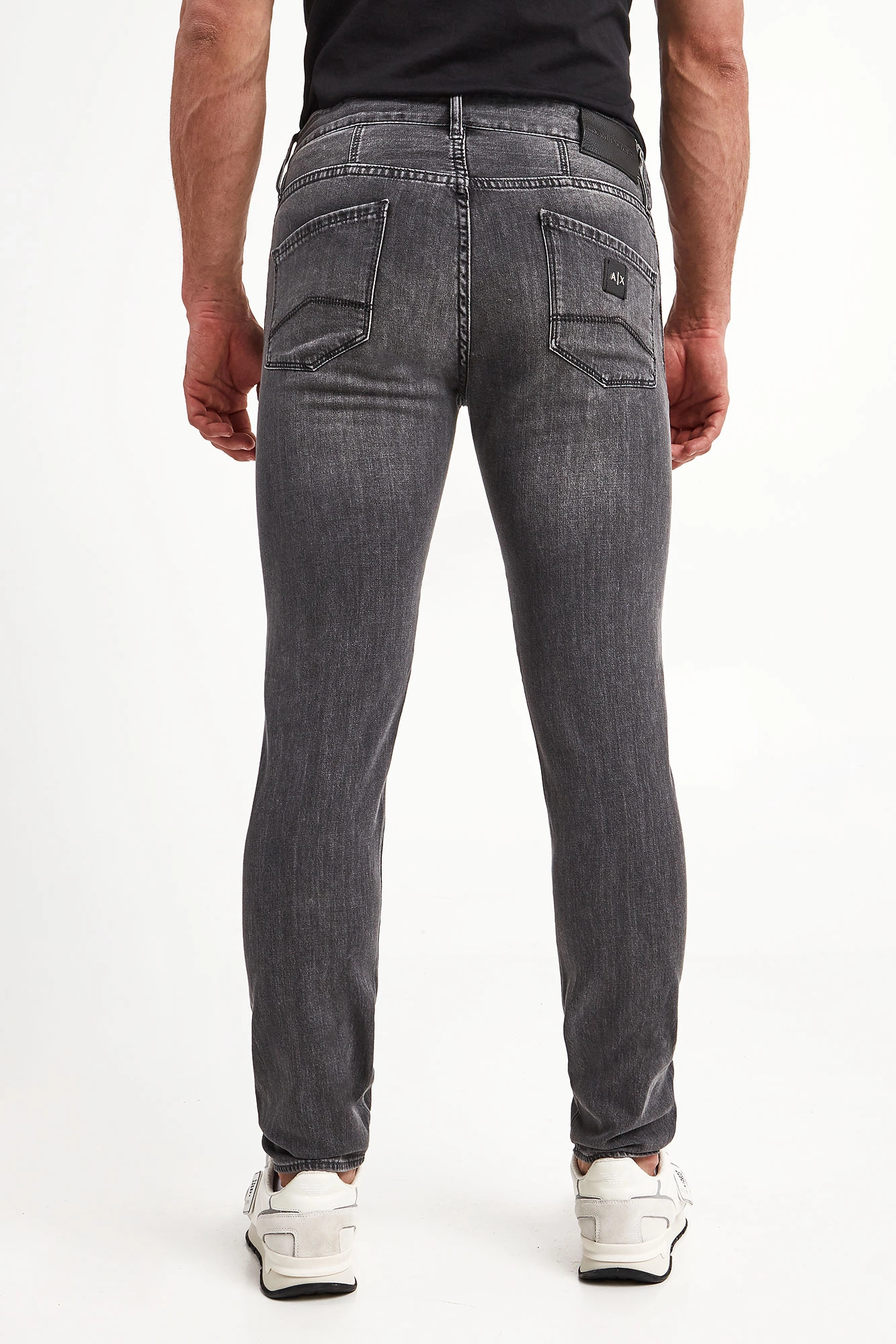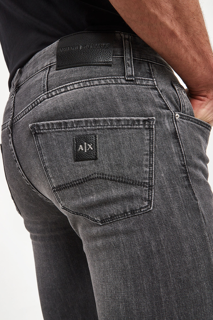 Jeansy marki Armani Exchange w szarym kolorze. Fason typu skinny. Zapinane za pomocą zamka oraz sygnowanego guzika. Model z pięcioma kieszeniami. Z boku biały haft z monogramem. Z tyłu czarne, skórzane naszywki z logo marki. W pasie szlufki. Wykonane z bawełnianej tkaniny z domieszką elastycznych włókien.