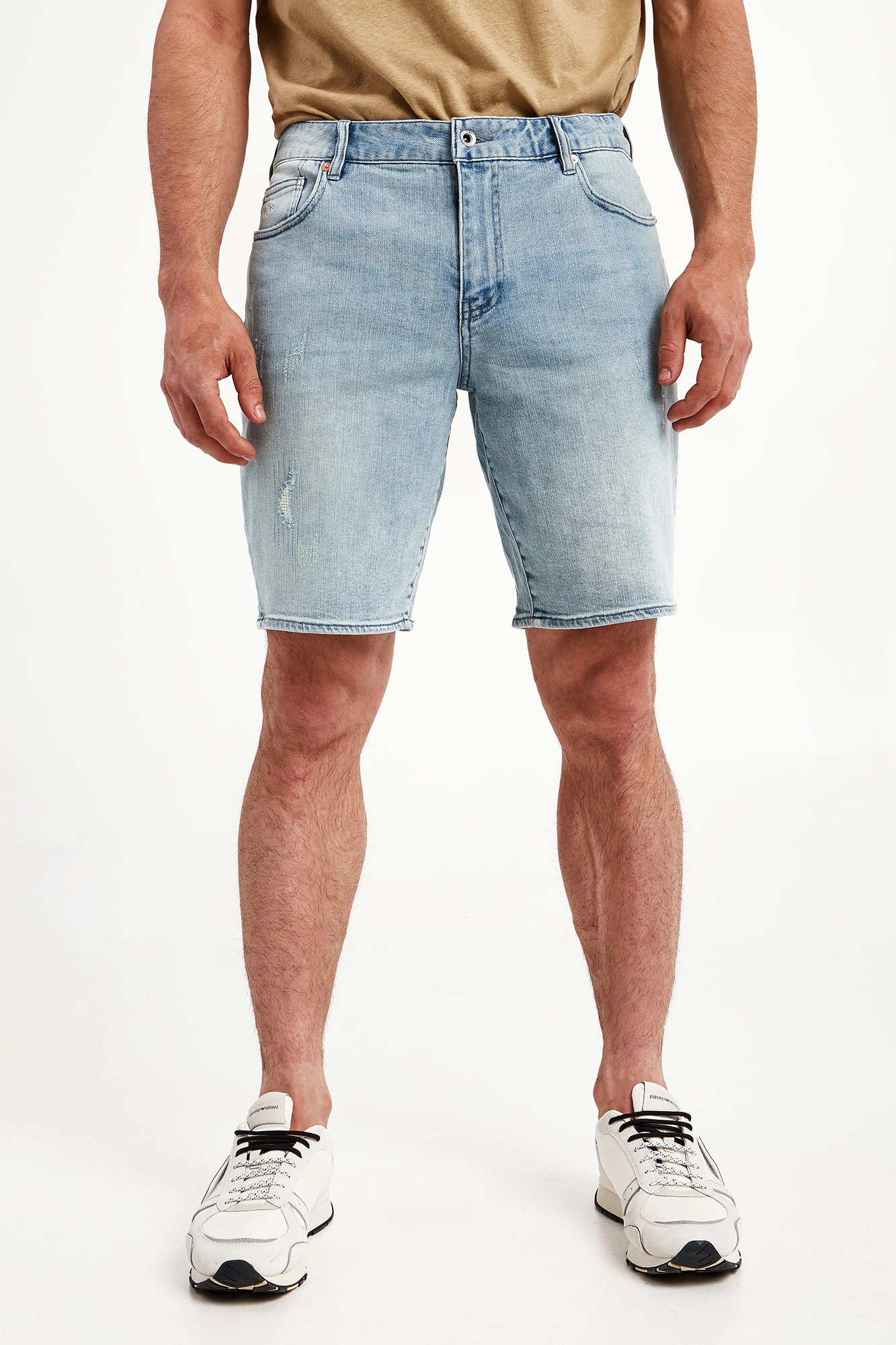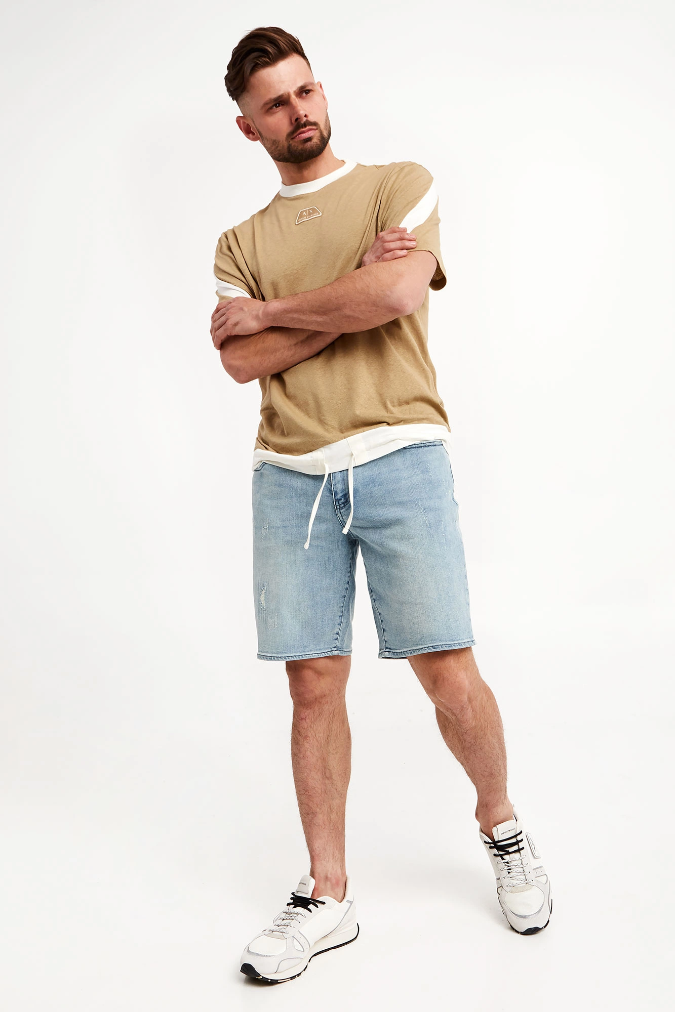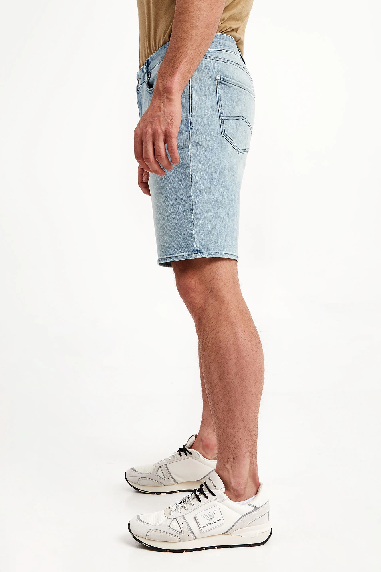 Spodenki jeansowe marki Armani Exchange w błękitnym kolorze. Fason slim fit. Na całości przetarcia. Zapinane za pomocą zamka oraz sygnowanego guzika. Model z pięcioma kieszeniami. Z przodu haft z monogramem. Z tyłu białe, skórzane naszywki z logo marki. W pasie szlufki. Na tylnych kieszeniach ozdobne przeszycia. Nogawki wykończone lamówką. Wykonane z bawełnianej tkaniny z dodatkiem elastycznych włókien.