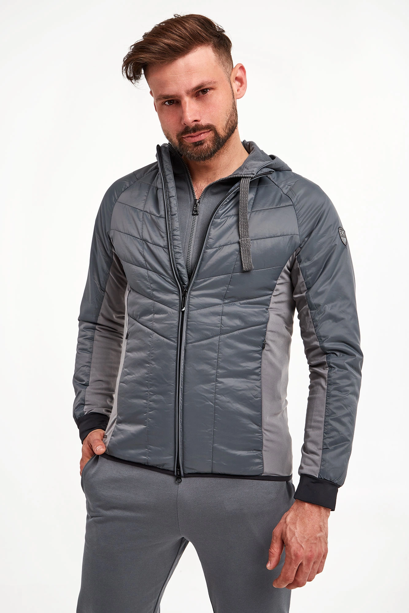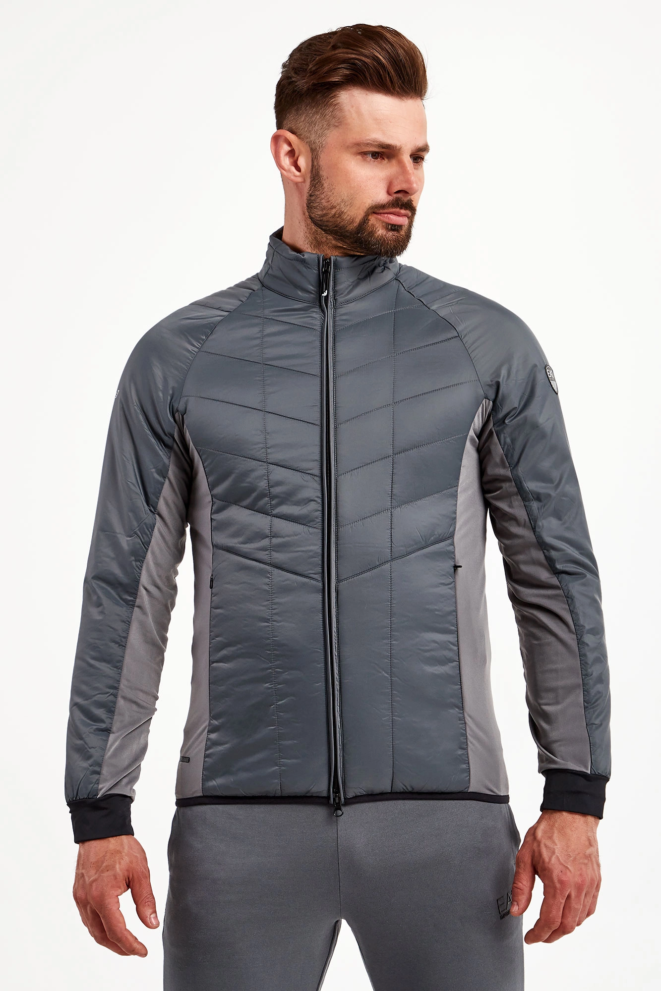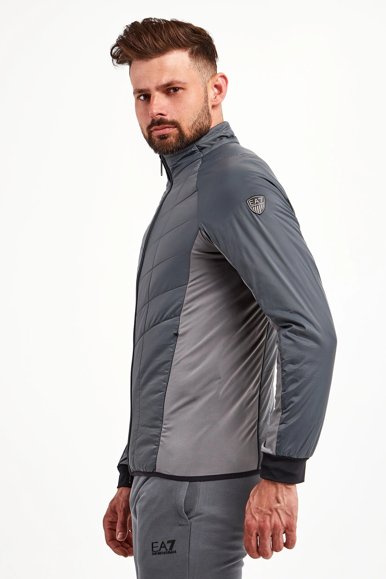 Kurtka na stójce marki EA7 Emporio Armani w szarym kolorze. Fason typu slim. Z przodu i z tyłu pikowana. Zapinana na zamek z sygnowaną zawieszką. Na lewym rękawie aplikacja w postaci logo i nazwy marki. Rękawy wykończone ściągaczem w czarnym kolorze. Dół wykończony lamówką. Boki oraz wewnętrzna strona rękawów wykonana z elastycznego materiału. Po bokach dwie kieszenie zapinane na kryty zamek.