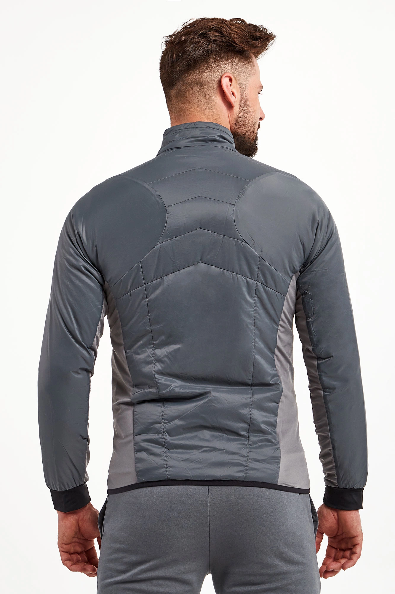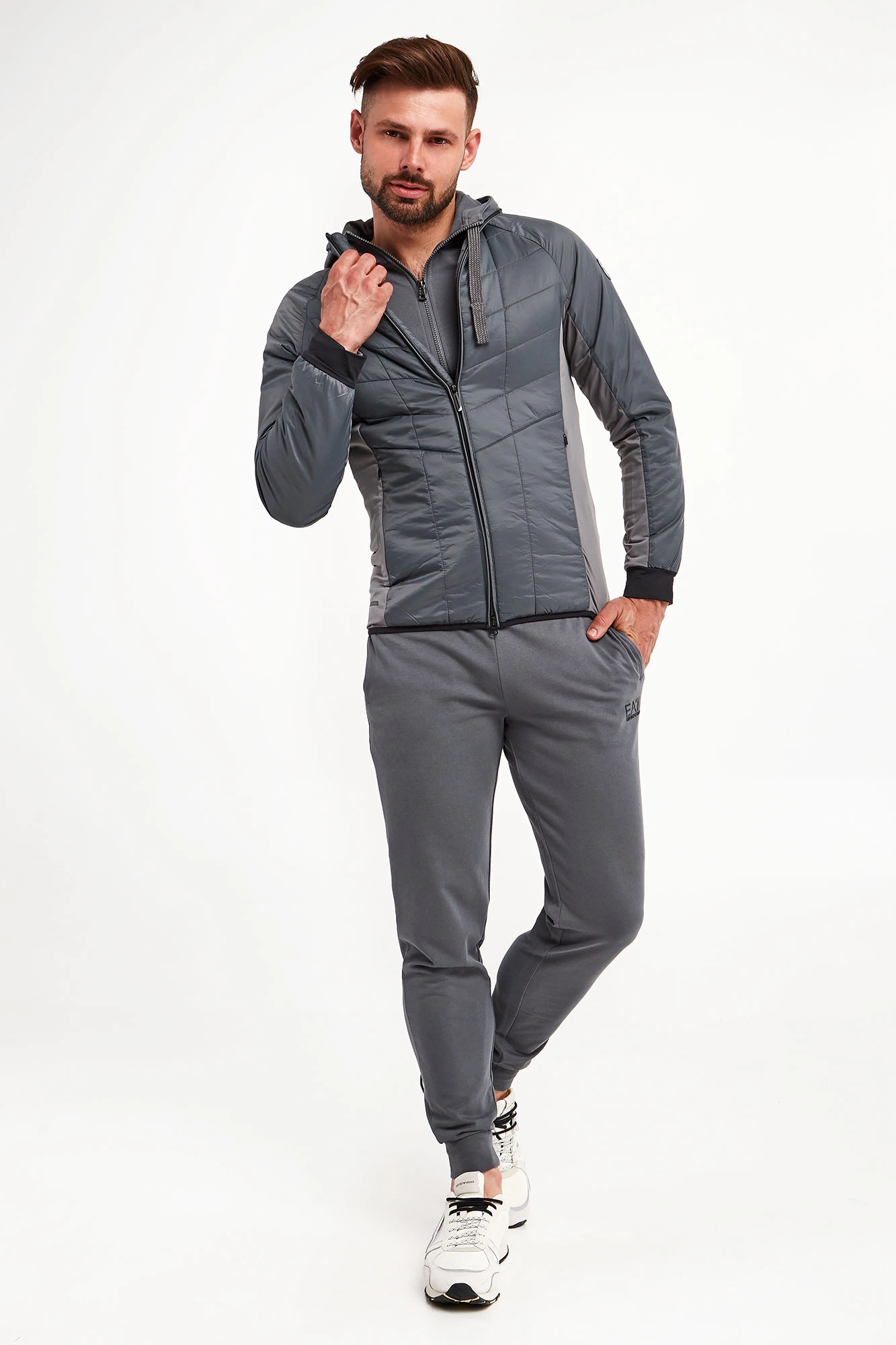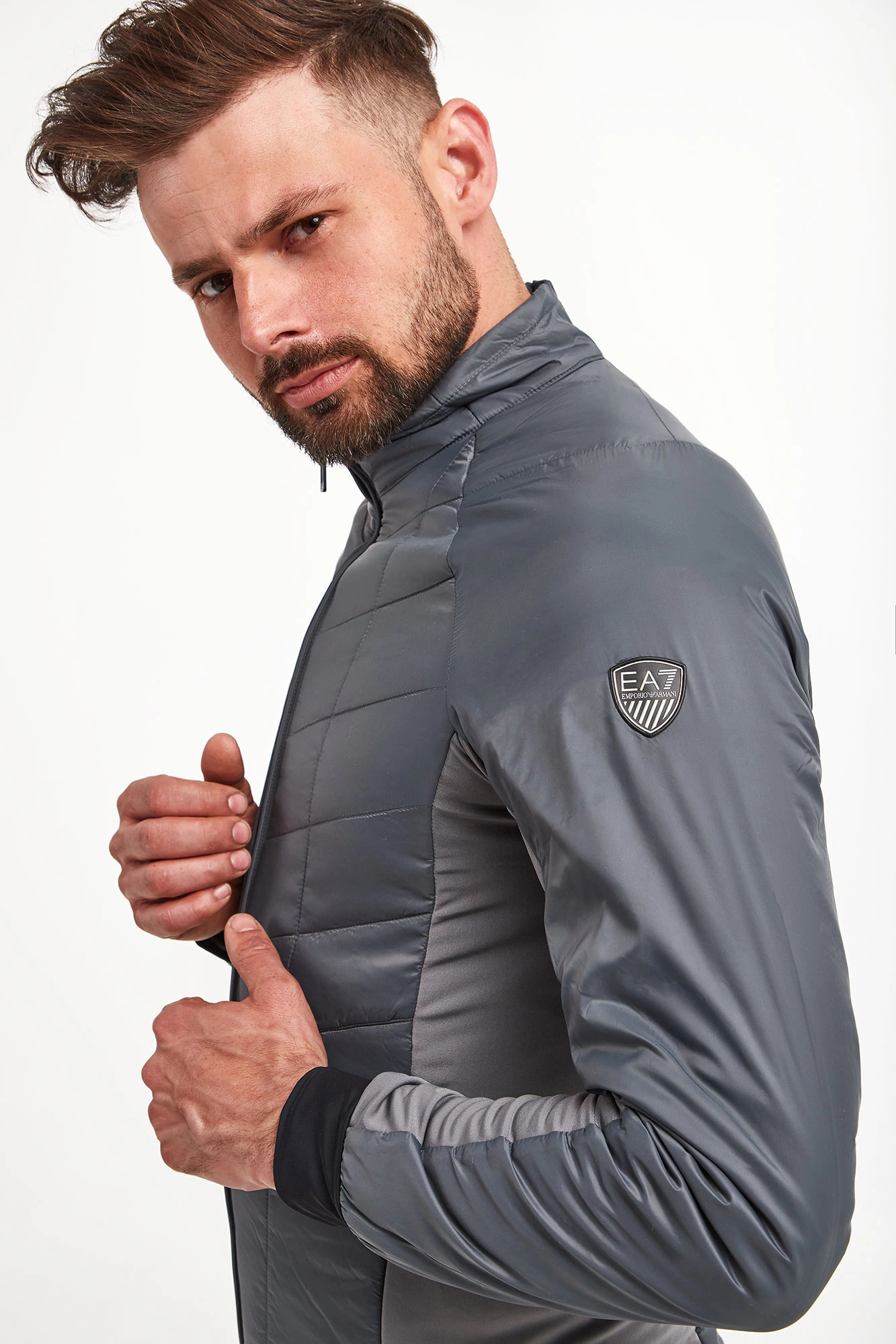 Kurtka na stójce marki EA7 Emporio Armani w szarym kolorze. Fason typu slim. Z przodu i z tyłu pikowana. Zapinana na zamek z sygnowaną zawieszką. Na lewym rękawie aplikacja w postaci logo i nazwy marki. Rękawy wykończone ściągaczem w czarnym kolorze. Dół wykończony lamówką. Boki oraz wewnętrzna strona rękawów wykonana z elastycznego materiału. Po bokach dwie kieszenie zapinane na kryty zamek.