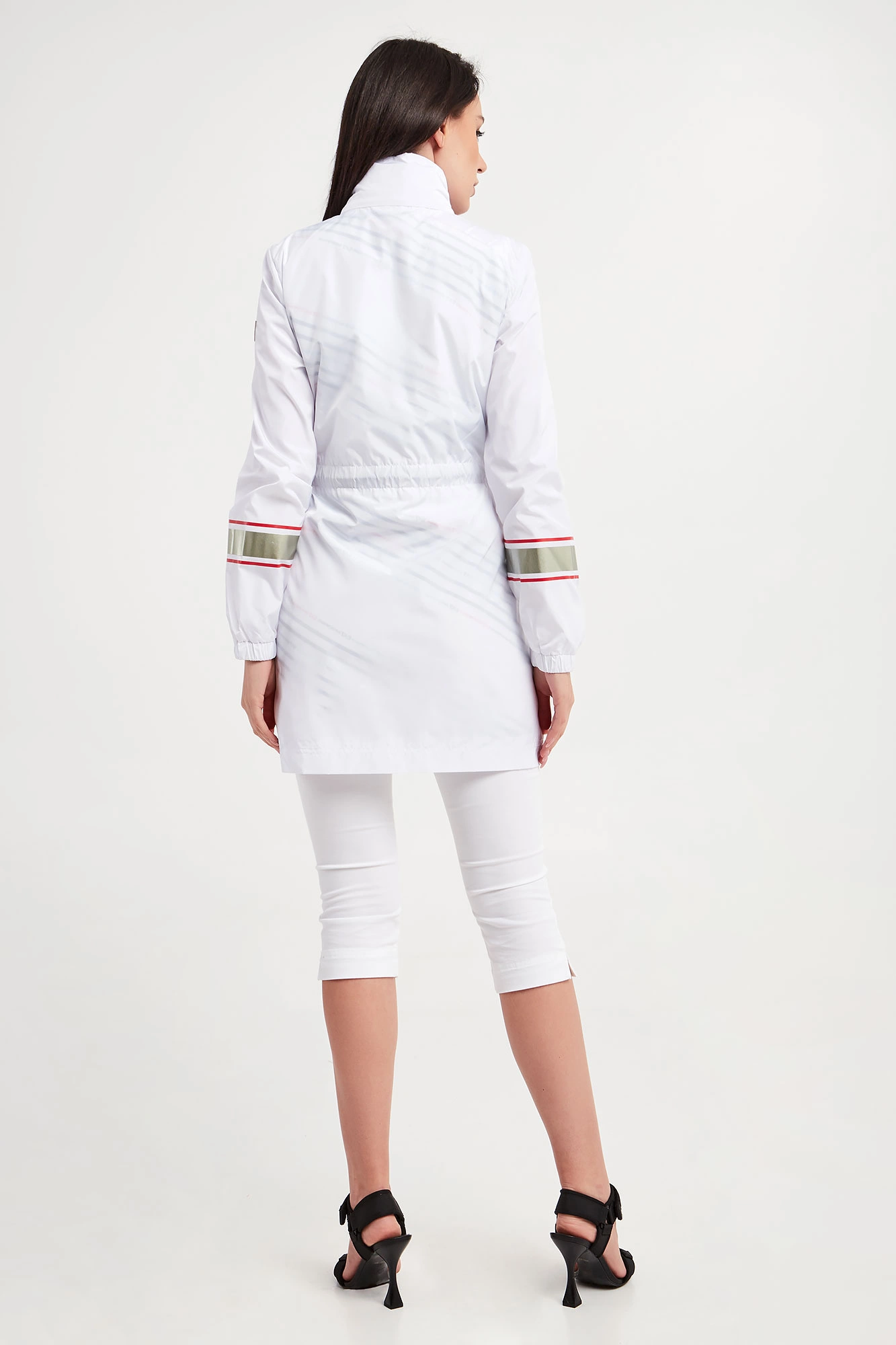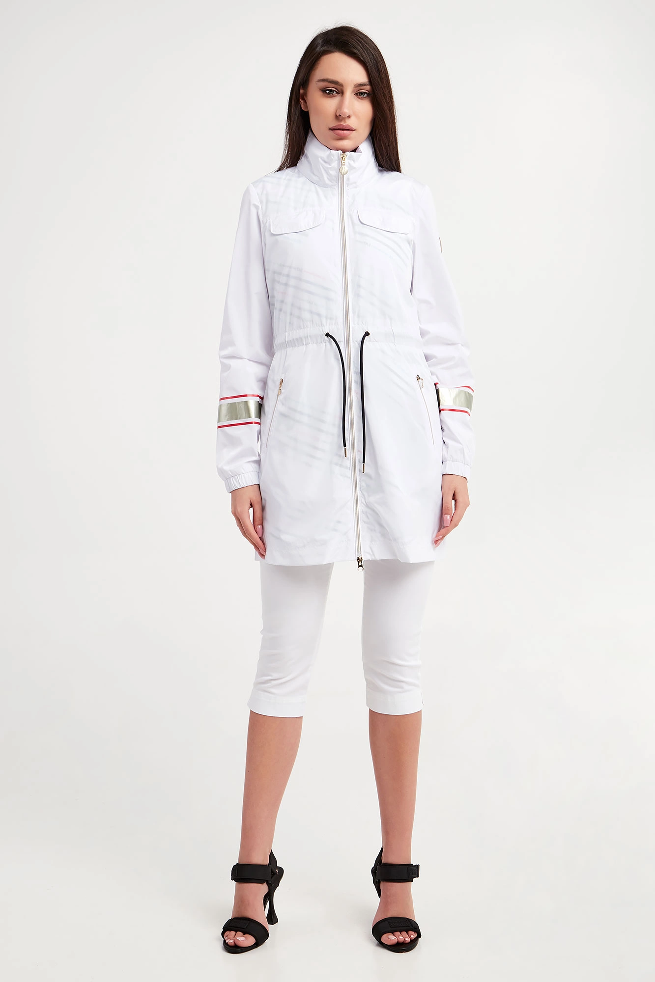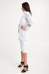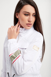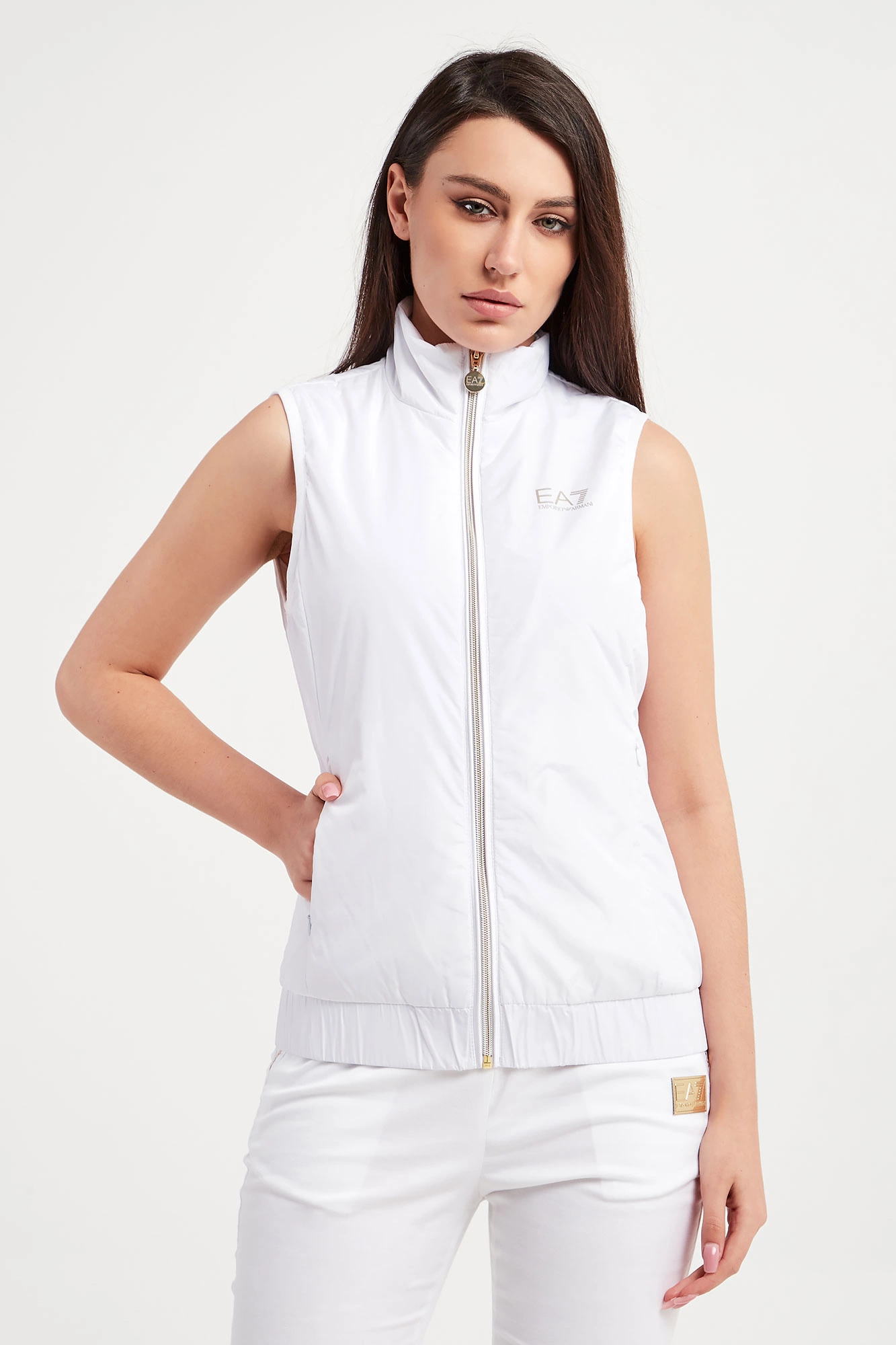 Kurtka w zestawie z kamizelką marki EA7 Emporio Armani w białym kolorze. Fason typu slim fit. W talii regulowana za pomocą granatowych troczków ze złotą końcówką. Zapinana na dwukierunkowy zamek z sygnowaną zawieszką w złotym kolorze. Z przodu cztery kieszenie. Dwie z patkami zapinanymi na napę i dwie zapinane na złoty zamek. Rękawy wykończone elastycznym ściągaczem. Na rękawach złoto-czerwone paski. Na lewym rękawie naszywka w postaci logo i nazwy marki w złotym kolorze. Kurtka ze stójką oraz kapturem chowanym w stójce. Podszewka logowana w białym kolorze. Kamizelka w granatowym kolorze. Zapinana na złoty zamek z sygnowaną zawieszką. Po bokach dwie kieszenie zapinane na kryty zamek. Dół wykończony elastycznym ściągaczem. Z przodu złoty nadruk w postaci logo i nazwy marki.
