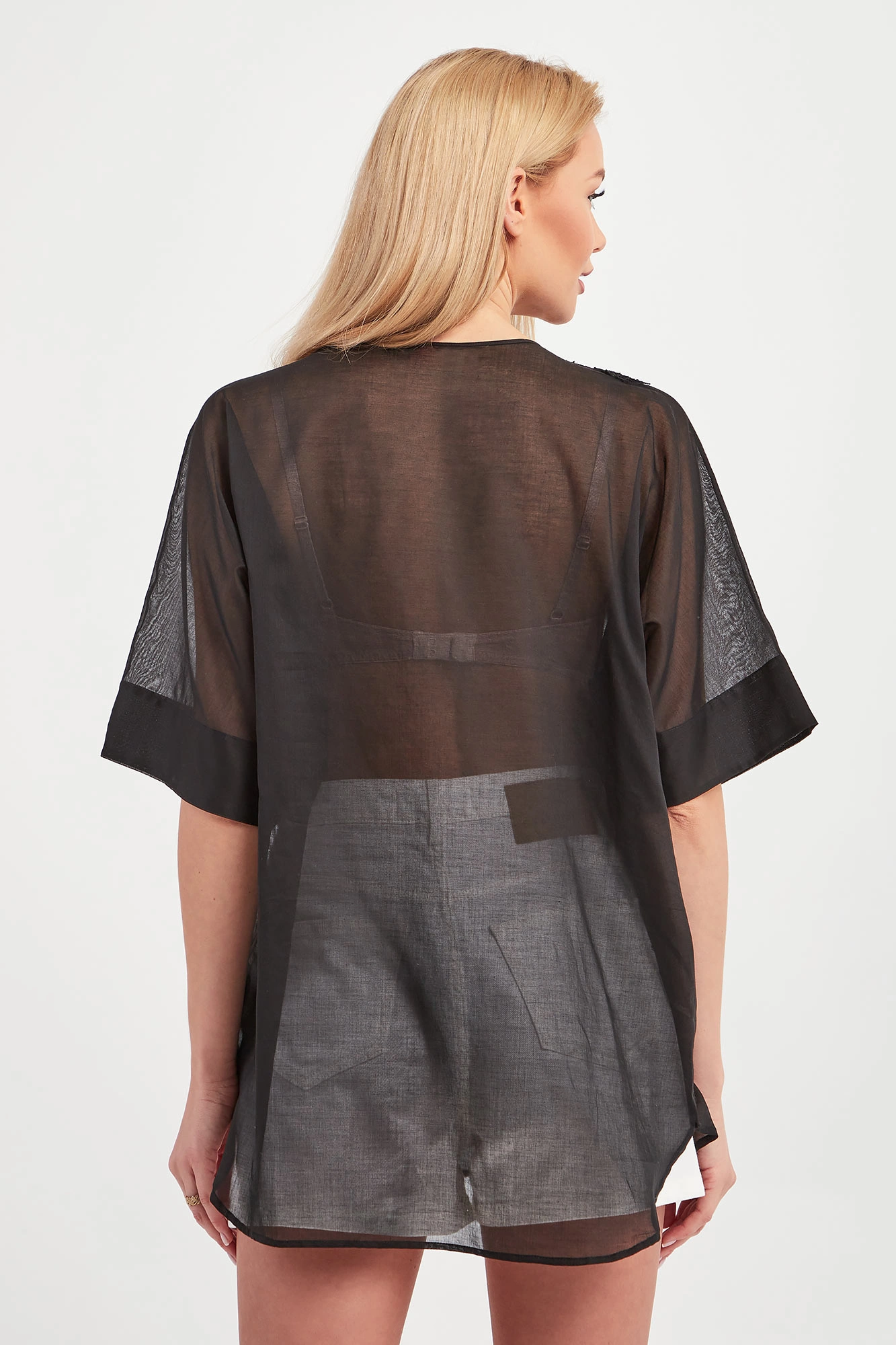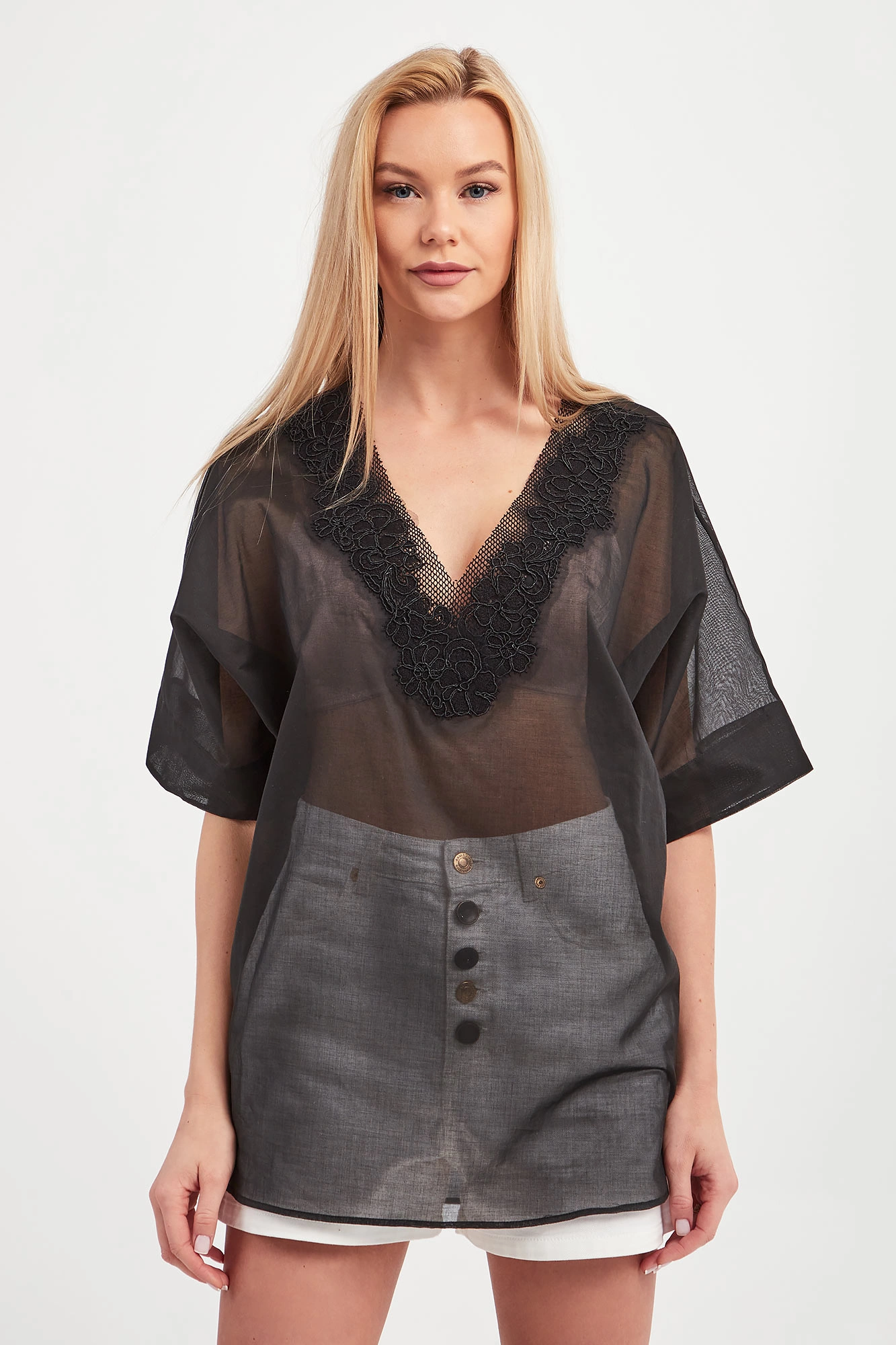 Bluzka marki Ermanno Firenze w czarnym kolorze. Całość półtransparentna. Luźny fason typu relaxed fit. Dekolt typu v-neck wykończony ozdobną koronką i haftem z motywem kwiatów. Krótkie rękawy. Po bokach ozdobne rozcięcia. Wykonana z czystej bawełny.