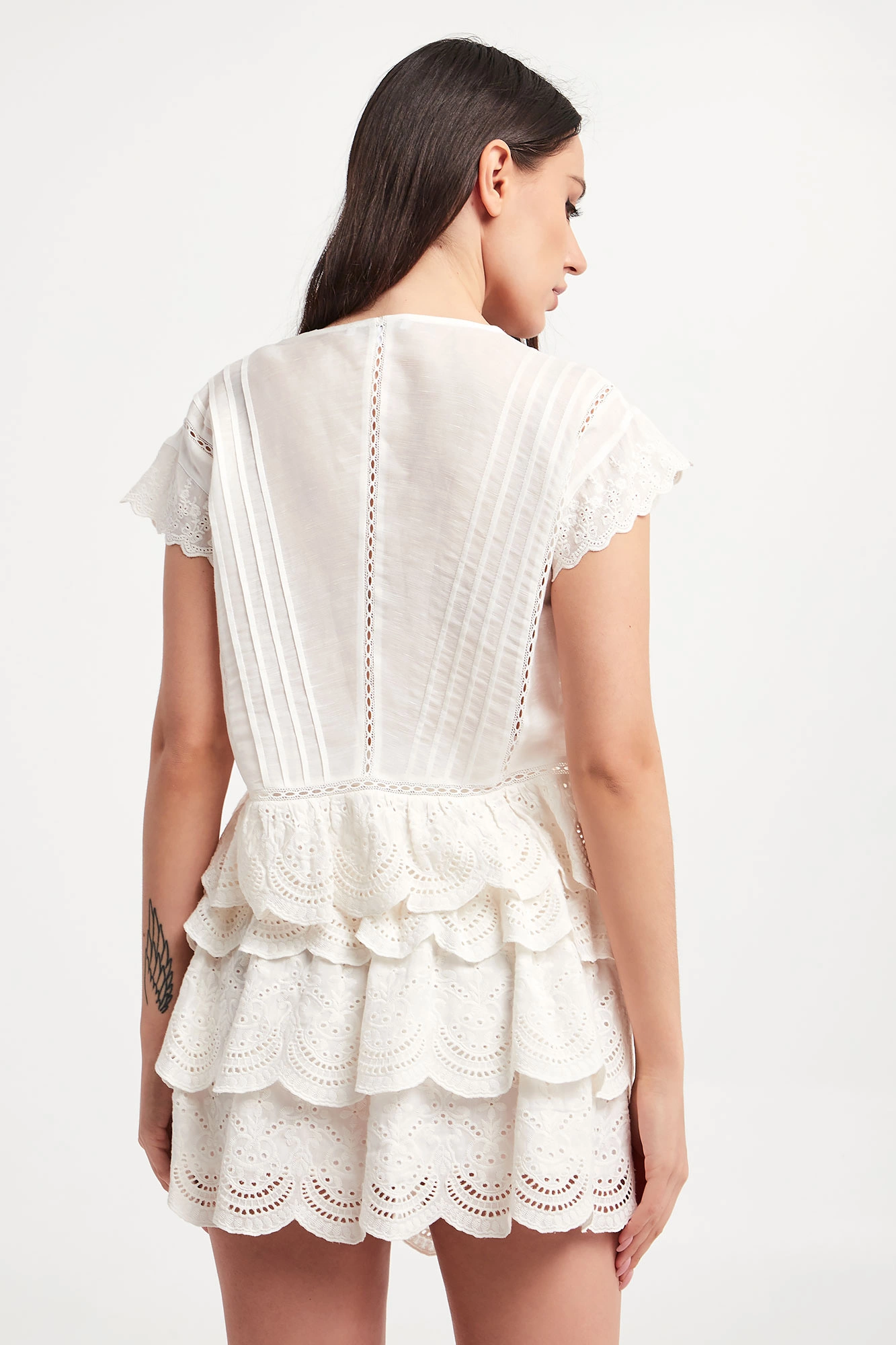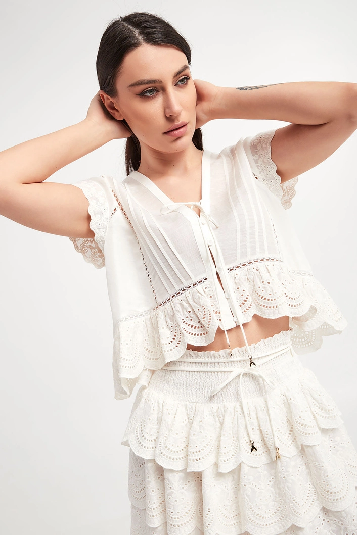 Bluzka marki Patrizia Pepe w białym kolorze. Fason typu cropped. Na całości wstawki z ażurowej koronki. Na froncie ozdobne guziki. Dekolt typu v-neck wiązany za pomocą troczków ze złotymi stoperami w kształcie charakterystycznego, owadziego logo. Krótkie rękawy. Z przodu zakładki. Wykonana z mieszanki wiskozy i lnu.