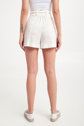 Spodenki marki Patrizia Pepe w kolorze złamanej bieli. Fason typu relaxed fit. Z przodu zakładki. Zapinane za pomocą zamka i dwóch sygnowanych guzików. W pasie szlufki i z tyłu elastyczny ściągacz. Po bokach kieszenie. Przy lewej kieszeni złota zawieszka w postaci logo marki. Nogawki wykończone lamówką. W zestawie sznurek w kolorze spodni zakończony frędzlami.