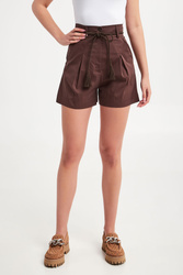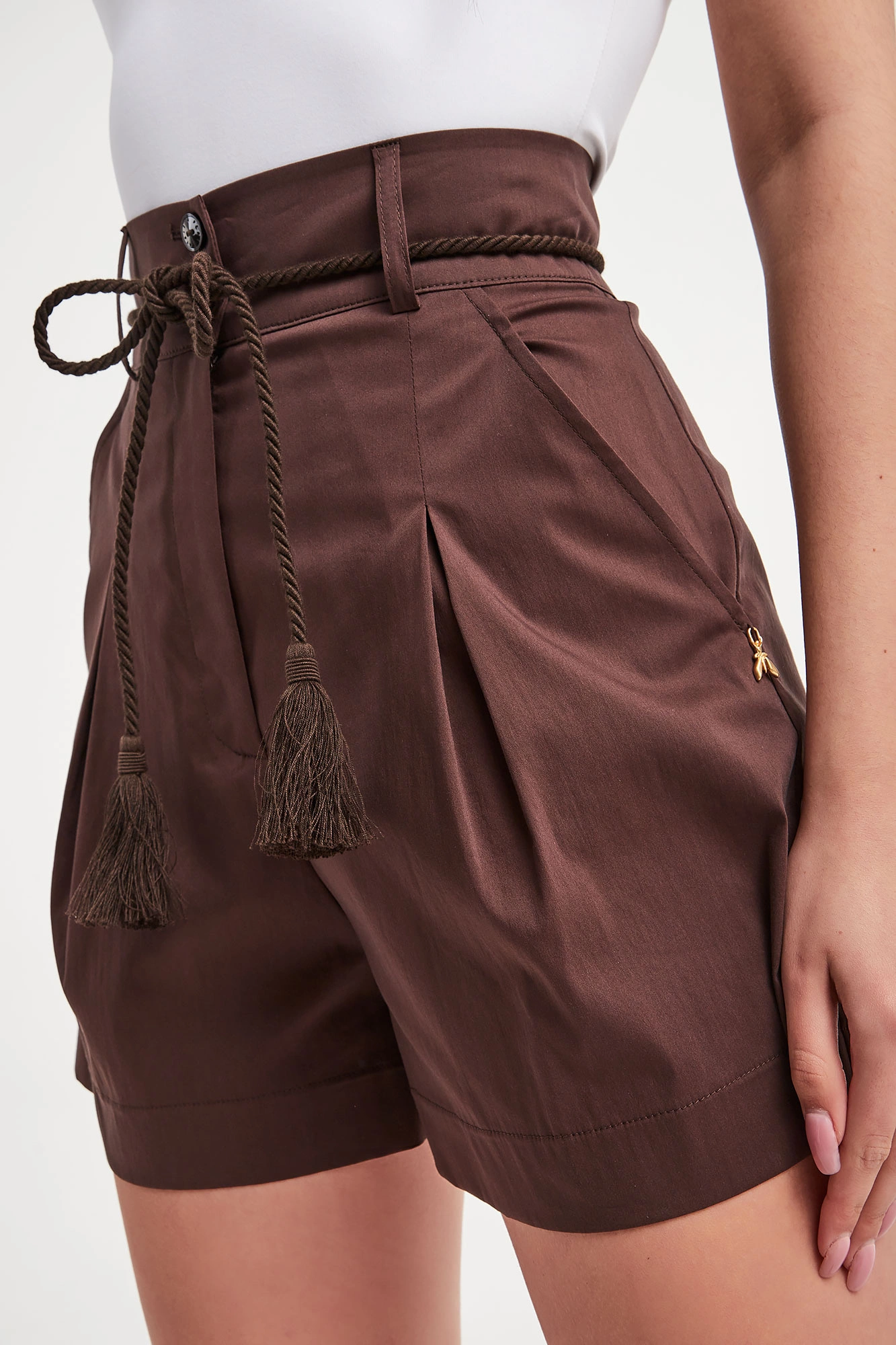 Spodenki marki Patrizia Pepe w brązowym kolorze. Fason typu relaxed fit. Z przodu zakładki. Zapinane za pomocą zamka i dwóch sygnowanych guzików. W pasie szlufki i z tyłu elastyczny ściągacz. Po bokach kieszenie. Przy lewej kieszeni złota zawieszka w postaci logo marki. Nogawki wykończone lamówką. W zestawie sznurek w kolorze spodni zakończony frędzlami.