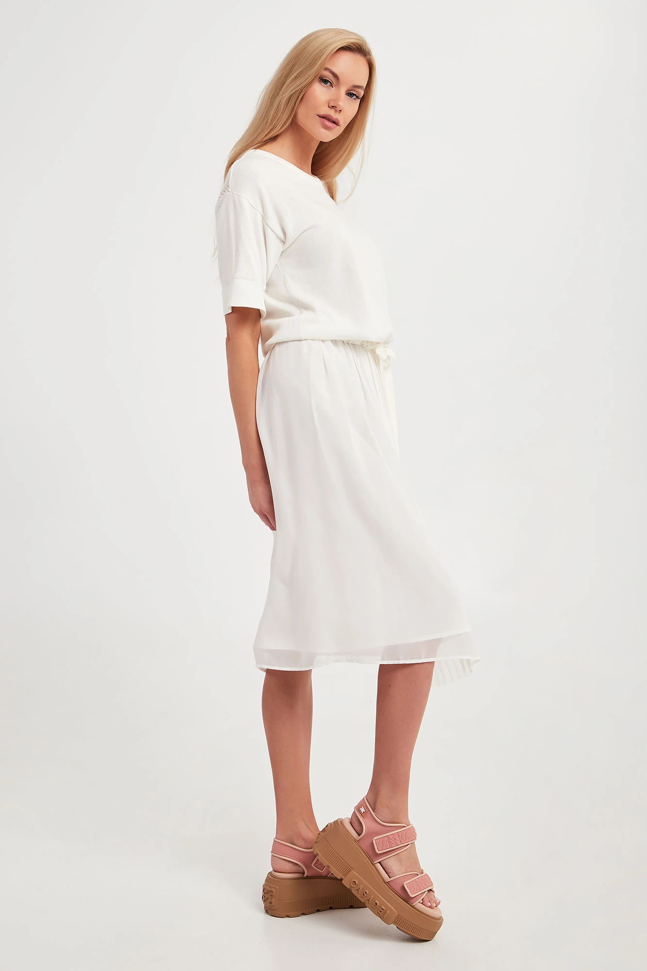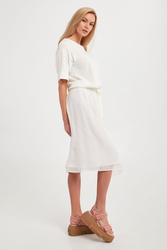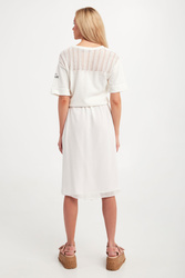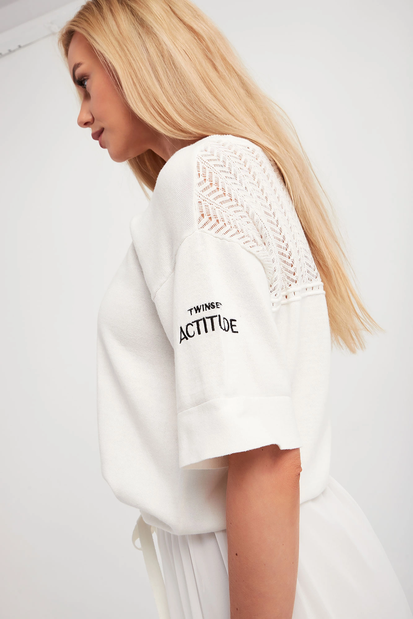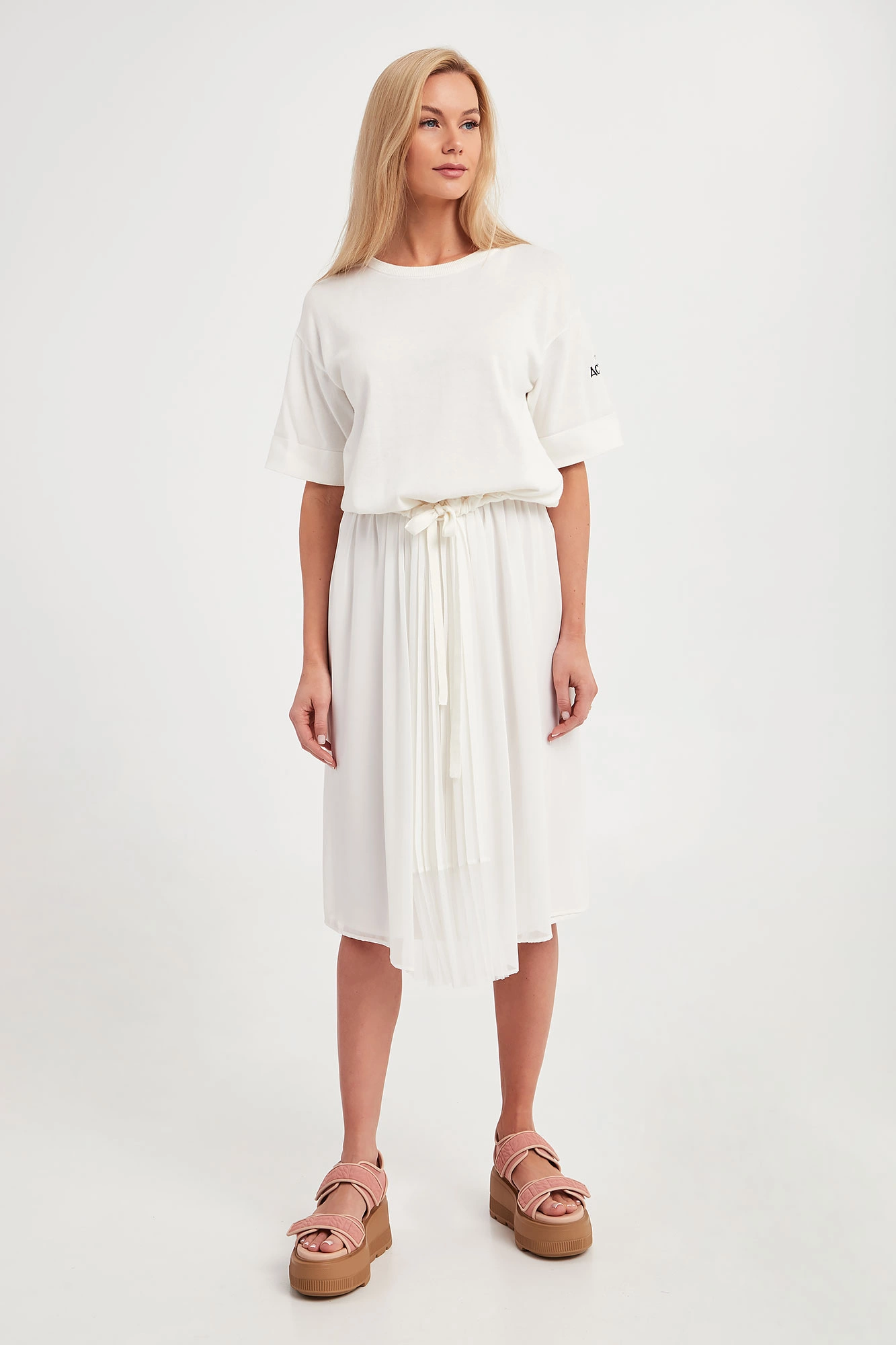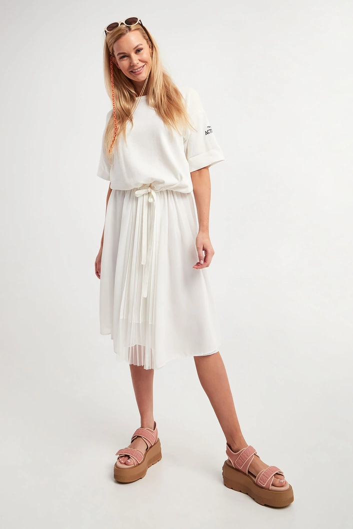 Sukienka marki Twinset w białym kolorze. Fason relaxed fit, długość midi. Dekolt typu o-neck. Krótkie rękawki zakończone podwijaną lamówką. Na lewym rękawie czarny, kontrastujący haft z nazwą marki. Dół plisowany, tiulowy, półprzezroczysty. Na plecach wstawka wzorzystej, ażurowej tkaniny. Nad tiulowym dołem ściągacz regulowany za pomocą troczków. Wykonana z czystej bawełny.