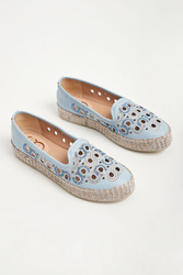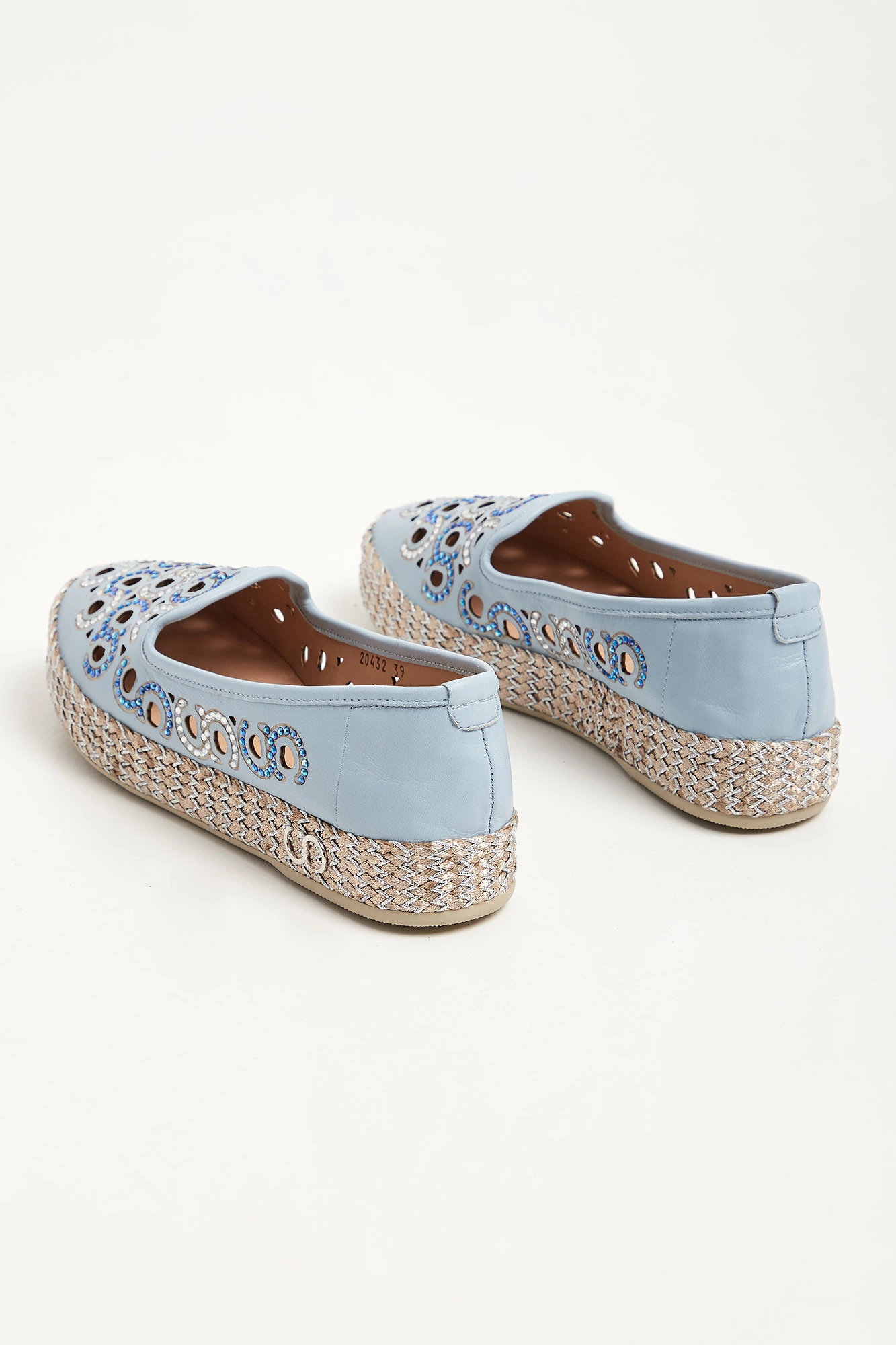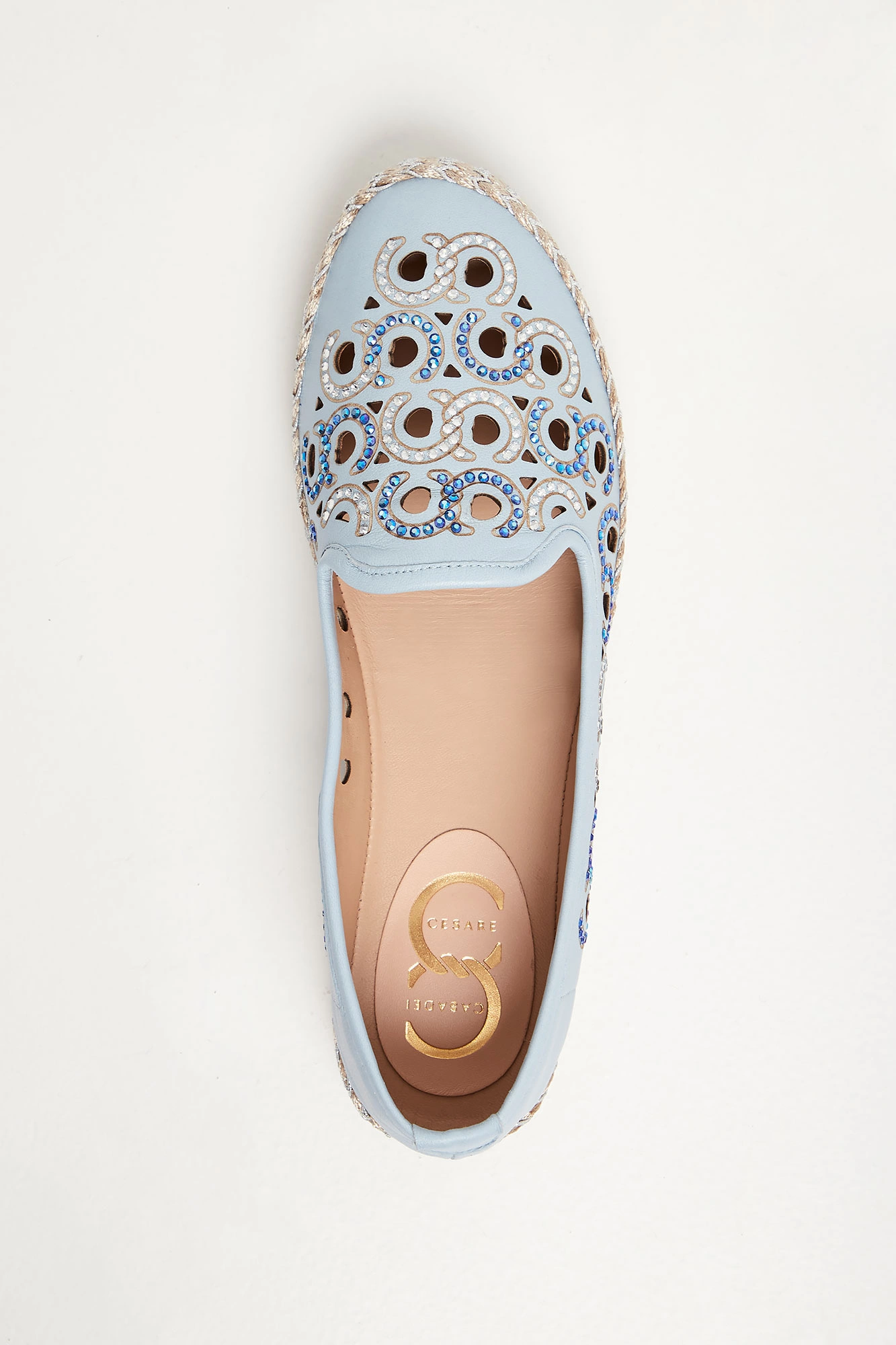 Espadryle marki Cesare Casadei w niebieskim kolorze. Na całości ozdobne dziurkowania i logo marki wykończone srebrnymi i niebieskimi cyrkoniami. Sygnowana wyściółka w beżowym kolorze. Podeszwa pleciona, wykończona metalizowana nicią. Po boku metalowa aplikacja z logo marki w srebrnym kolorze.