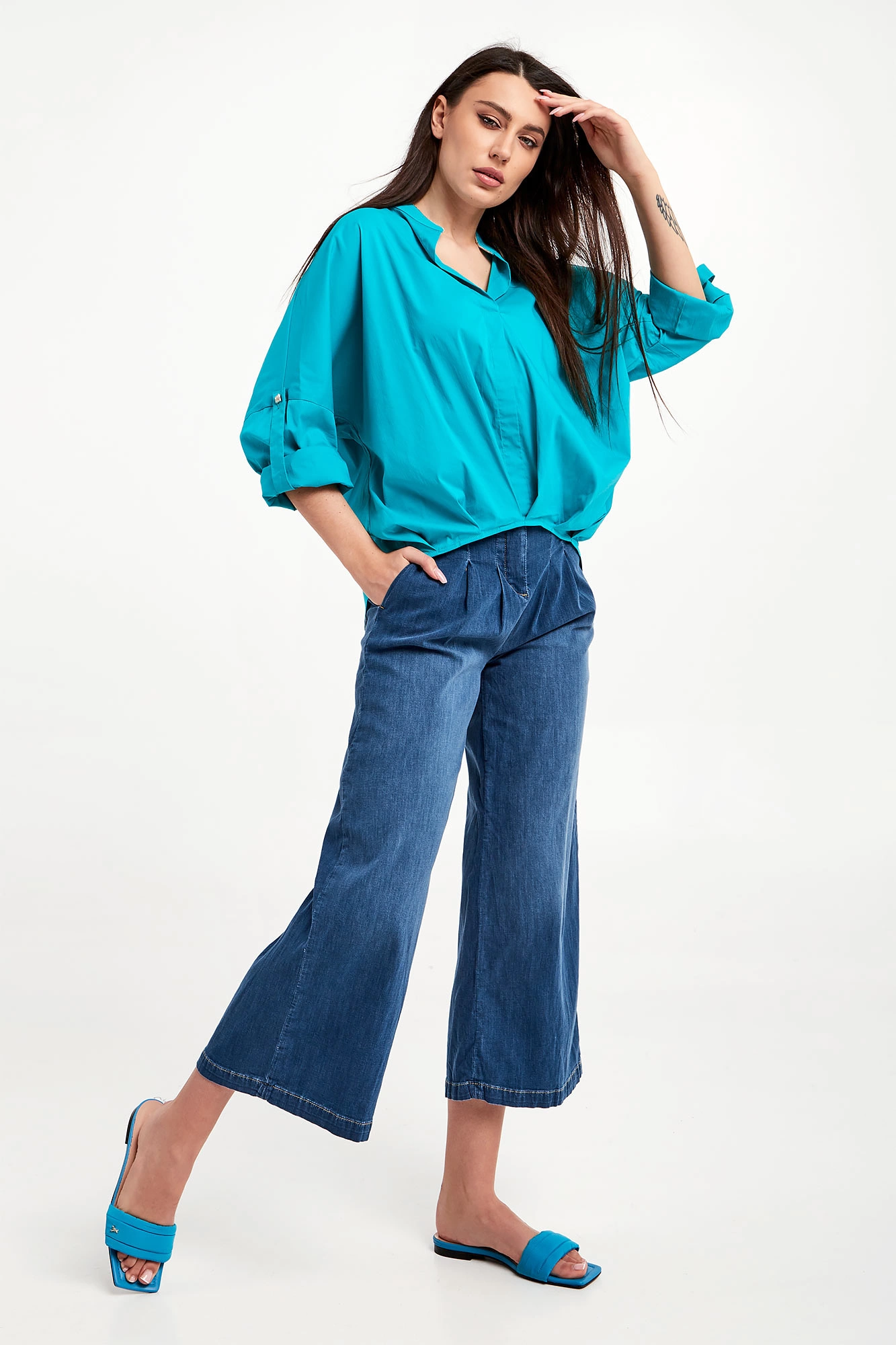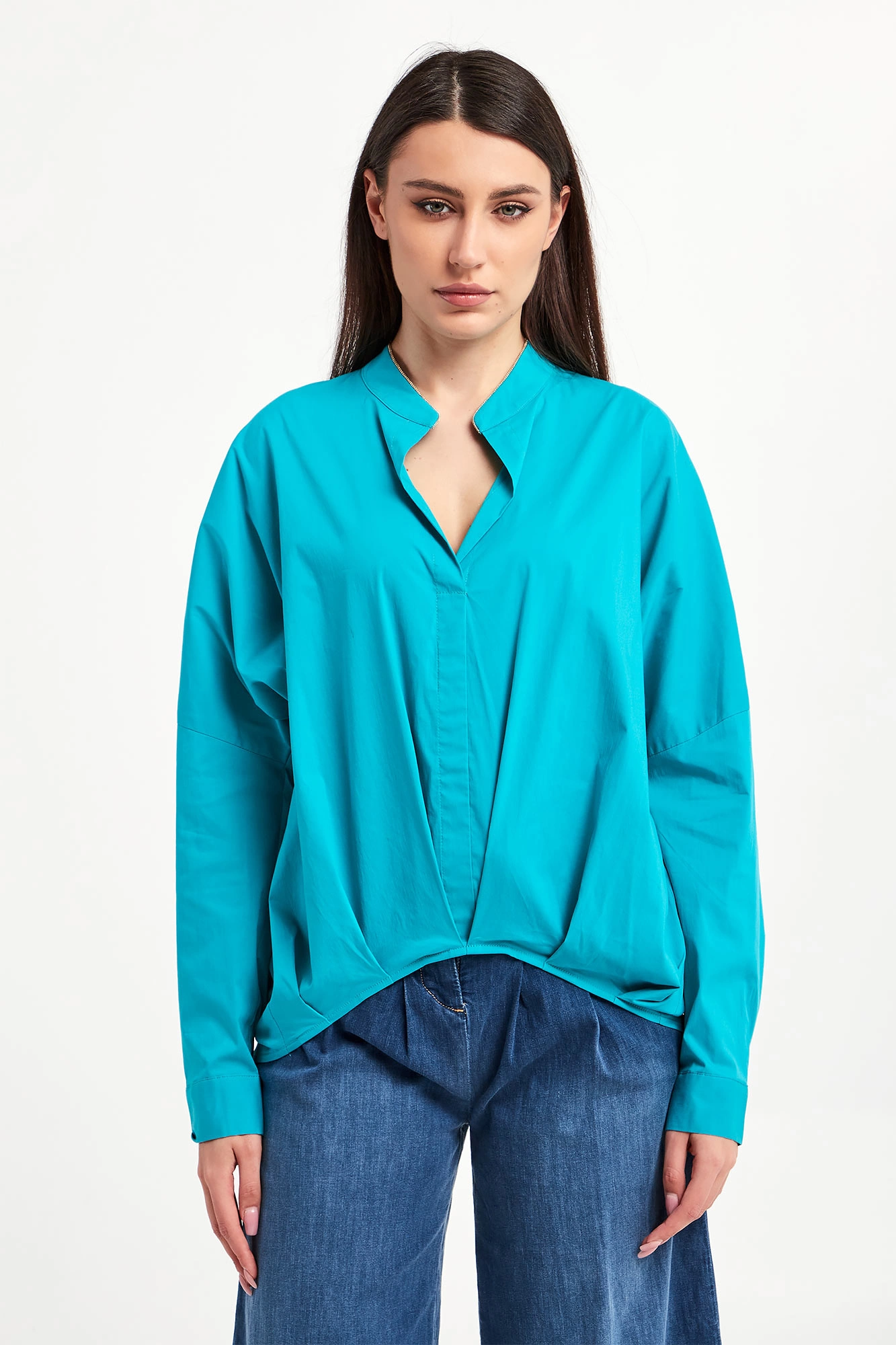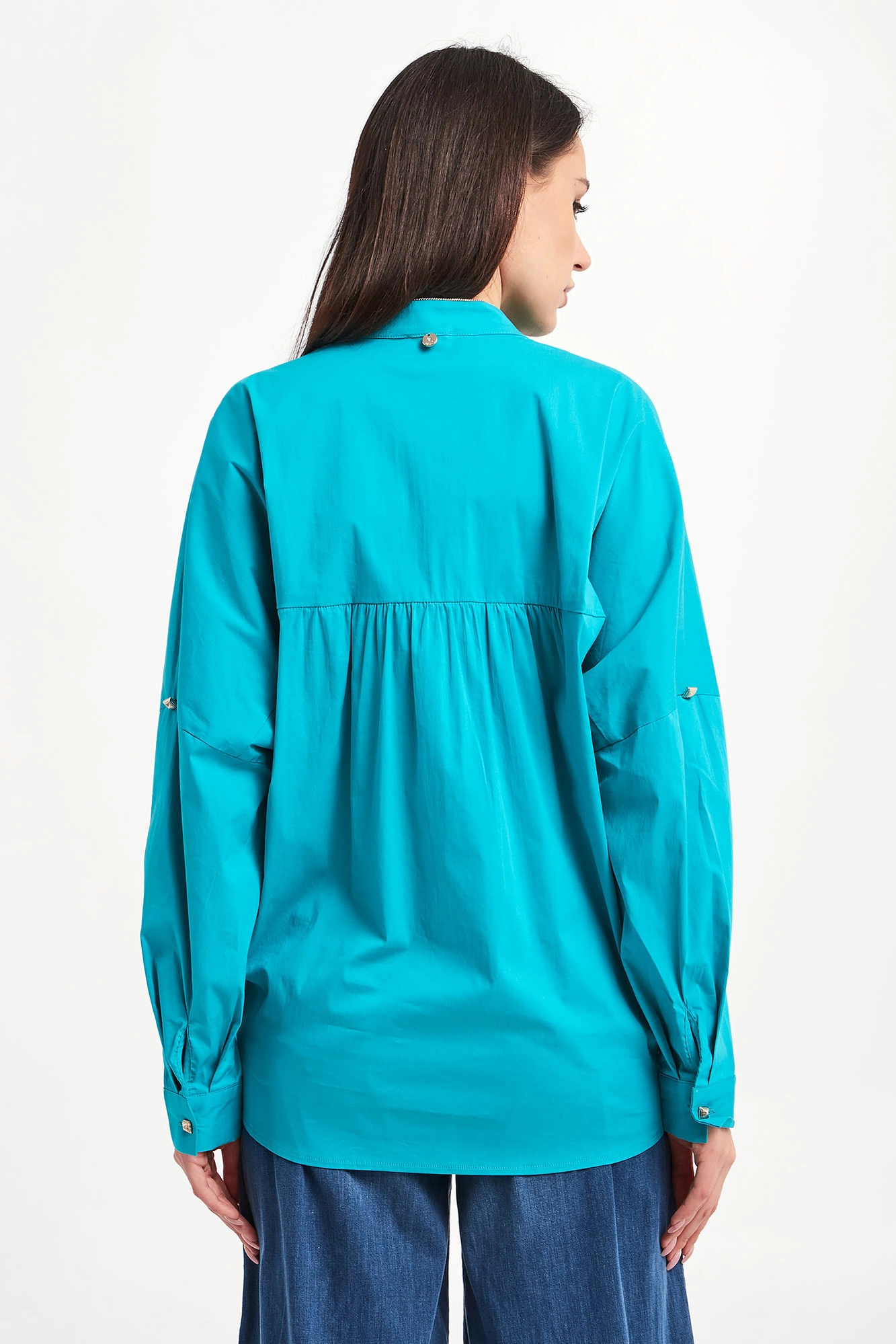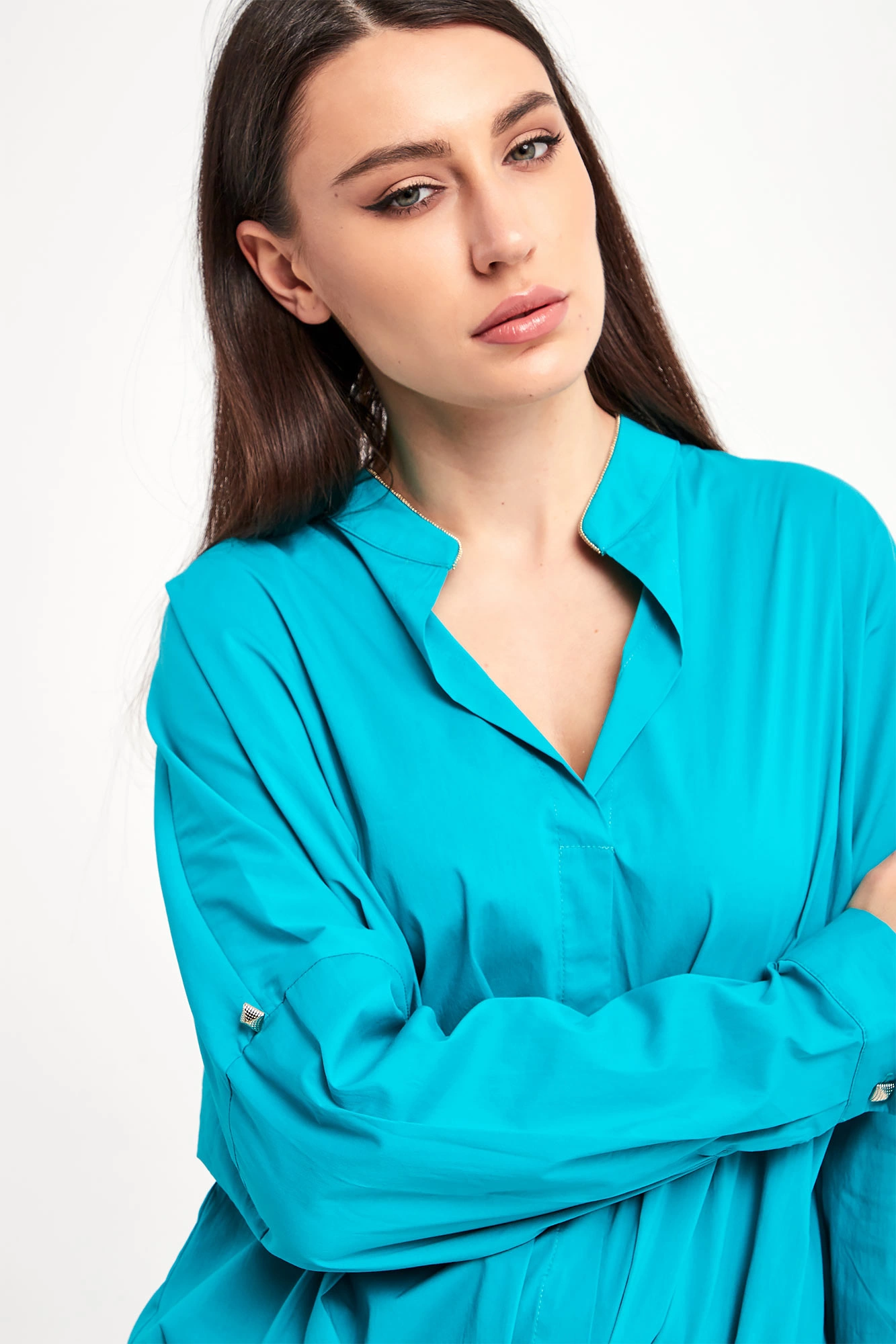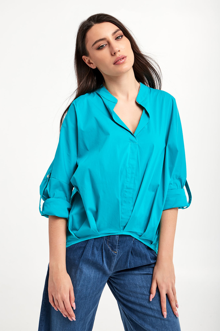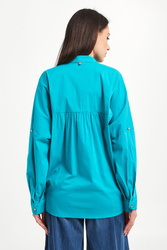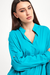 Bluzka marki Liu Jo w turkusowym kolorze. Fason relaxed fit. Dekolt typu v-neck. Kołnierz ze stójką ozdobiony złotą lamówką. Rękawy zakończone mankietami z możliwością podwinięcia. Asymetryczny dół ozdobiony zakładkami. Na plecach przeszycie. Na linii karku logowana zawieszka. Wykonana z bawełnianej, popelinowej tkaniny.