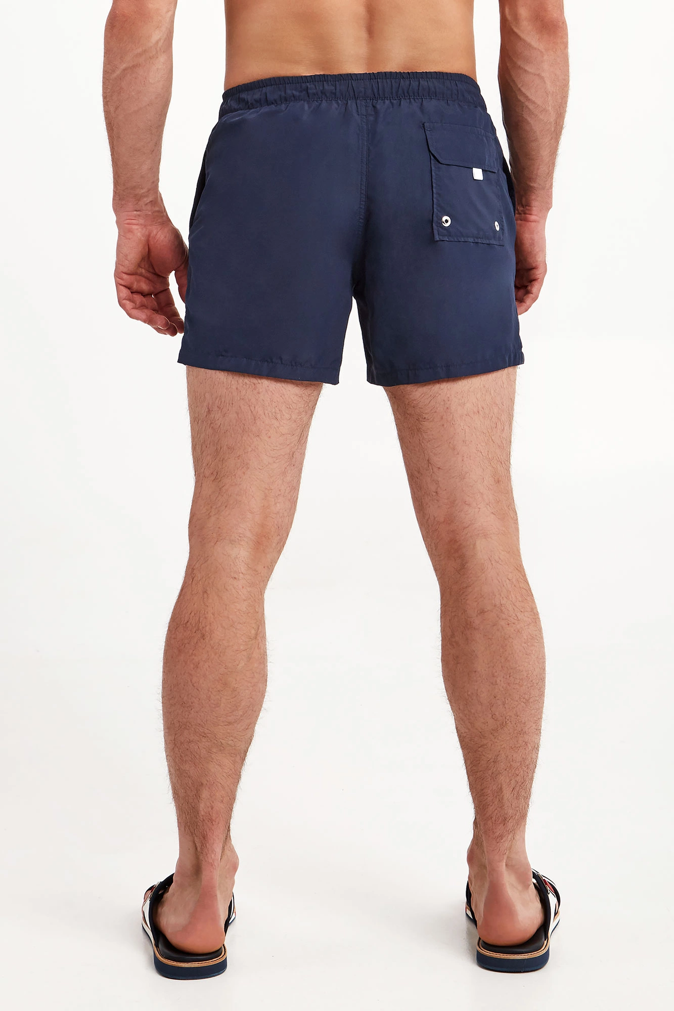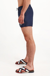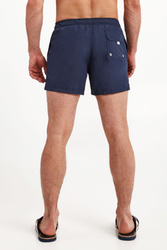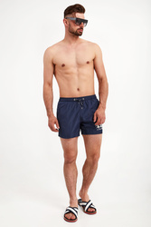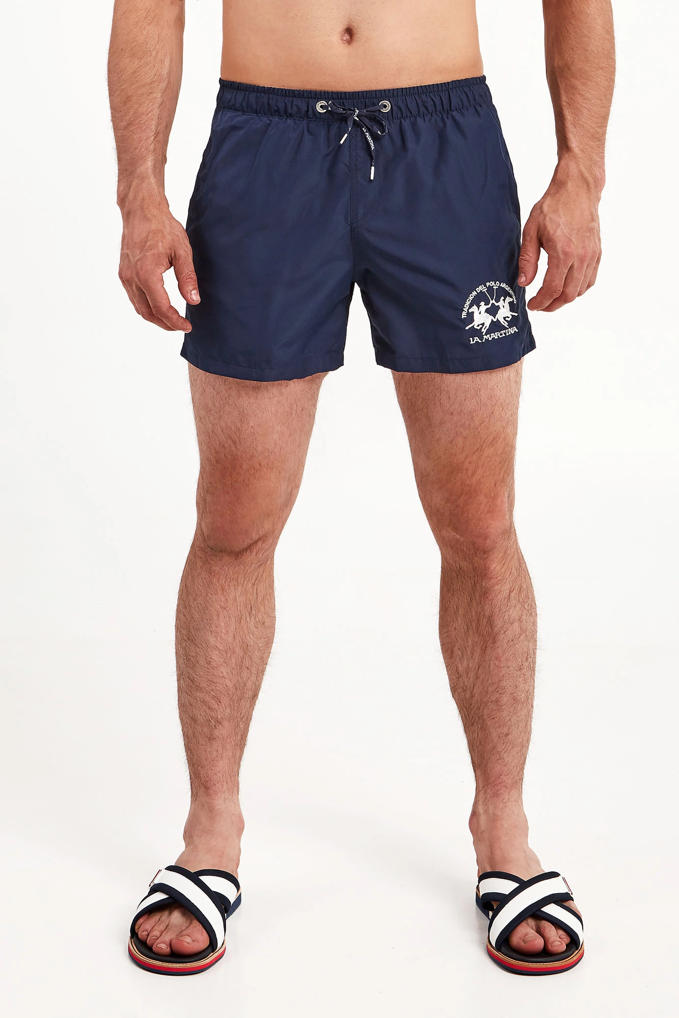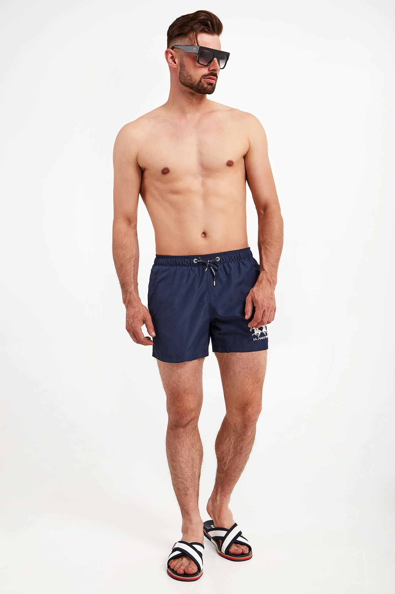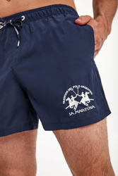 Szorty kąpielowe marki La Martina w granatowym kolorze. W pasie elastyczny ściągacz regulowany za pomocą sygnowanych, granatowych troczków. Po bokach kieszenie. Na lewej nogawce haft w postaci logo marki w białym kolorze. Z tyłu kieszonka z klapką zapinaną za pomocą rzepu.