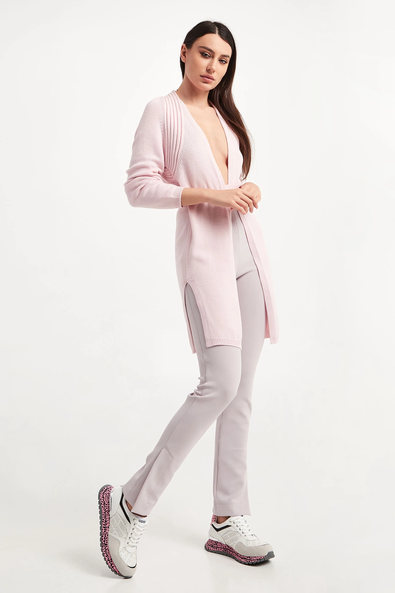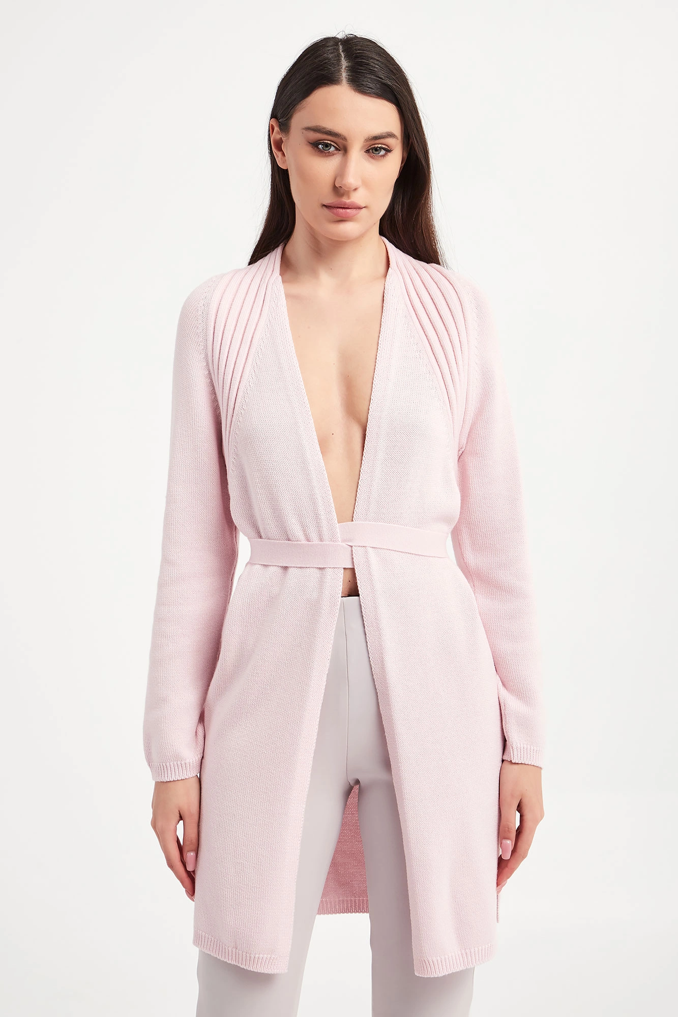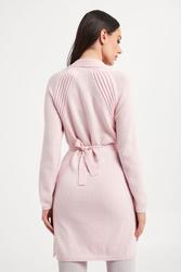 Kardigan marki Wolford w różowym kolorze. Fason typu regular fit. Rękawy i dół wykończone ściągaczem. Wiązany w talii za pomocą paska z tego samego materiału. Po boku rozcięcia. Na górze prążkowane paski. W całości wykonany z połączenia dziewiczej wełny z bawełną.