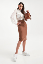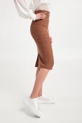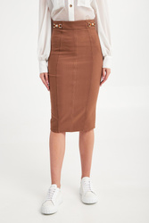 Spódnica marki Elisabetta Franchi w brązowym kolorze. Fason typu slim fit o długości midi. W pasie dekoracyjne, złote klamry. Z przodu i z tyłu przeszycia. Z tyłu zapinana na złoty zamek z sygnowaną zawieszką oraz rozcięcie na dole.
