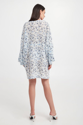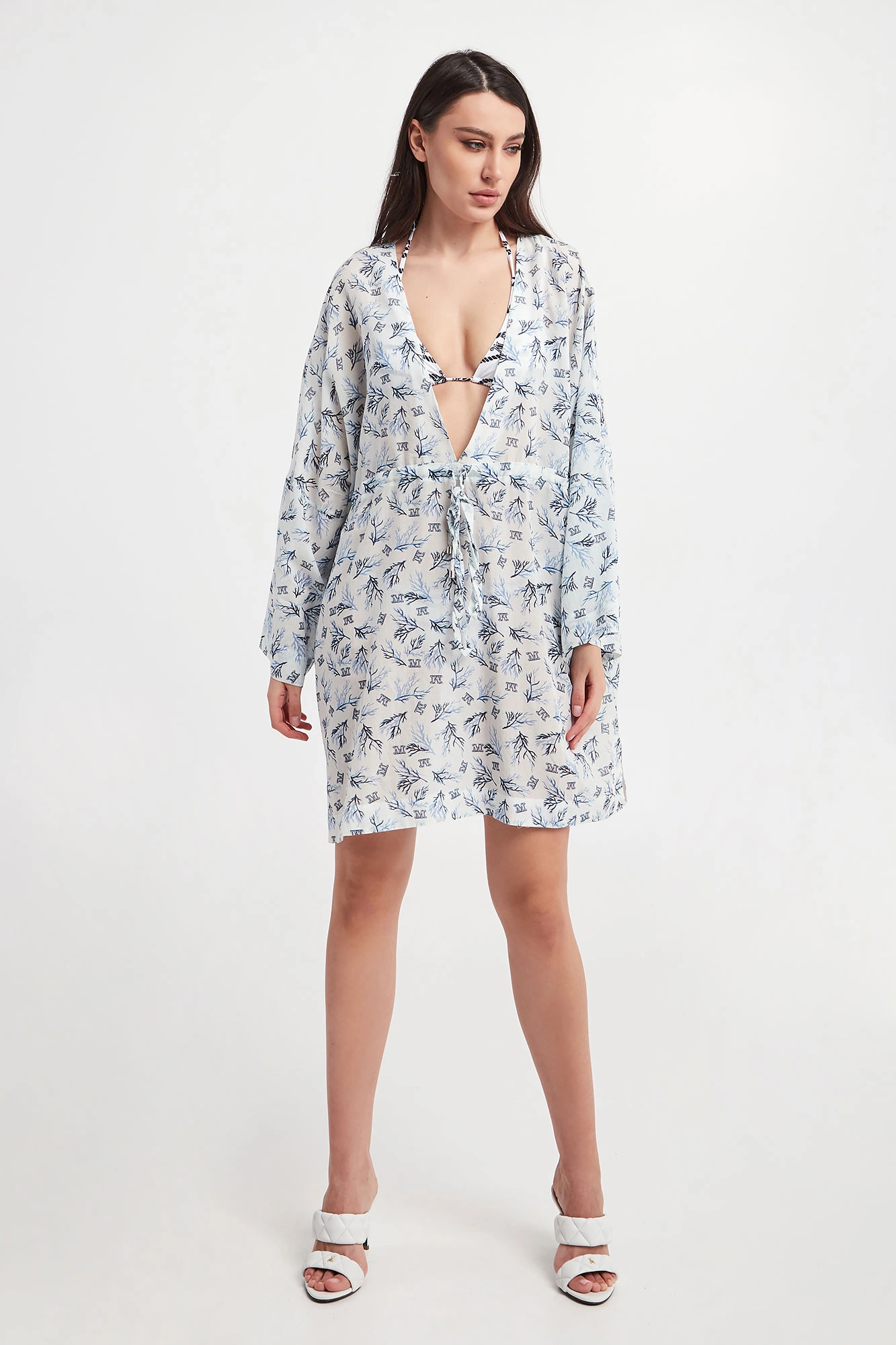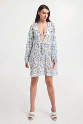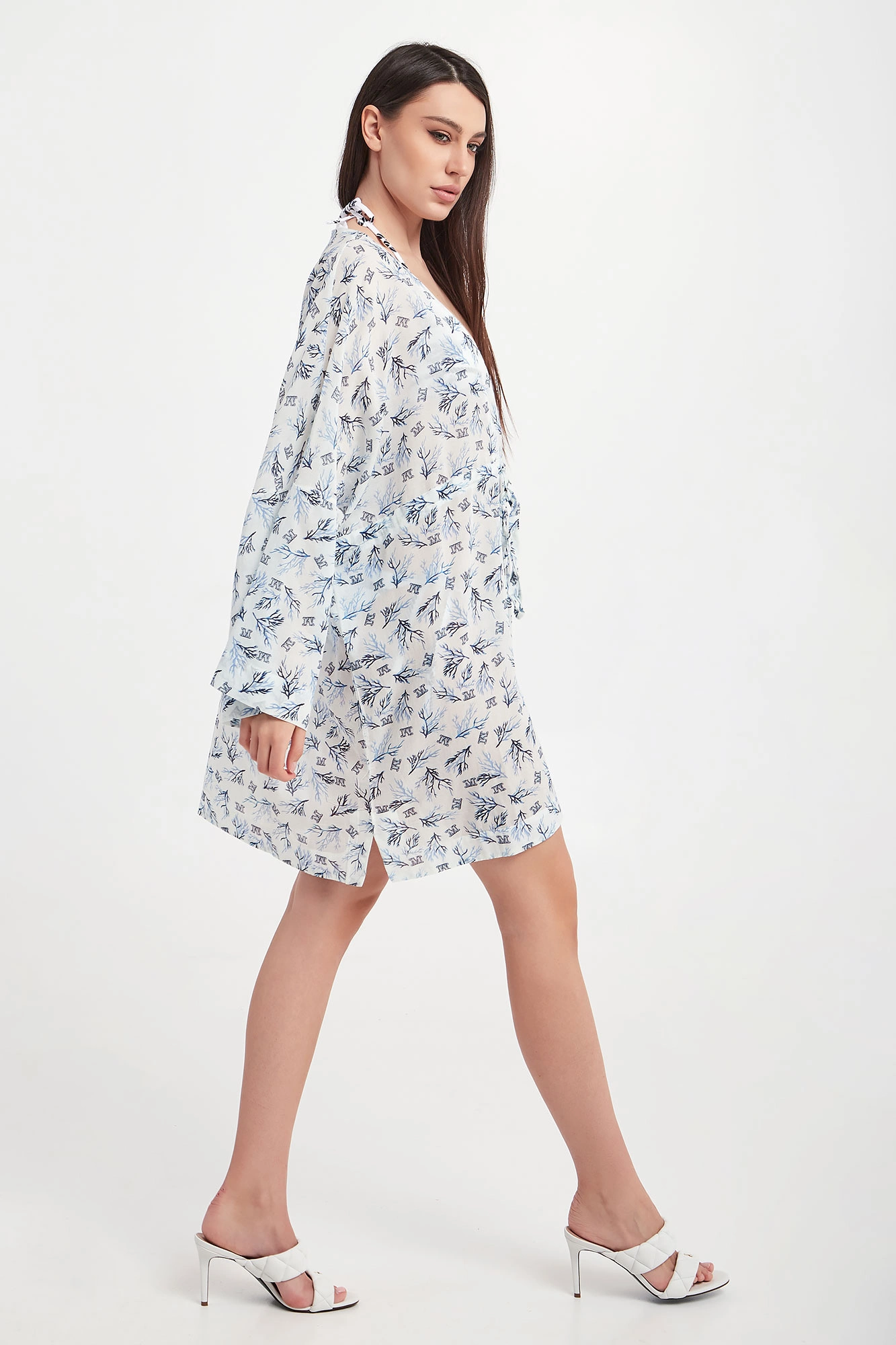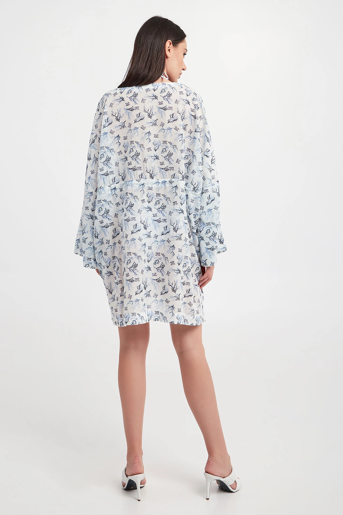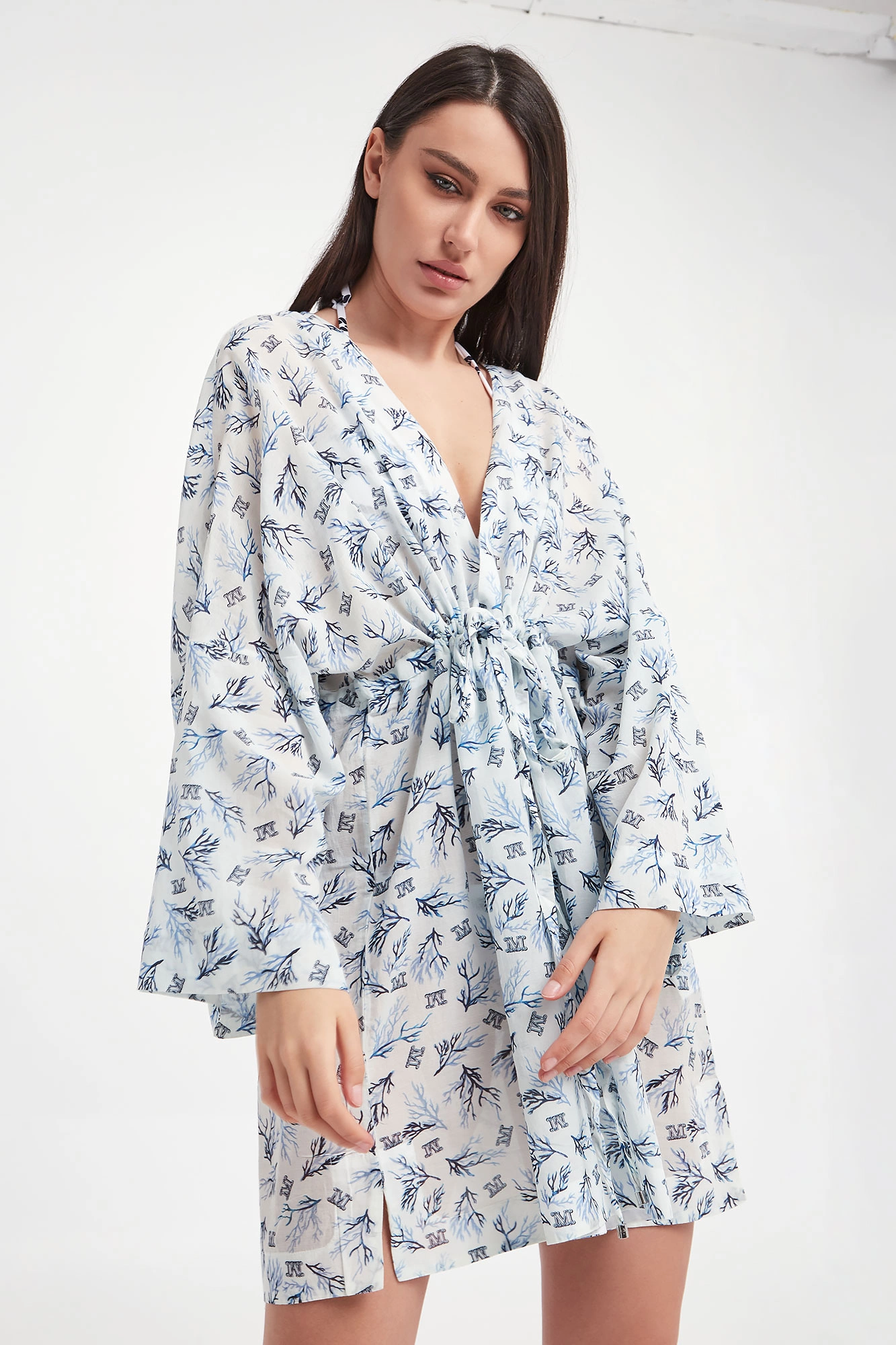 Sukienka marki Max Mara Beachwear w białym kolorze. Na całości granatowo-niebieski wzór z morskim motywem i monogramem marki. Fason relaxed fit, długość mini. Dekolt typu v-neck. W pasie ściągacz regulowany za pomocą troczków ze srebrnymi, sygnowanymi stoperami. Po bokach rozcięcia. Wykonana z mieszanki bawełny oraz wiskozy.