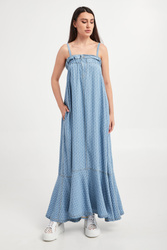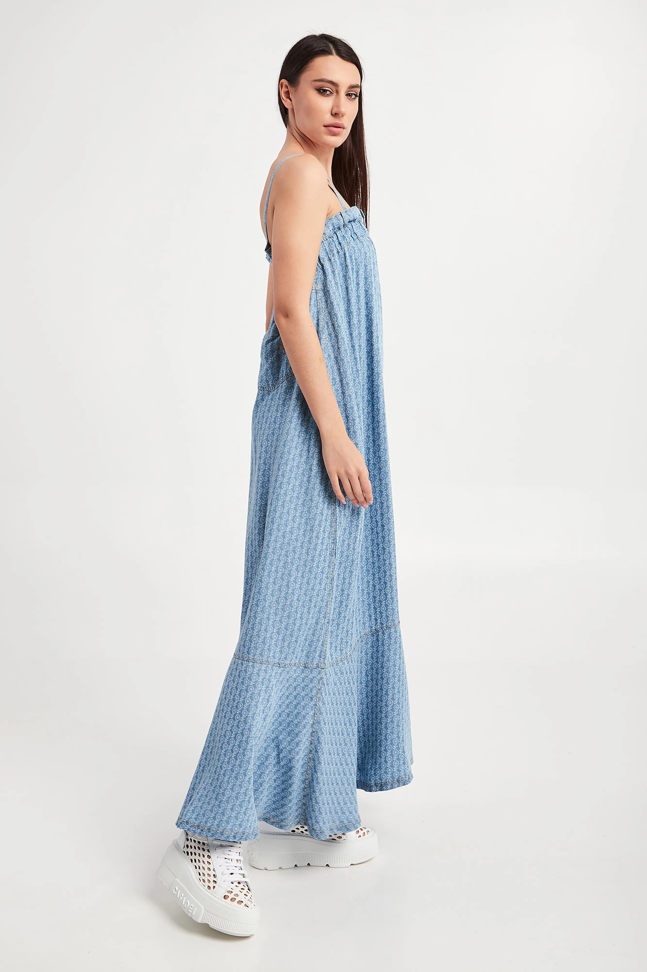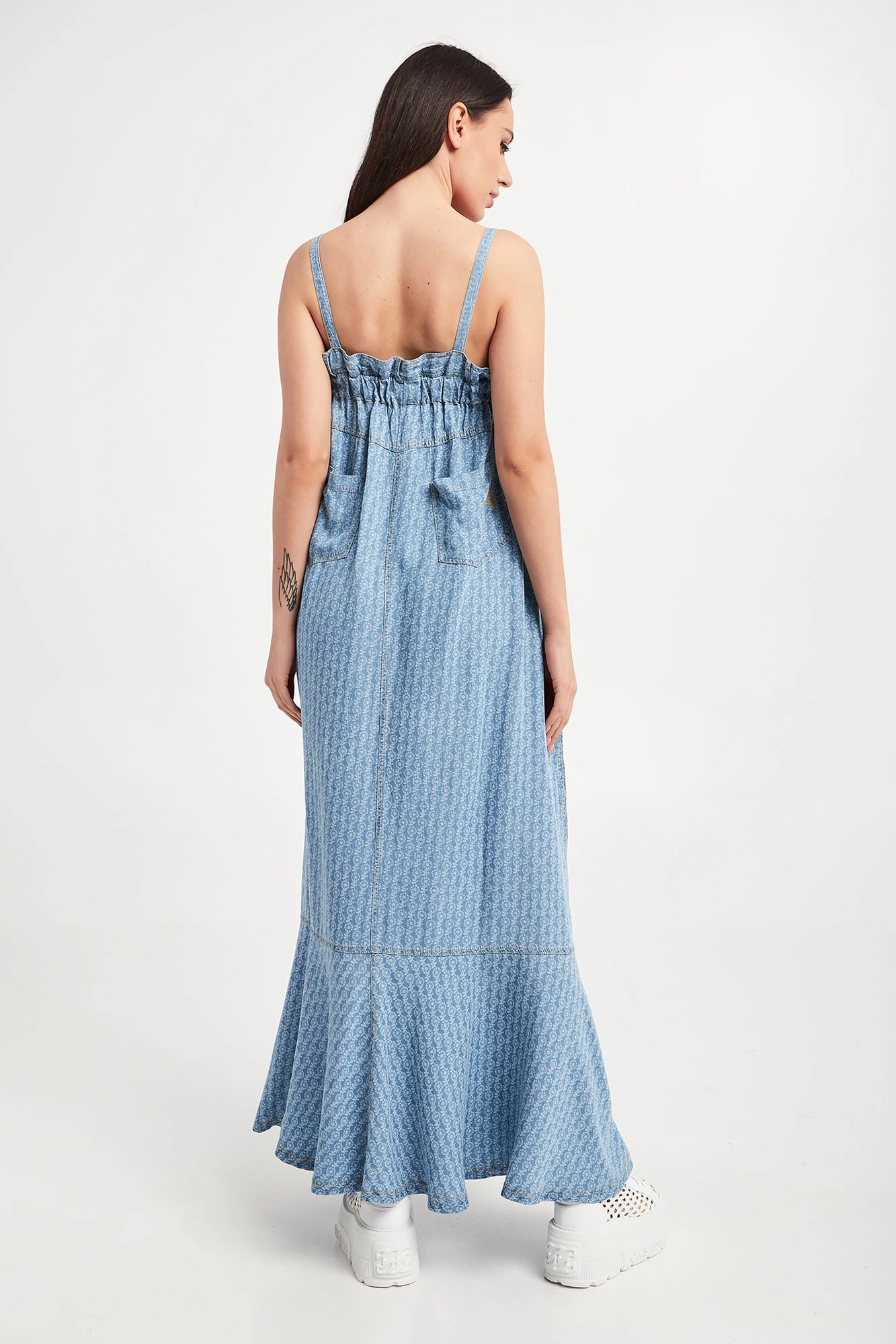 Sukienka marki Twinset w niebieskim kolorze. Fason relaxed fit o długości maxi. Na całości wzór w błękitnym kolorze. Model na cienkich ramiączkach. Nad biustem gumka. Z przodu zapinana na zamek zakryty pod patką oraz sygnowany guzik. Z tyłu dwie kieszonki. Na jednej haft w postaci logo i nazwy marki. Widoczne przeszycia. Dół wykończony falbaną. Po bokach kieszenie.
