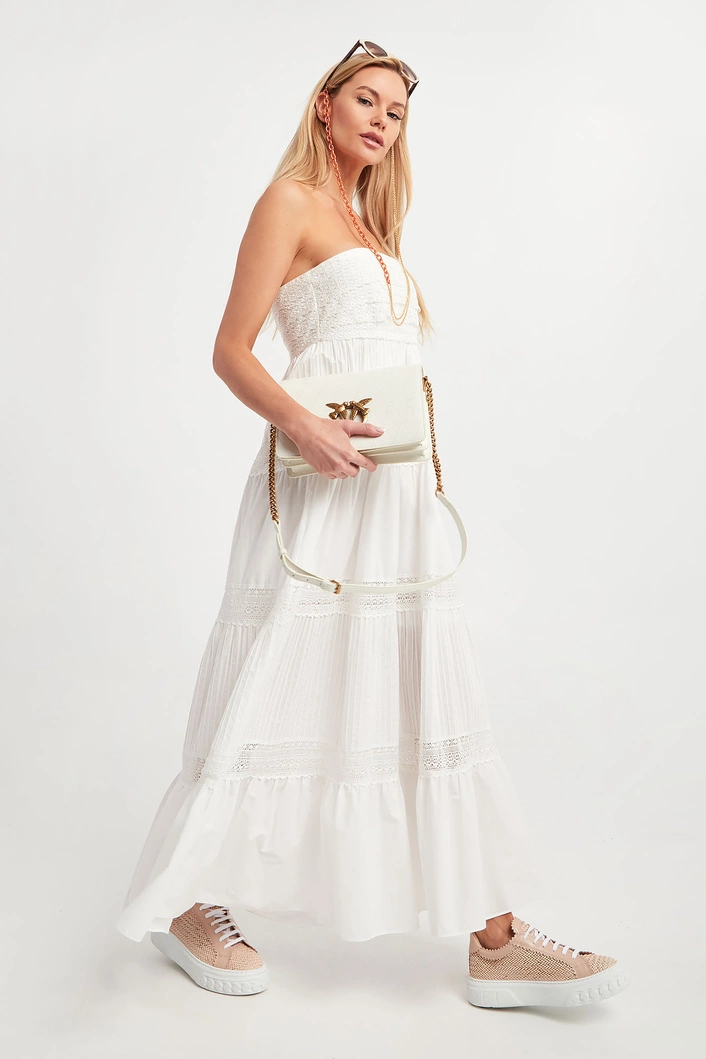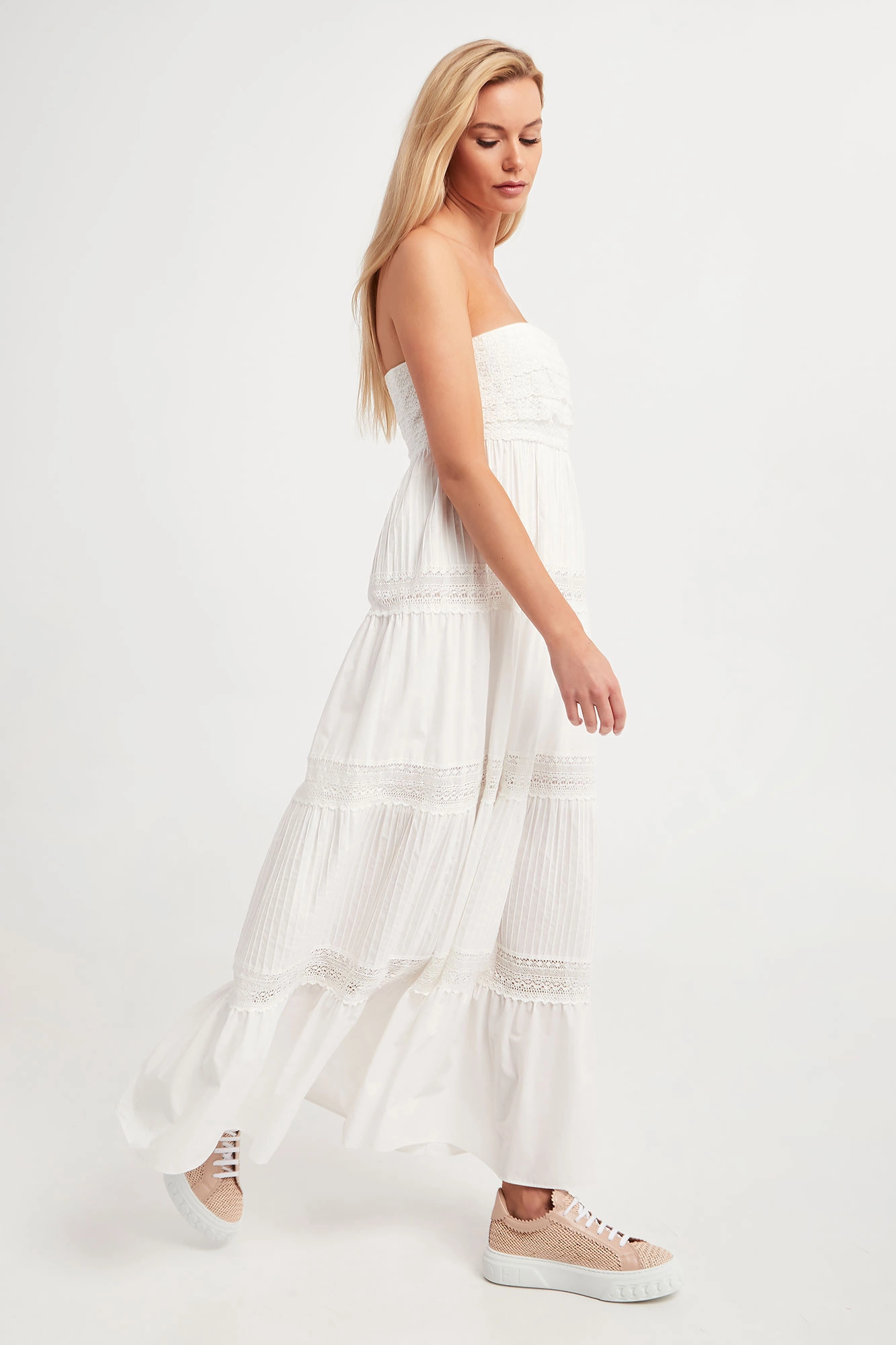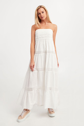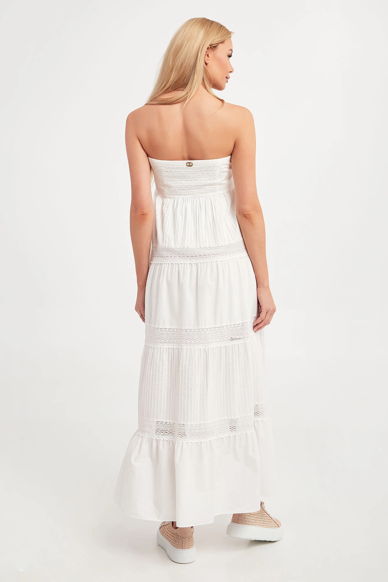 Sukienka marki Twinset w białym kolorze. Fason typu regular fit o długości maxi. Prosty dekolt. Góra w całości wykonana z koronki. W zestawie cienkie, regulowane ramiączka które można odczepić. Na całości przeszycia, koronki oraz marszczenia. Dół sukienki wykończony falbanką. Z tyłu metalowa aplikacja w postaci logo marki. Na boki kryty zamek. W całości wykonana z tkaniny bawełnianej.