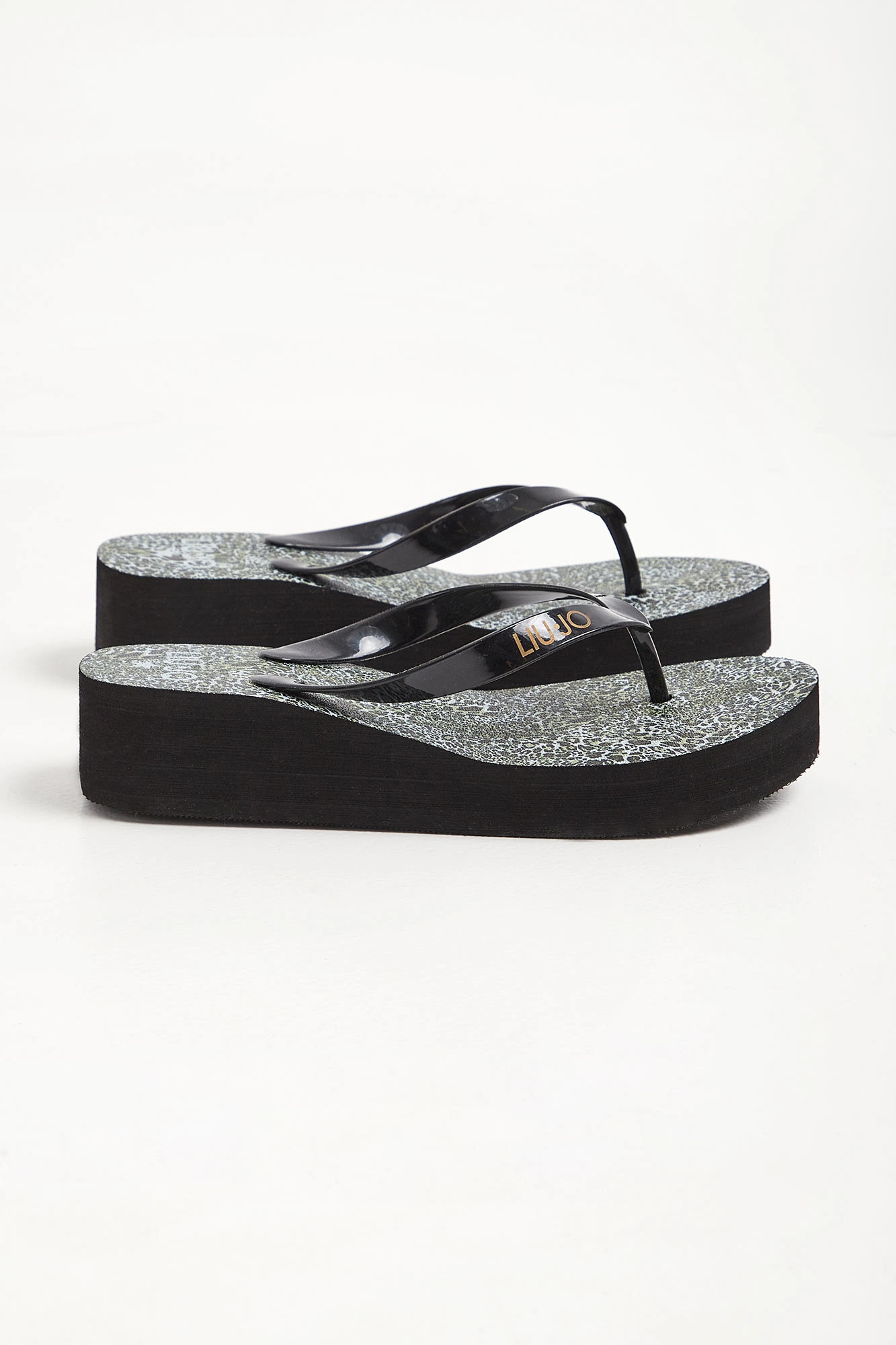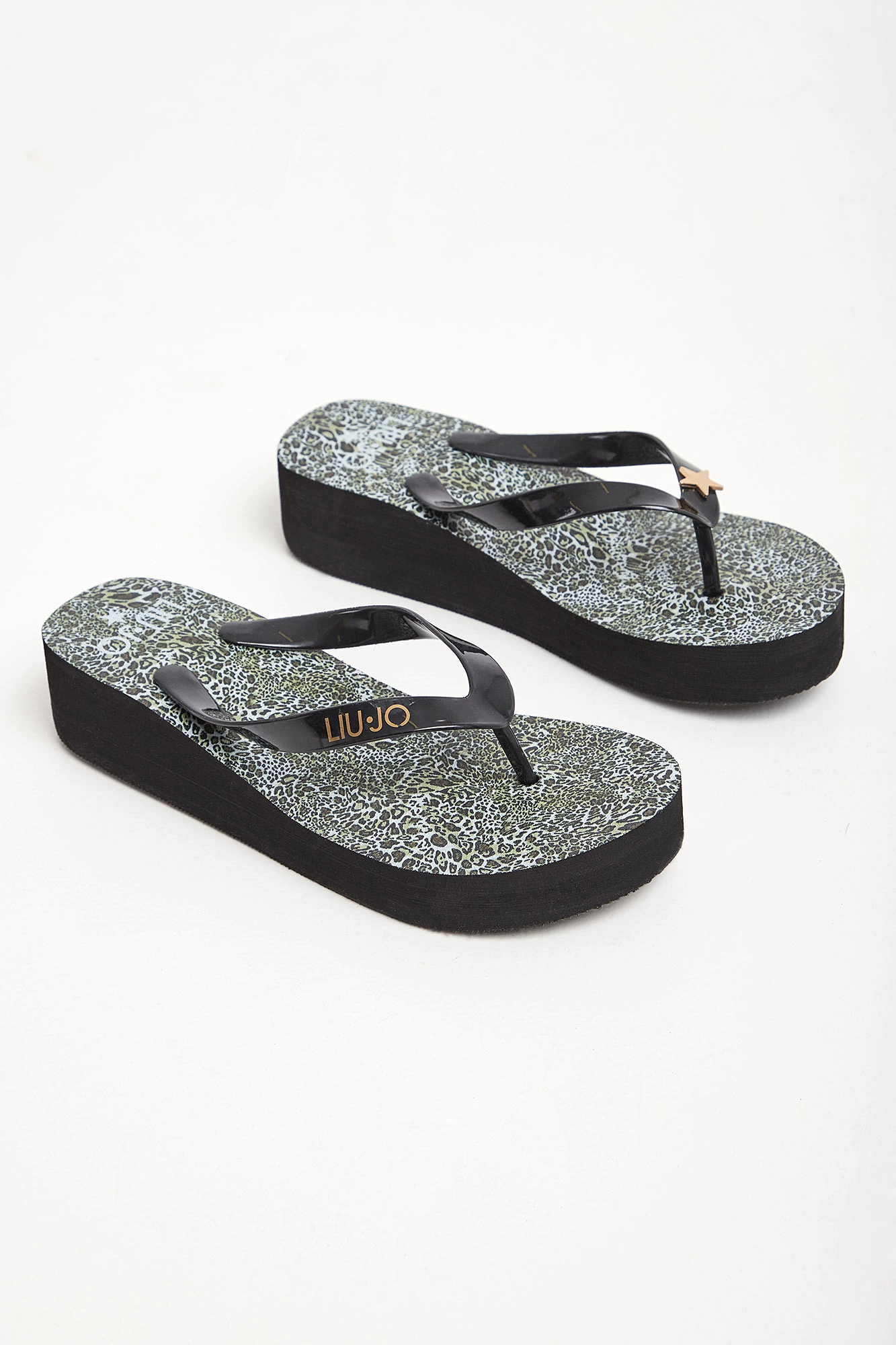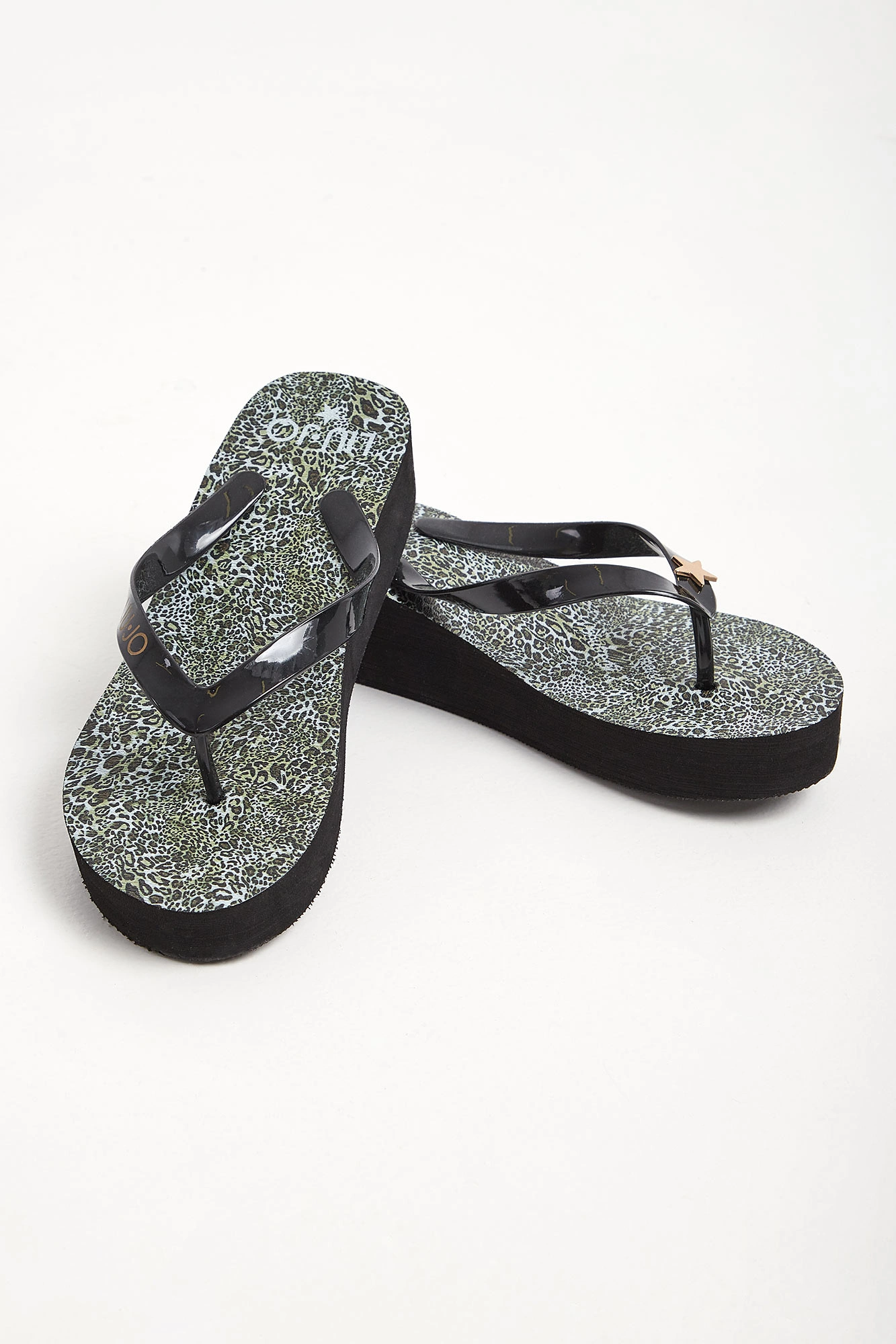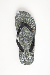 Japonki marki Liu Jo w czarnym kolorze. Na podeszwie wzór z motywem zwierzęcym. Na różowych paskach złoty nadruk z logo i metalowa aplikacja w kształcie gwiazdy. Lekkie i ponadczasowe.