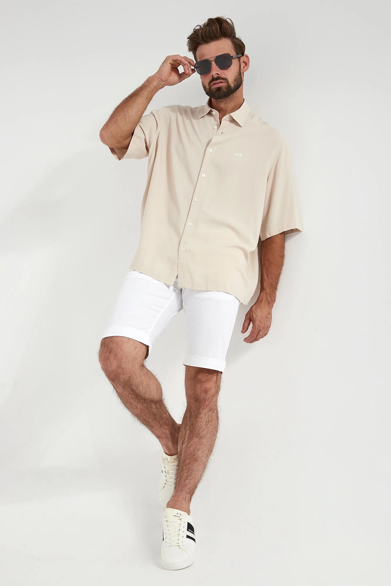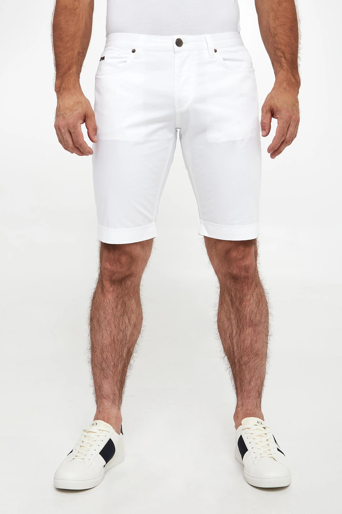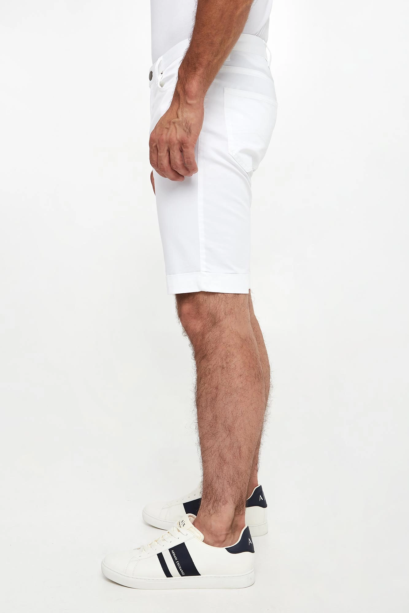 Spodenki marki Emporio Armani w białym kolorze. Fason typu slim fit. Zapiane za pomocą zamka i sygnowanego guzika. Model z pięcioma kieszeniami. Z przodu i z tyłu srebrne zawieszki z logo. W pasie szlufki. Nogawki zakończone podwijaną lamówką. Wykonane z bawełnianej tkaniny z domieszką elastycznych włókien.