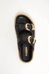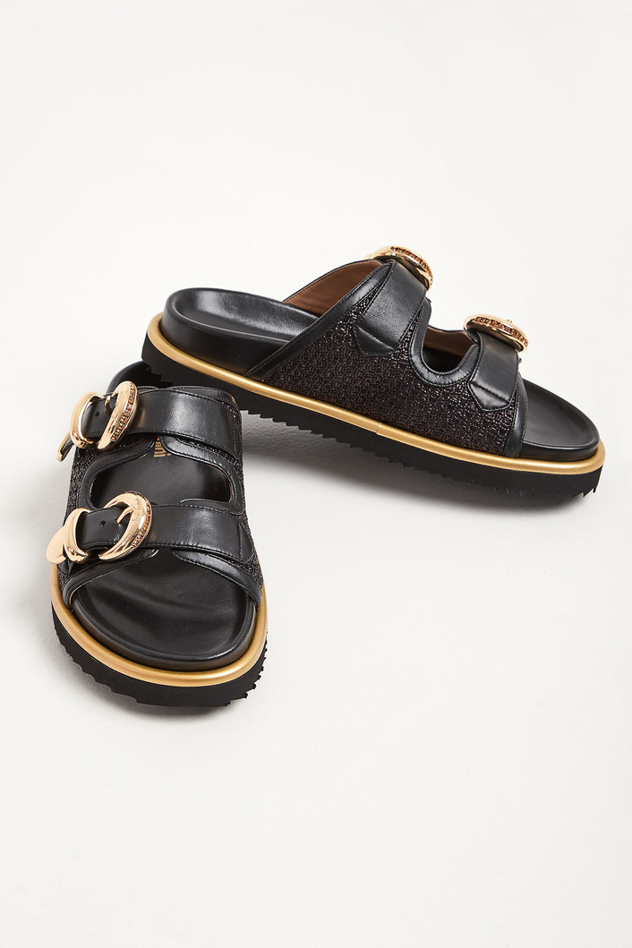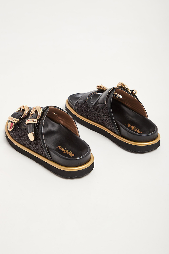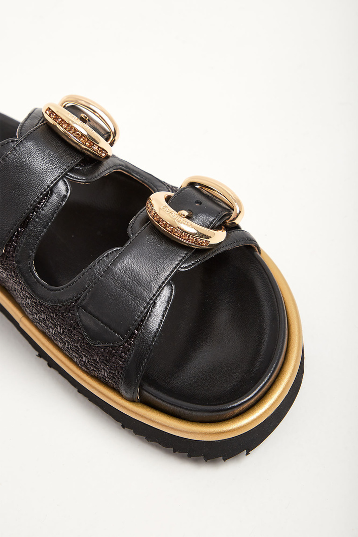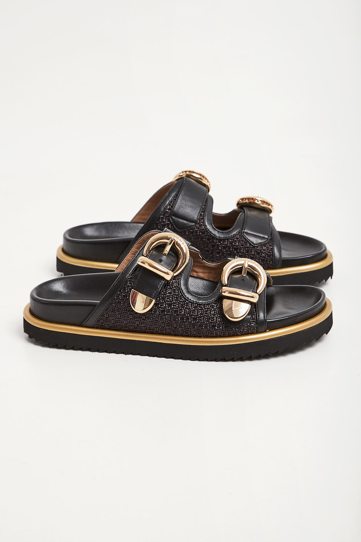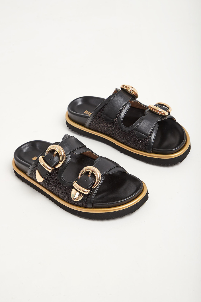 Klapki marki Baldinini w czarnym kolorze. Z przodu dwa szerokie pasy zapinane za pomocą tłoczonych, sygnowanych klamr i pleciona tkanina. Wysoka, profilowana podeszwa z nadrukiem nazwy marki w kontrastowym, złotym kolorze. Wykonane z naturalnej skóry.