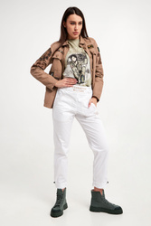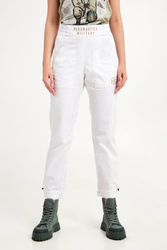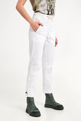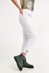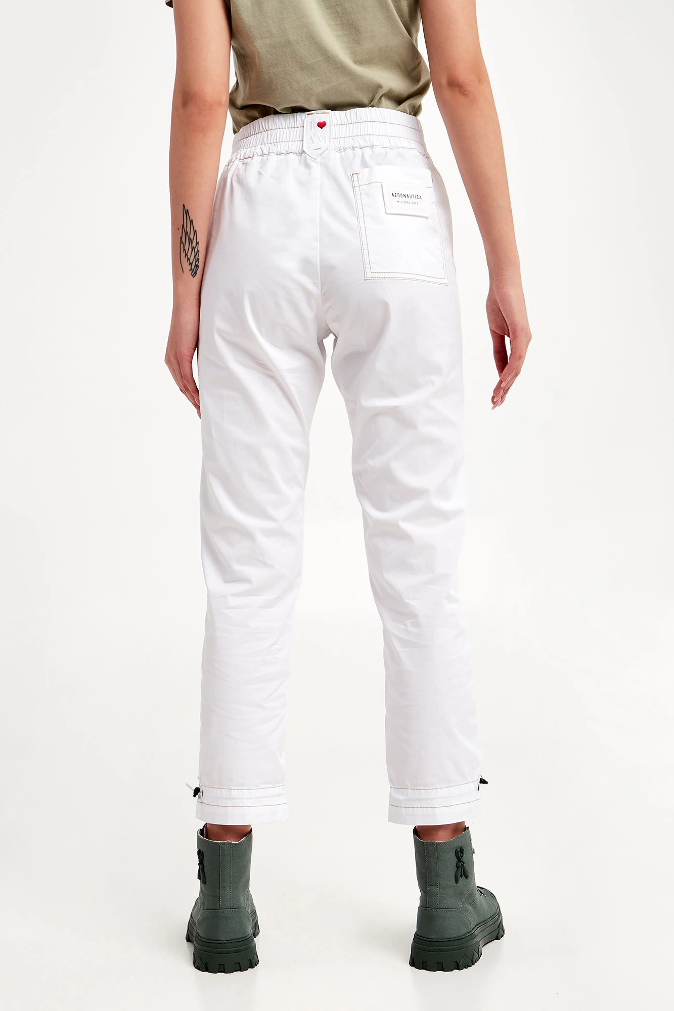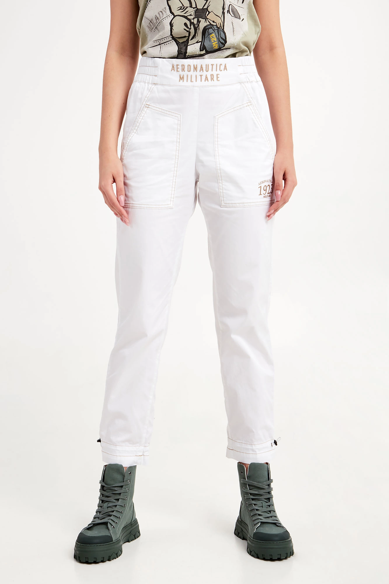 Spodnie marki Aeronautica Militare w białym kolorze. Fason regular. Po bokach naszyte kieszenie. W pasie elastyczne. Z przodu nadruk oraz haft w postaci nazwy marki. Nogawki regulowane za pomocą troczków z plastikowymi, czarnymi stoperami. Z tyłu kieszonka z naszywką w postaci nazwy marki.