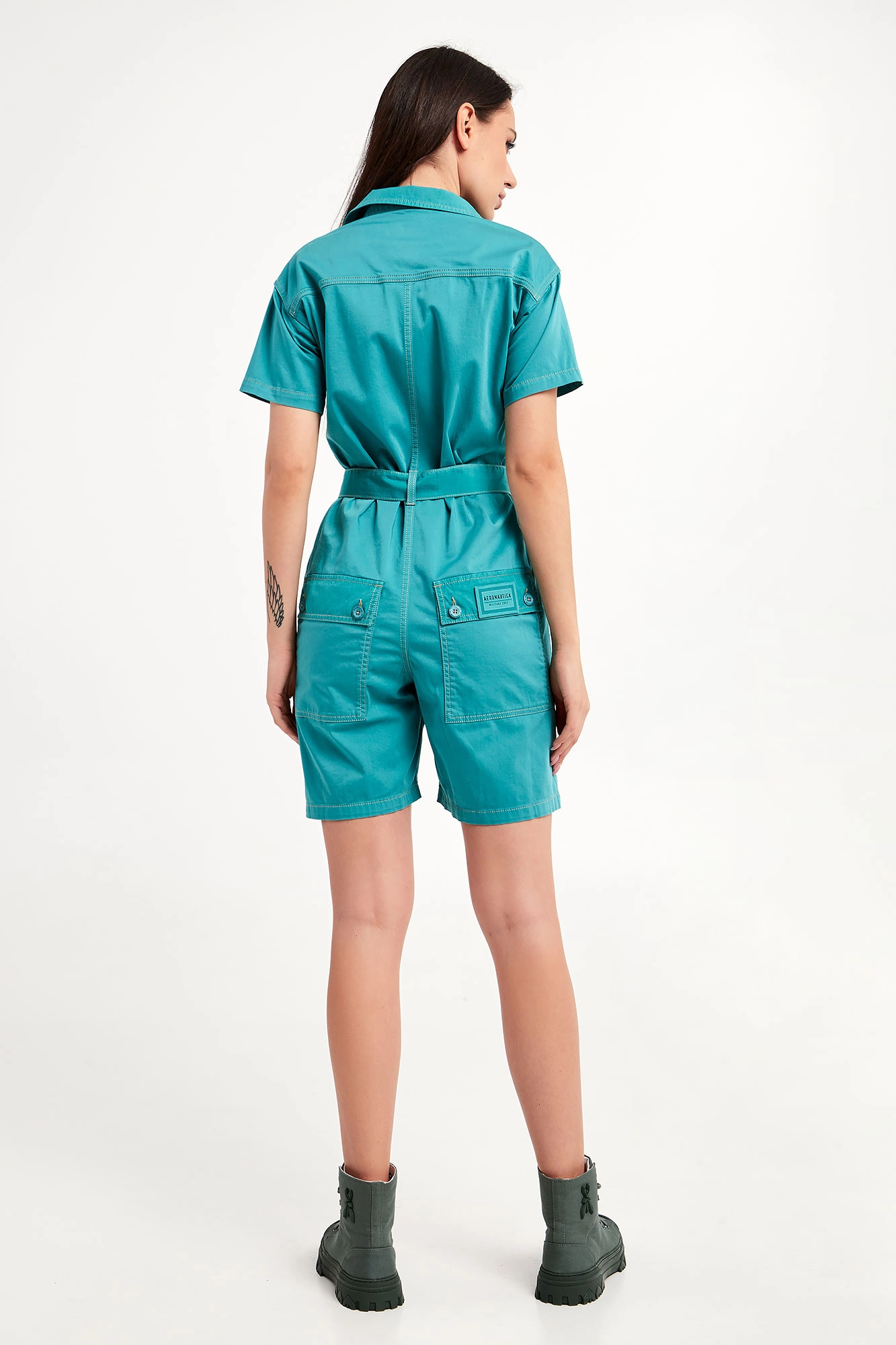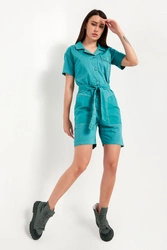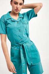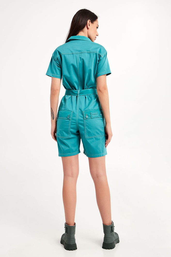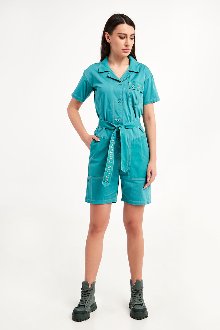 Kombinezon marki Aeronautica Militare w turkusowym kolorze. Fason typu regular fit. Model z krótkimi rękawkami. Dekolt wykończony klasycznym kołnierzykiem. Zapinany na duże, sygnowane guziki. Z przodu kieszonka z patką zapinana na duże sygnowane guziki. Na patce haft w postaci logo marki. Po bokach kieszenie. Nogawki regulowane za pomocą paska zapinanego na sygnowany guzik. W talii szlufki i pasek z haftem w postaci nazwy marki. Hafty oraz ozdobne przeszycia w beżowym kolorze.