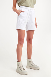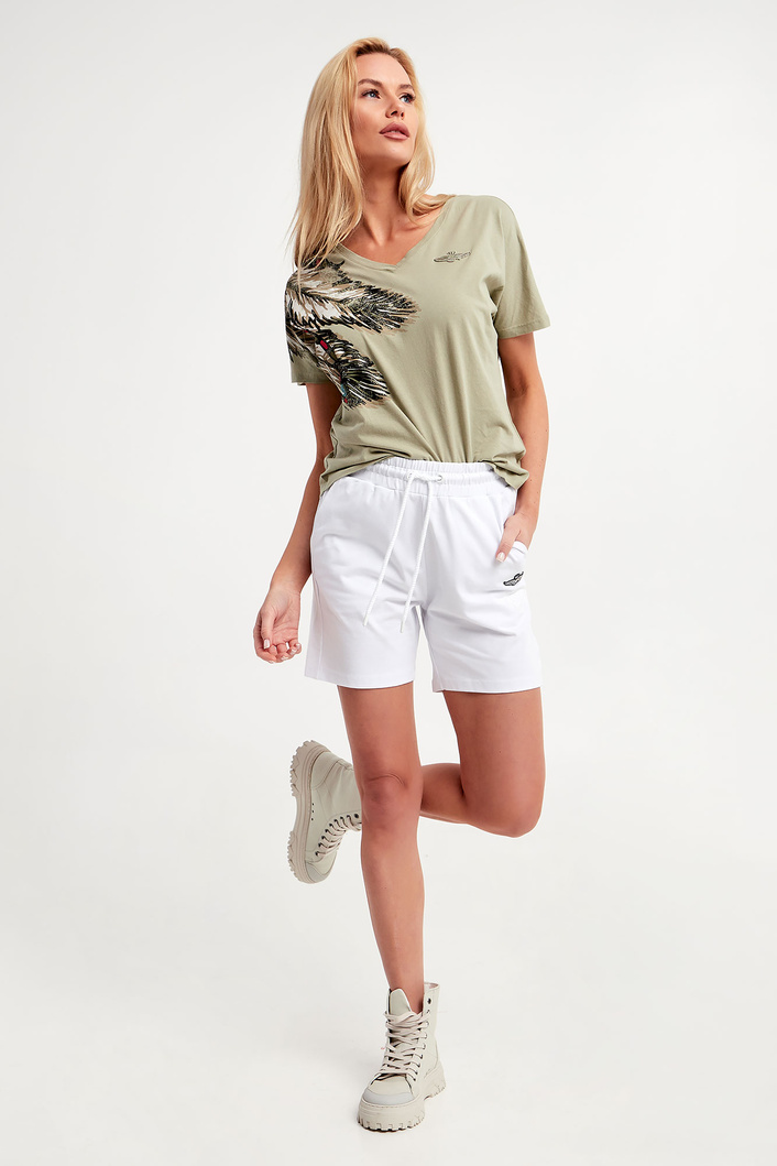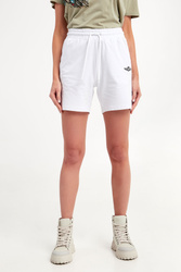 Spodenki marki Aeronautica Militare w białym kolorze. Fason typu slim. Z przodu haft i nadruk w postaci logo i nazwy marki. Po bokach kieszenie. W pasie elastyczny ściągacz regulowany za pomocą troczków. Nogawki wykończone lamówką. Wykonane z tkaniny bawełnianej z elastanem.