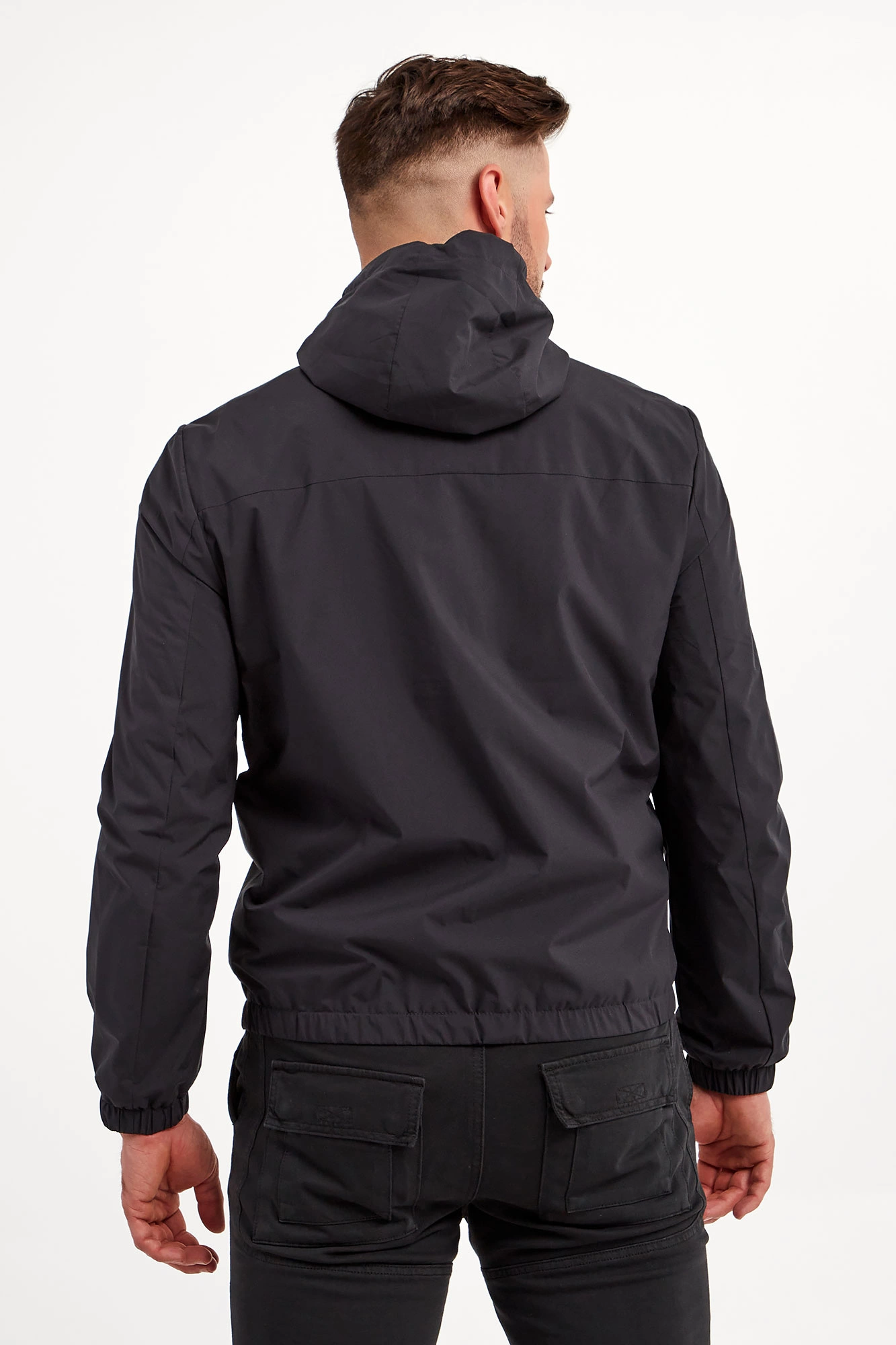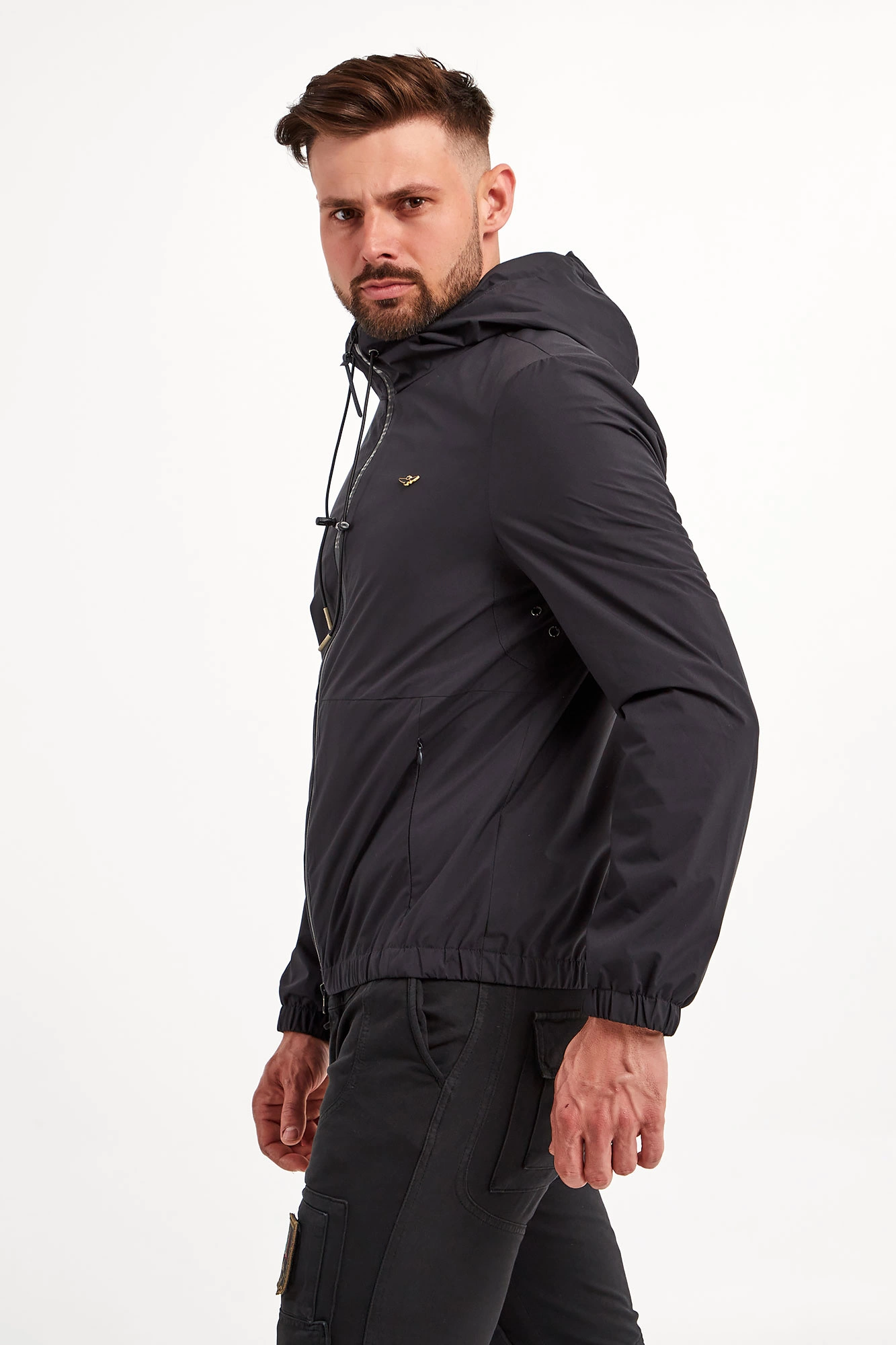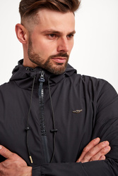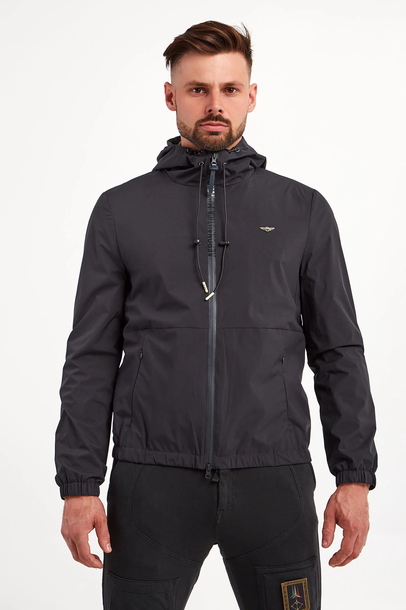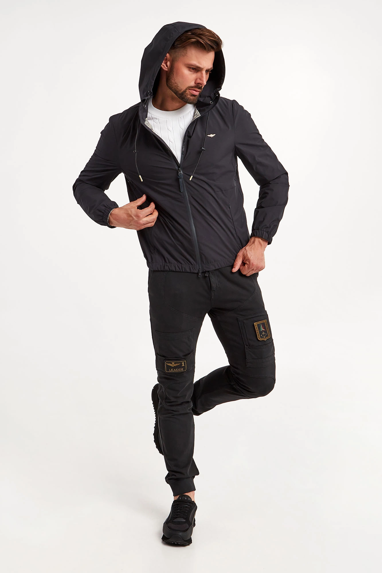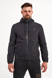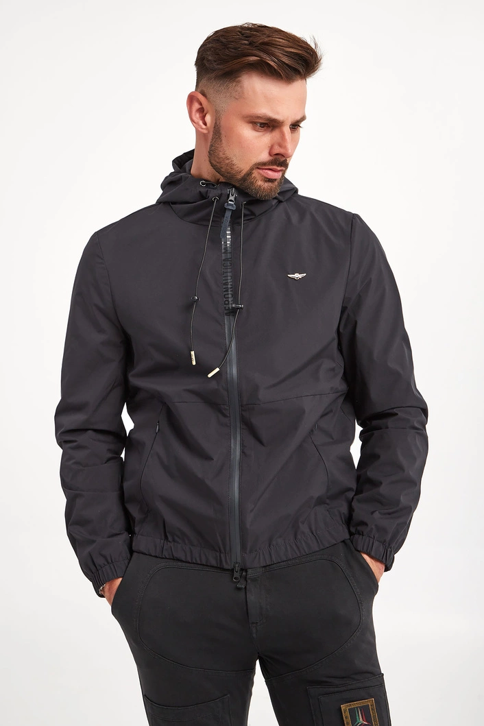 Kurtka z kapturem marki Aeronautica Militare w czarnym kolorze. Fason regular fit. Zapinana za pomocą dwustronnego zamka. Dwie boczne kieszenie zapinane na kryte zamki. Na froncie delikatna aplikacja w złoto-czarnym kolorze. Kaptur regulowany. Rękawy oraz dół zakończone ściągaczami. Wewnątrz wzorzysta podszewka.