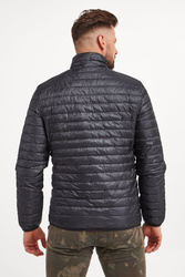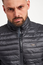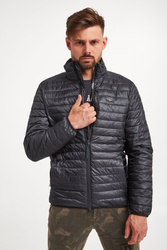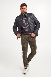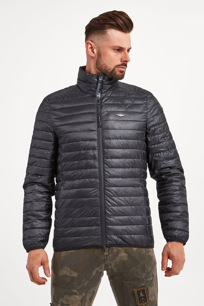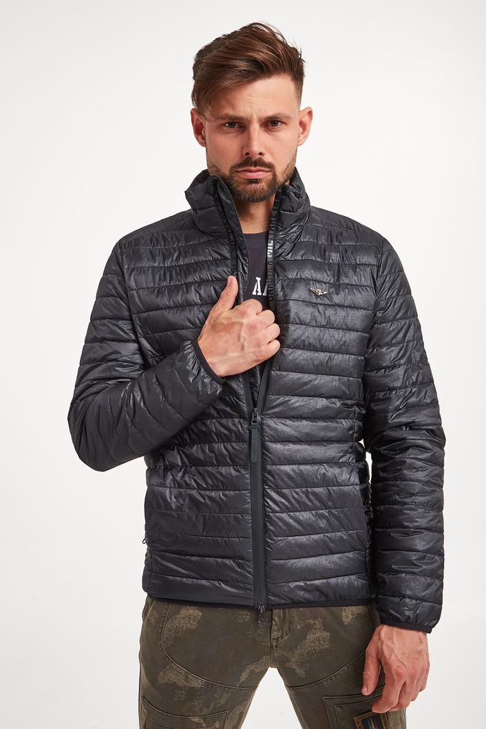 Pikowana kurtka marki Aeronautica Militare w granatowy kolorze. Fason typu regular fit. Na całości drobna kratka i efekt połysku. Ze stójką. Z przodu na piersi haft z nazwą i logo marki. Zapinana na dwukierunkowy ekspresowy zamek. Model z dwoma zapinanymi kieszeniami. Wewnątrz dodatkowe trzy kieszenie i sygnowana podszewka.