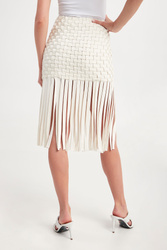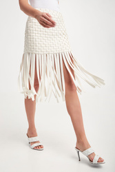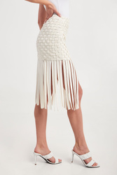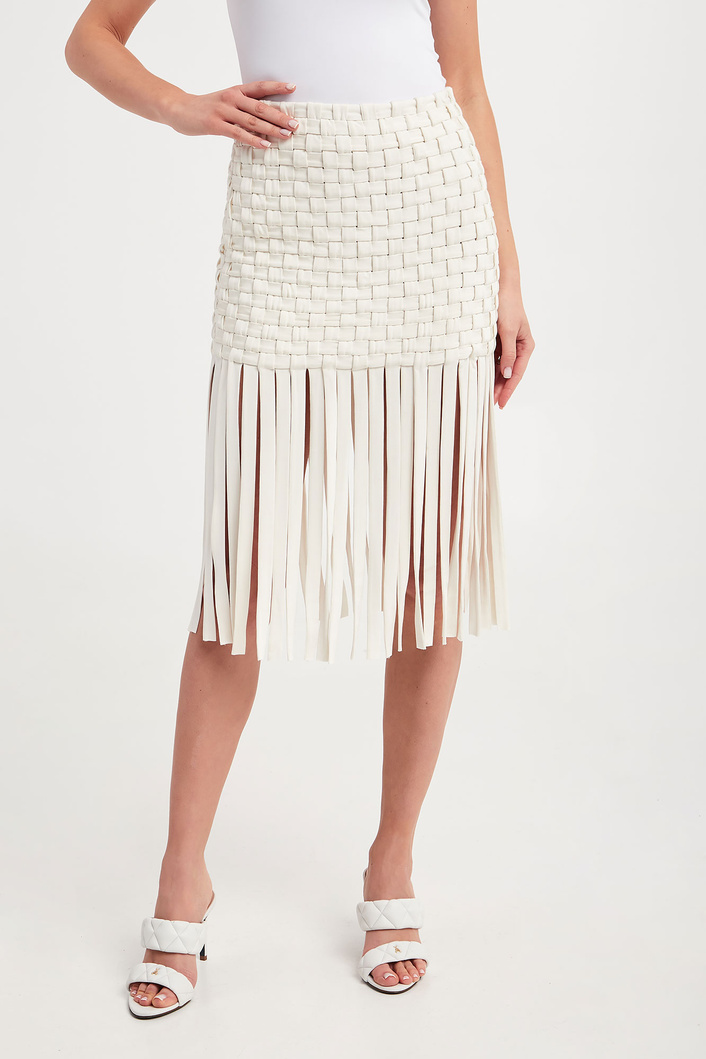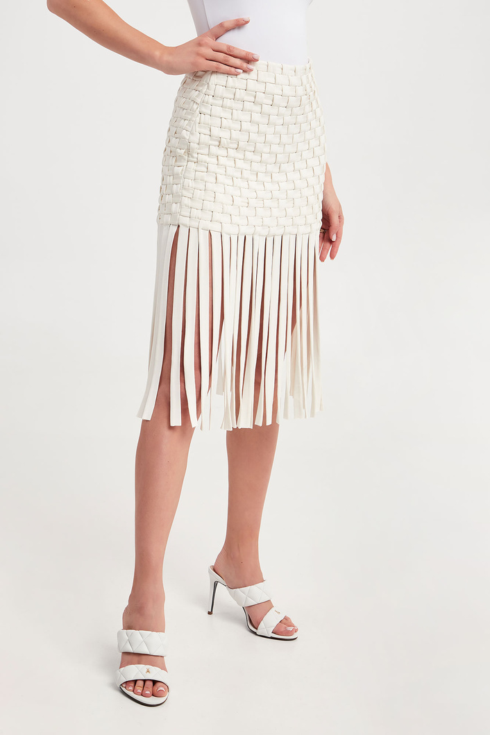 Spódnica marki Pinko w kolorze ecru. Fason slim. Całość pleciona, wykończona długimi, ozdobnymi wstążkami. Zapinana po boku za pomocą zamka błyskawicznego w srebrnym kolorze. Wykonana z grubej, wiskozowej tkaniny.