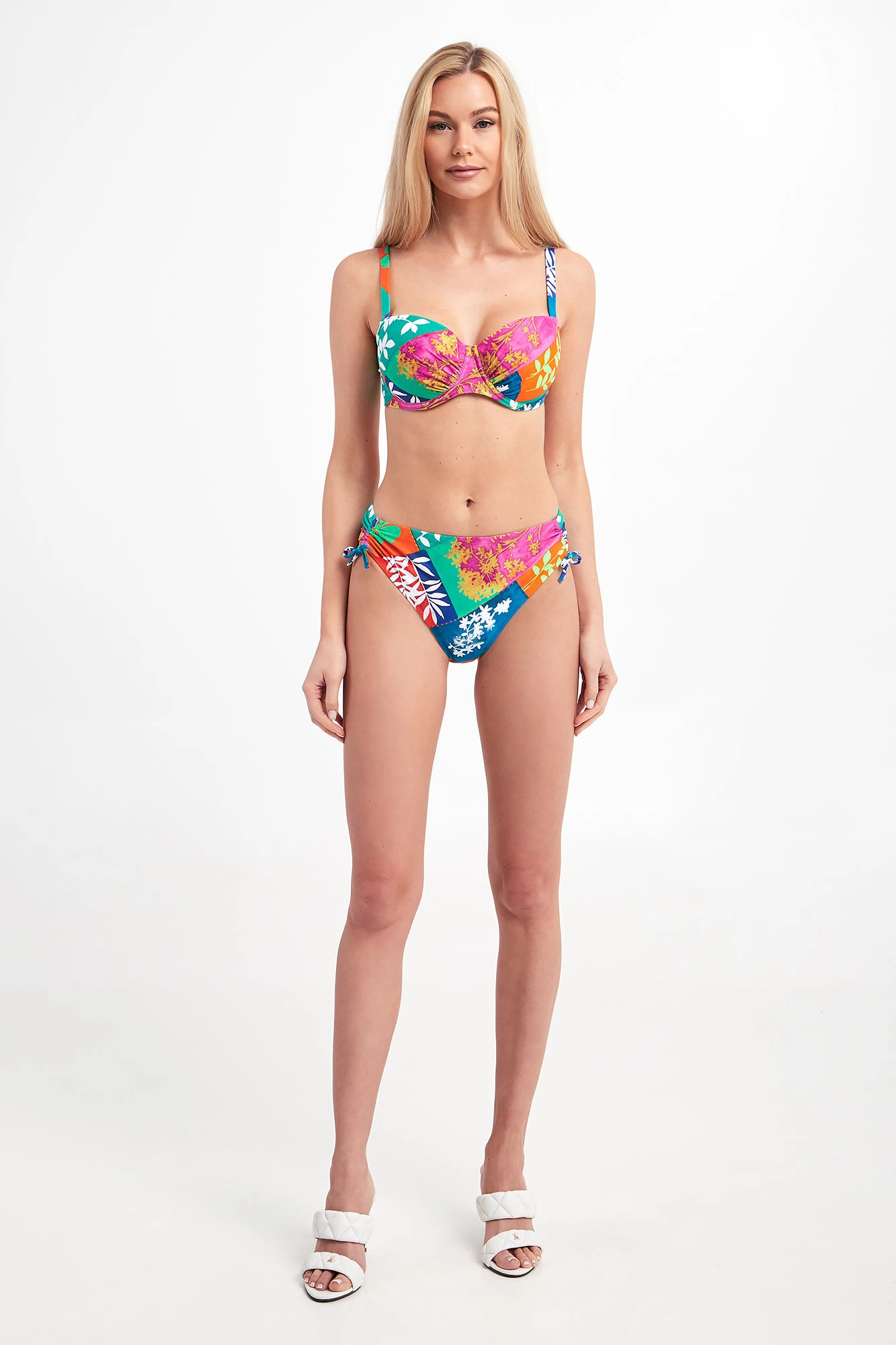 Dwuczęściowy strój kąpielowy marki Roidal. Na całości wielokolorowy wzór z motywem roślinnym. Dół typu figi. Regulowany po bokach za pomocą elastycznego ściągacza regulowanego za pomocą troczków. Góra z usztywnianymi miseczkami. Regulowane ramiączka. Zapinana z tyłu za pomocą metalowego zapięcia.
