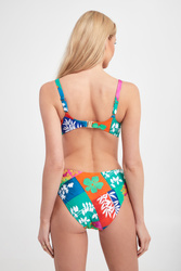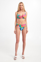Dwuczęściowy strój kąpielowy marki Roidal. Na całości wielokolorowy wzór z motywem roślinnym. Dół typu figi. Regulowany po bokach za pomocą elastycznego ściągacza regulowanego za pomocą troczków. Góra z usztywnianymi miseczkami. Regulowane ramiączka. Zapinana z tyłu za pomocą metalowego zapięcia.
