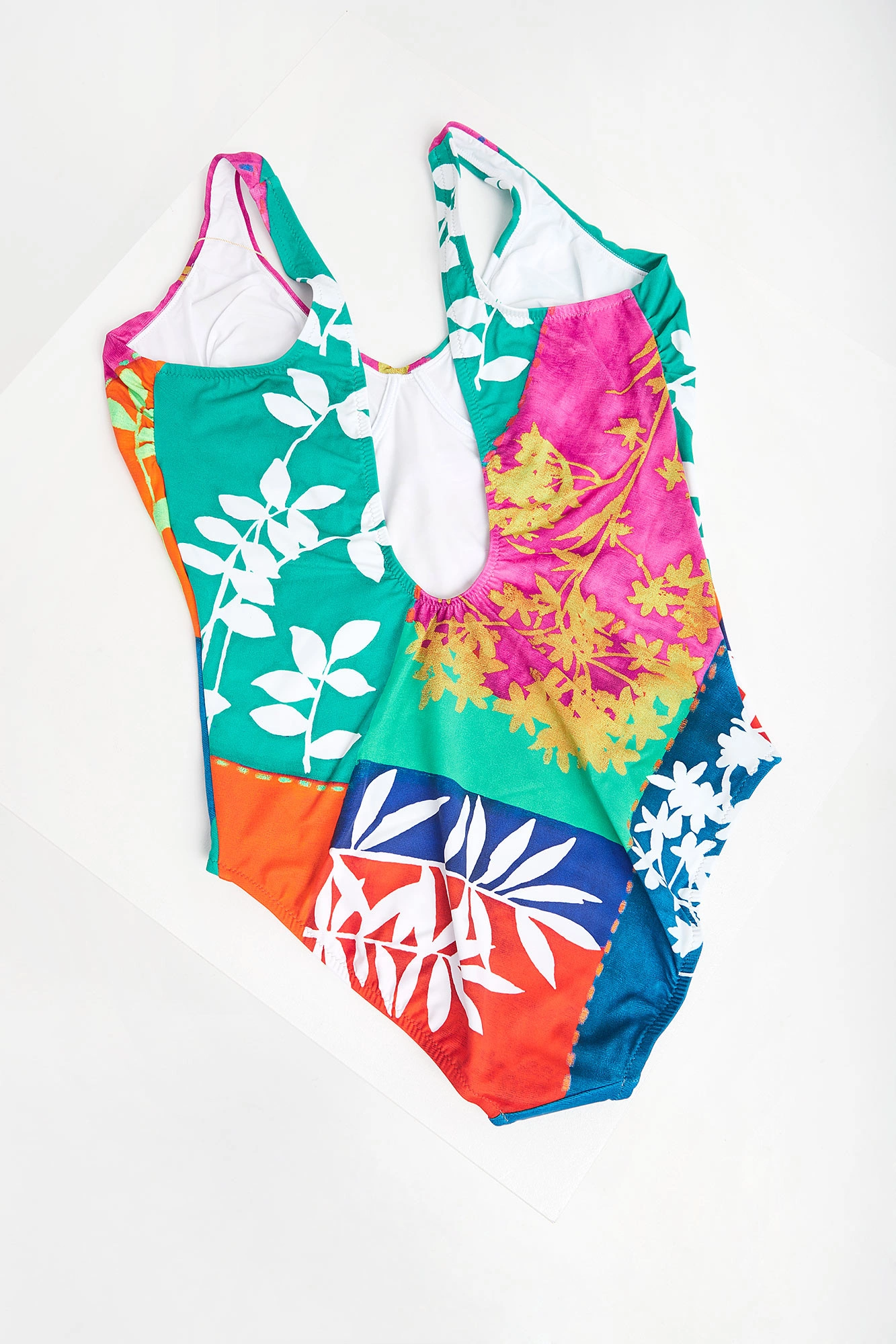 Strój kąpielowy jednoczęściowy marki Roidal. Na całości wielokolorowy wzór z motywem kwiatowym. Pod biustem fiszbiny. Z tyłu głębokie wycięcie. Wykonany z szybkoschnącego, elastycznego materiału.