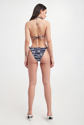 Dwuczęściowy strój kąpielowy marki Max Mara Beachwear w granatowym kolorze. Na całości biały wzór z monogramem marki i marynistycznym motywem. Góra wiązana na szyi i plecach za pomocą troczków. Dół wiązany za pomocą takich samych troczków. Delikatnie usztywniane miseczki. Wykonany z tkaniny z domieszką elastanu.