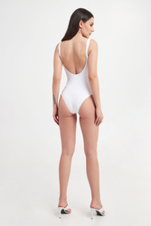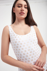 Jednoczęściowy strój kąpielowy marki Max Mara z serii Beachwear w białym kolorze. Dekolt typu o-neck. Na całości nadruk z monogramem marki w złotym kolorze. Wygodny i ponadczasowy.