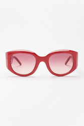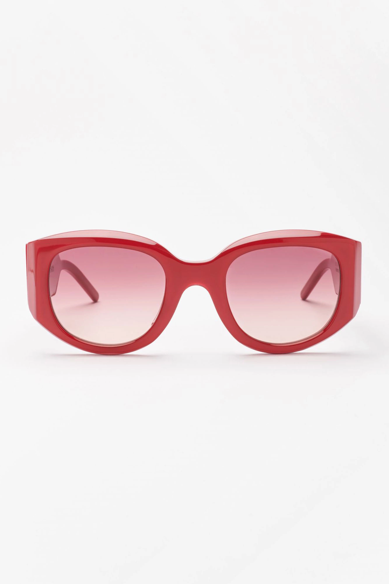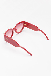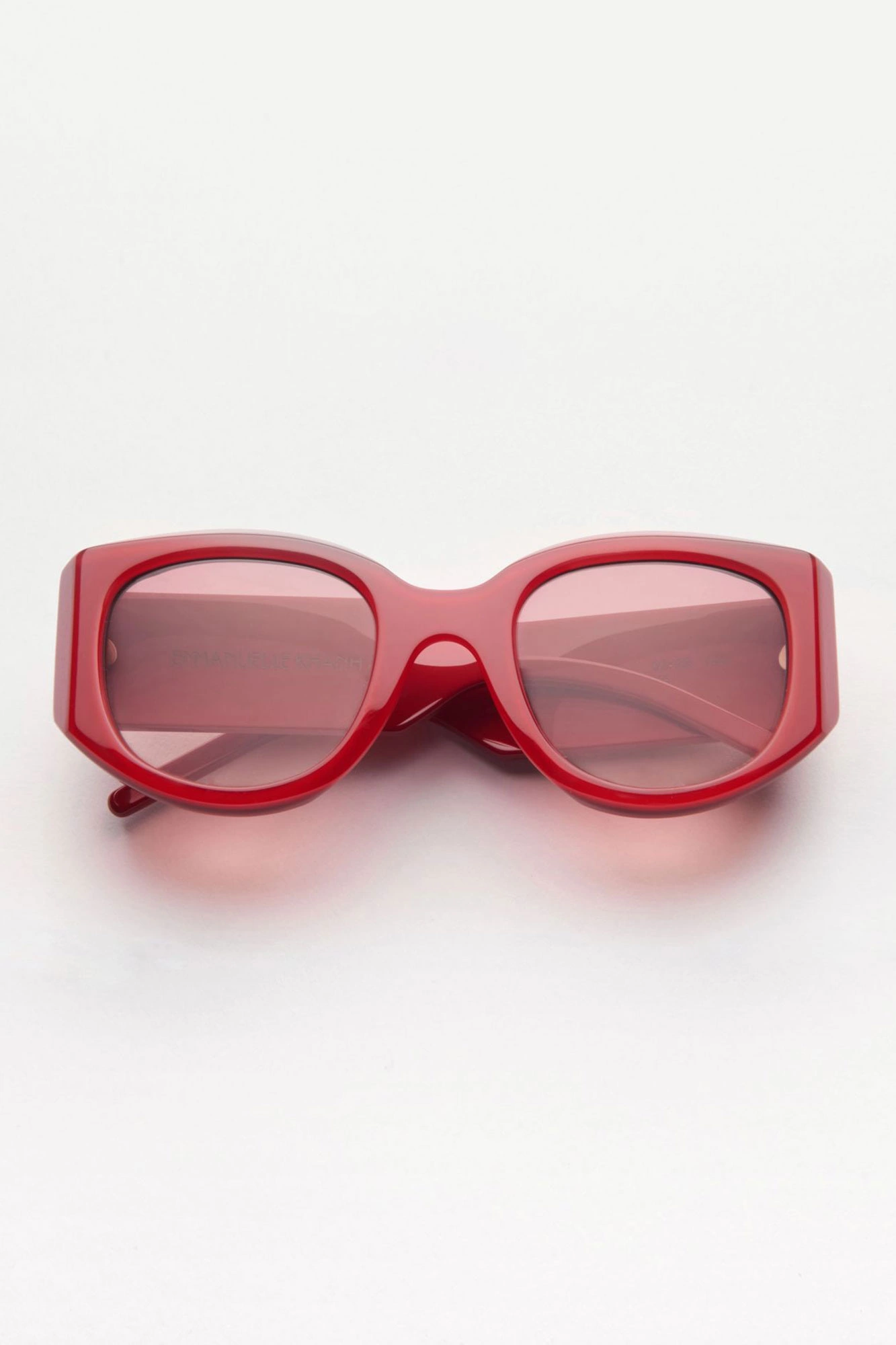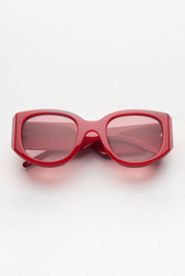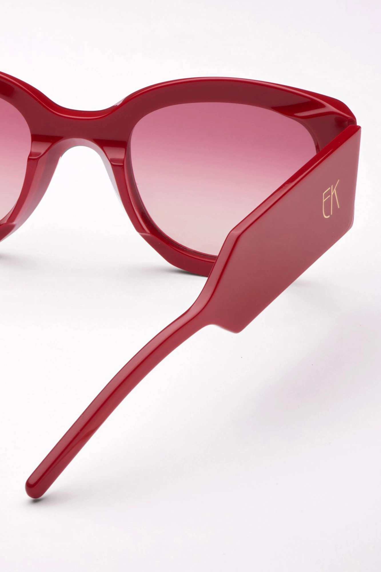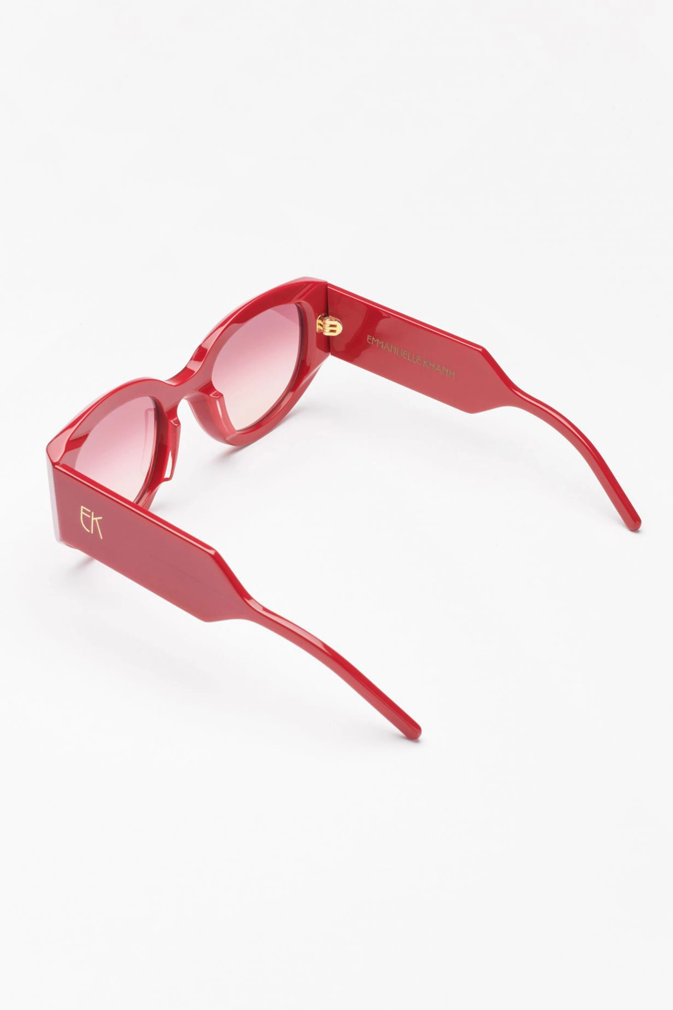 Okulary marki Emmanuelle Khanh w czerwonym kolorze. Całość połyskująca. Po boku aplikacja w złotym kolorze z monogramem marki. Zauszniki wyprofilowane, zwieńczone nadrukiem nazwy marki. Sygnowane szkła w różowym kolorze. Owalne oprawki.