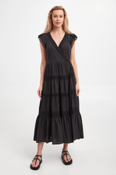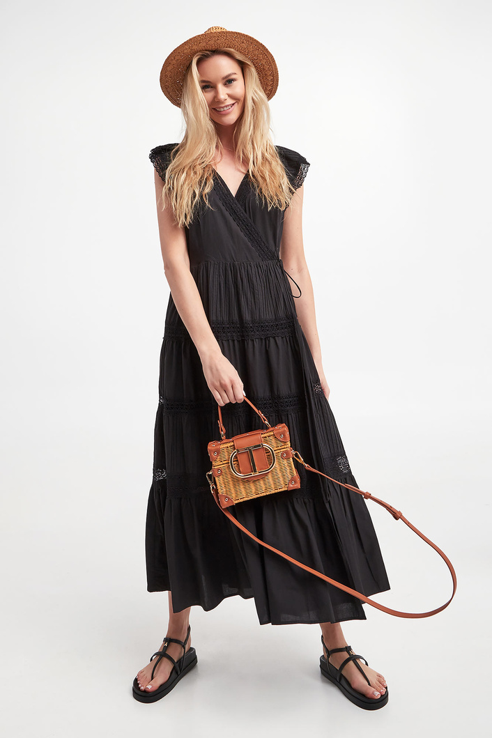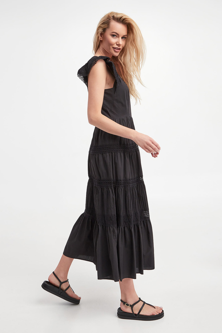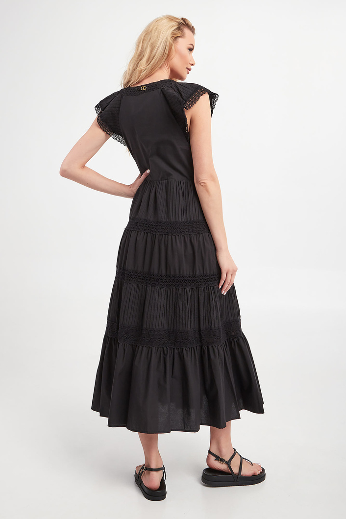 Sukienka marki Twinset w czarnym kolorze. Fason typu regular fit o długości midi. Dekolt typu v-neck. Na całości ozdobne hafty i koronki. Dół rozkloszowany, plisowany, wykończony falbanami. Z tyłu metalowa aplikacja w kształcie logo marki z tłoczeniem. Zapinana za pomocą niewielkiego guzika i wiązana w talii. Wykonana z czystej bawełny.