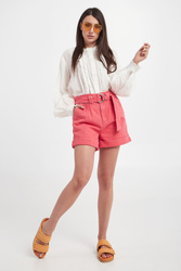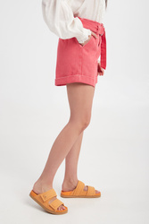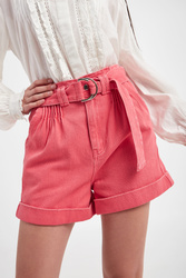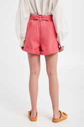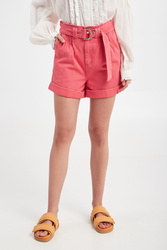 Szorty jeansowe marki Twinset w malinowym kolorze. Fason typu paperbag. W talii marszczenia. Zapinane za pomocą zamka i srebrnej napy. Dodatkowo pasek ze srebrną klamrą. Dwie boczne, wpuszczane kieszenie. Nogawki zakończone podwijaną lamówką. Wykonane z czystej bawełny.